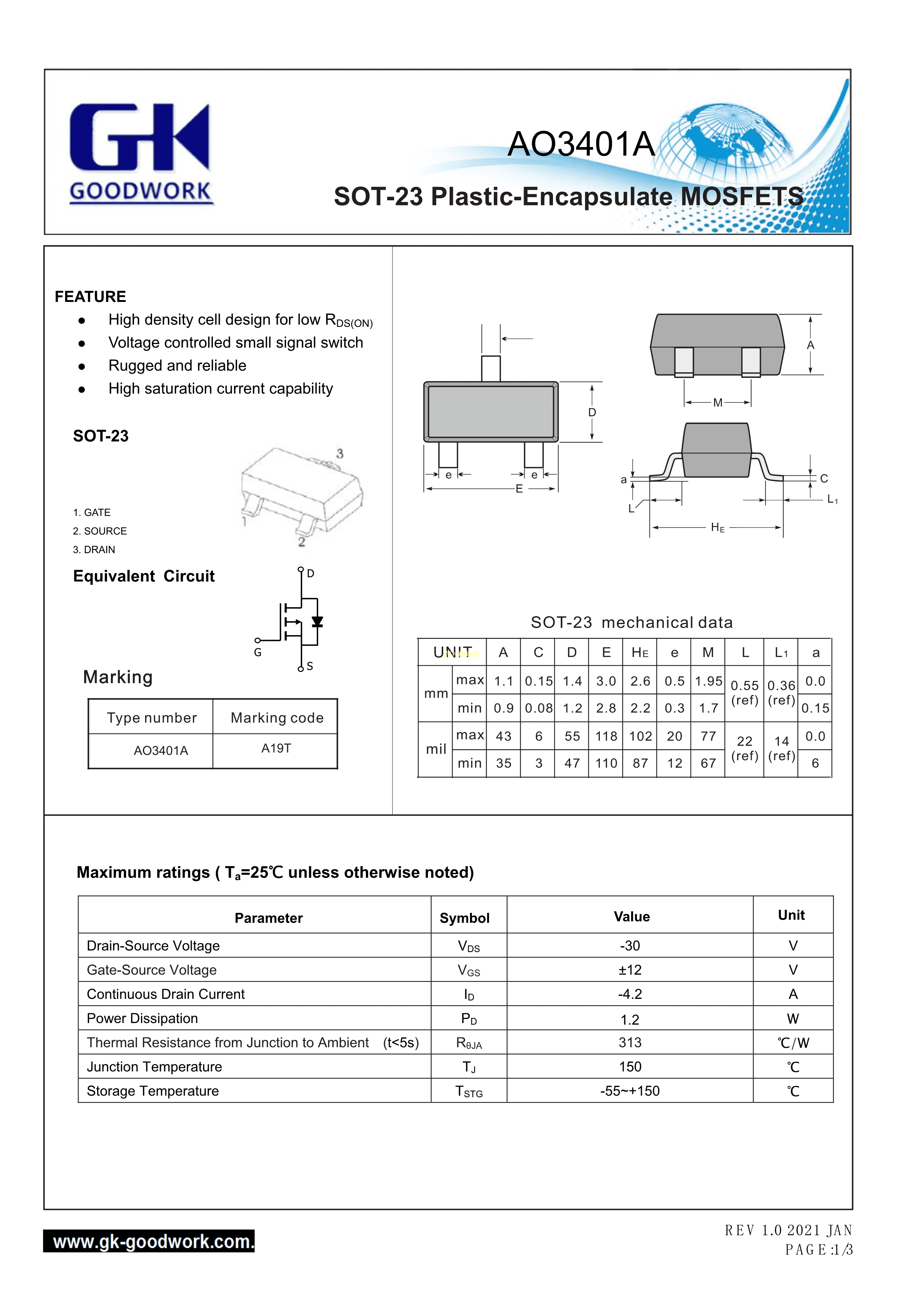 AO3401A数据手册SOT-23封装GOODWORK(固得沃克)PDF规格书,中英文下载