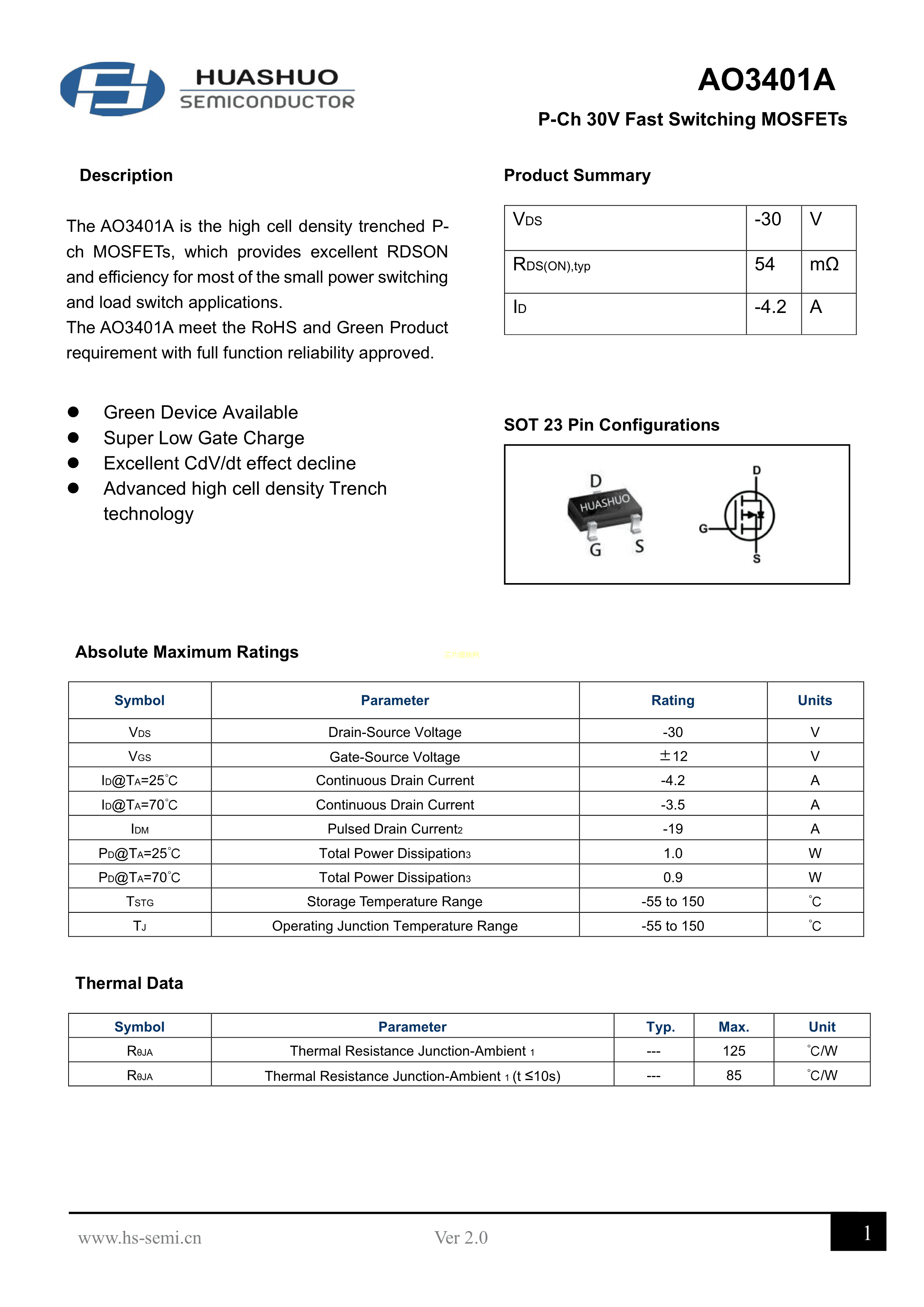 AO3401A数据手册SOT-23封装HUASHUO(华朔)PDF规格书,中英文下载