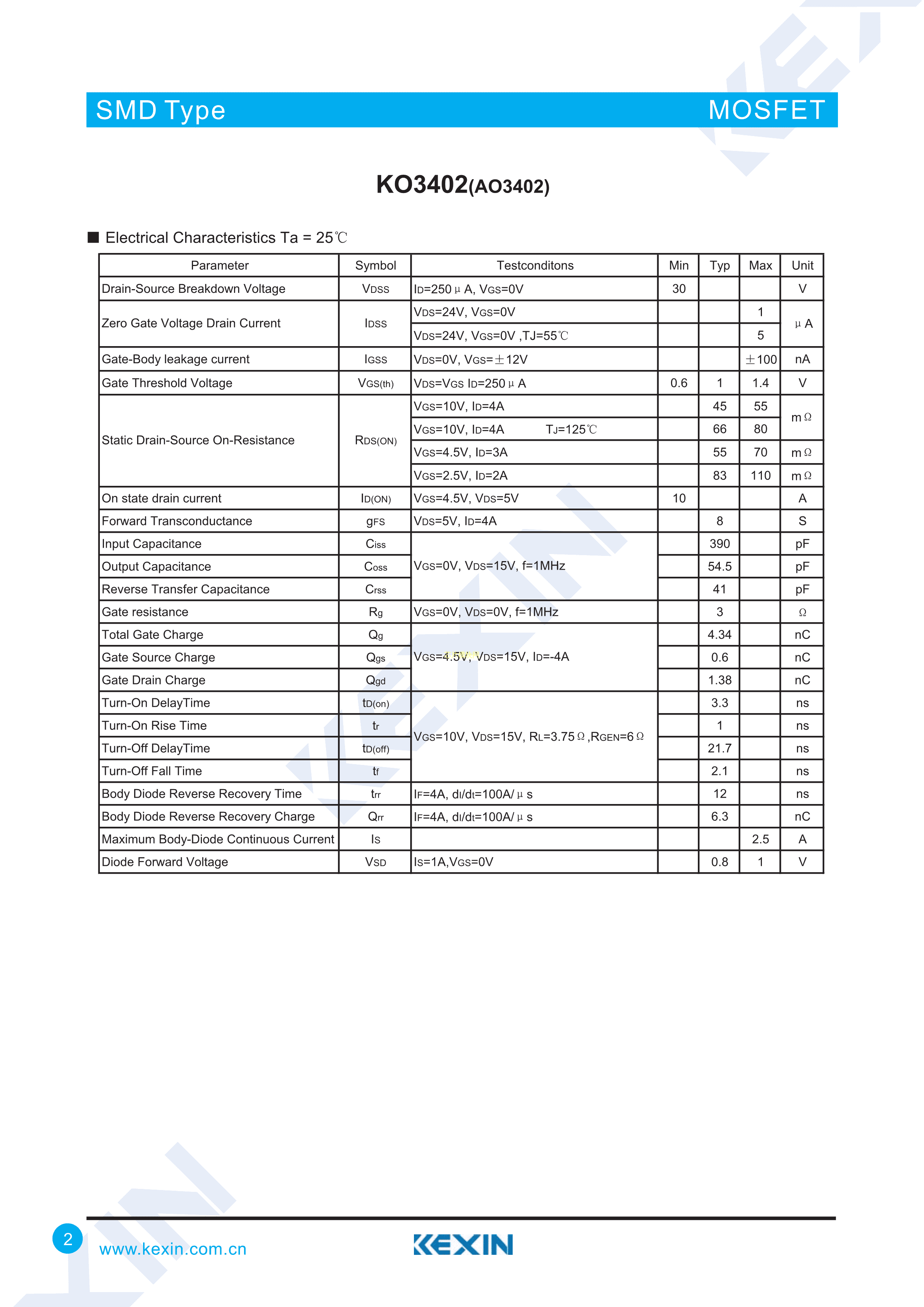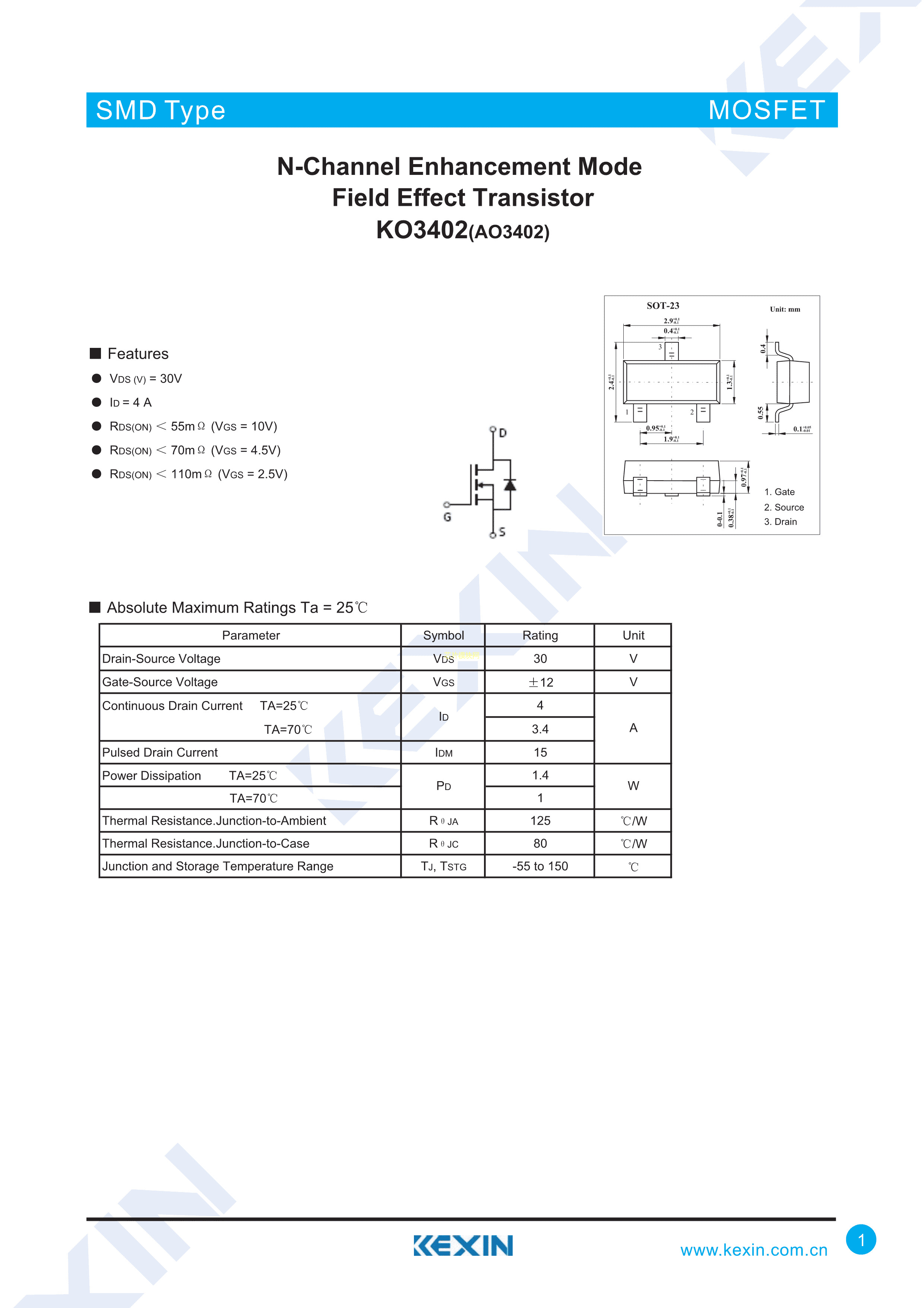 AO3402数据手册SOT-23封装KEXIN(科信)PDF规格书,中英文下载