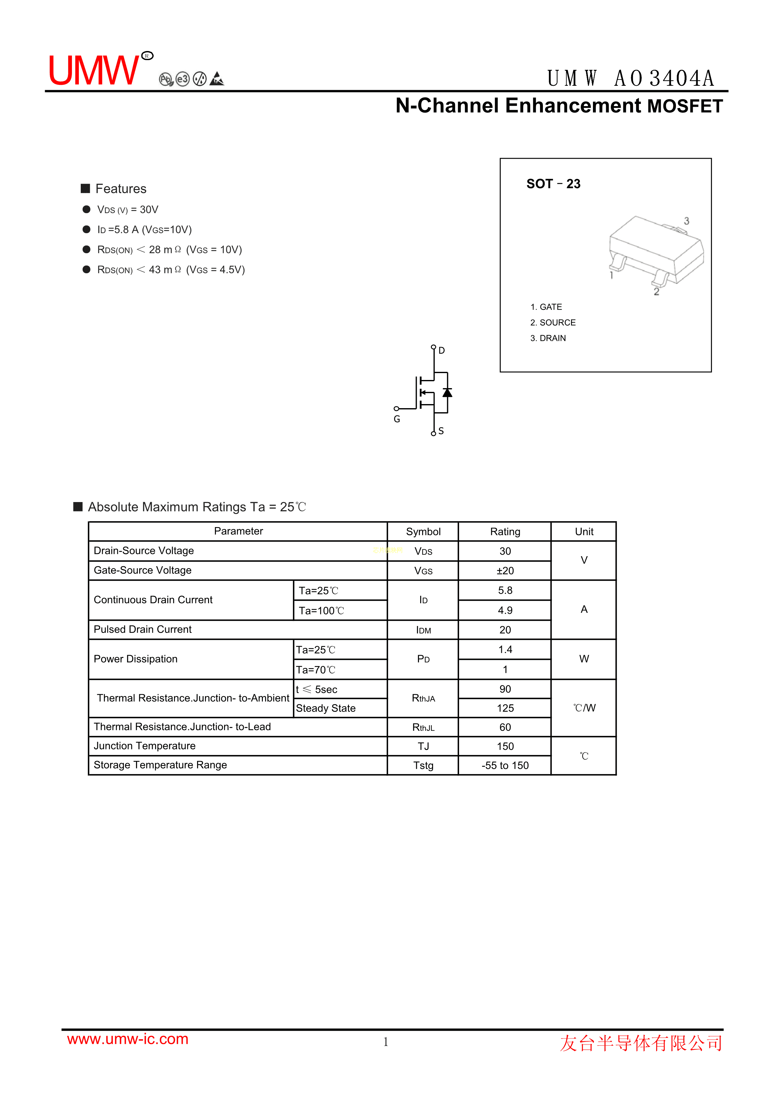 AO3404A数据手册SOT-23封装UMW(友台半导体)PDF规格书,中英文下载
