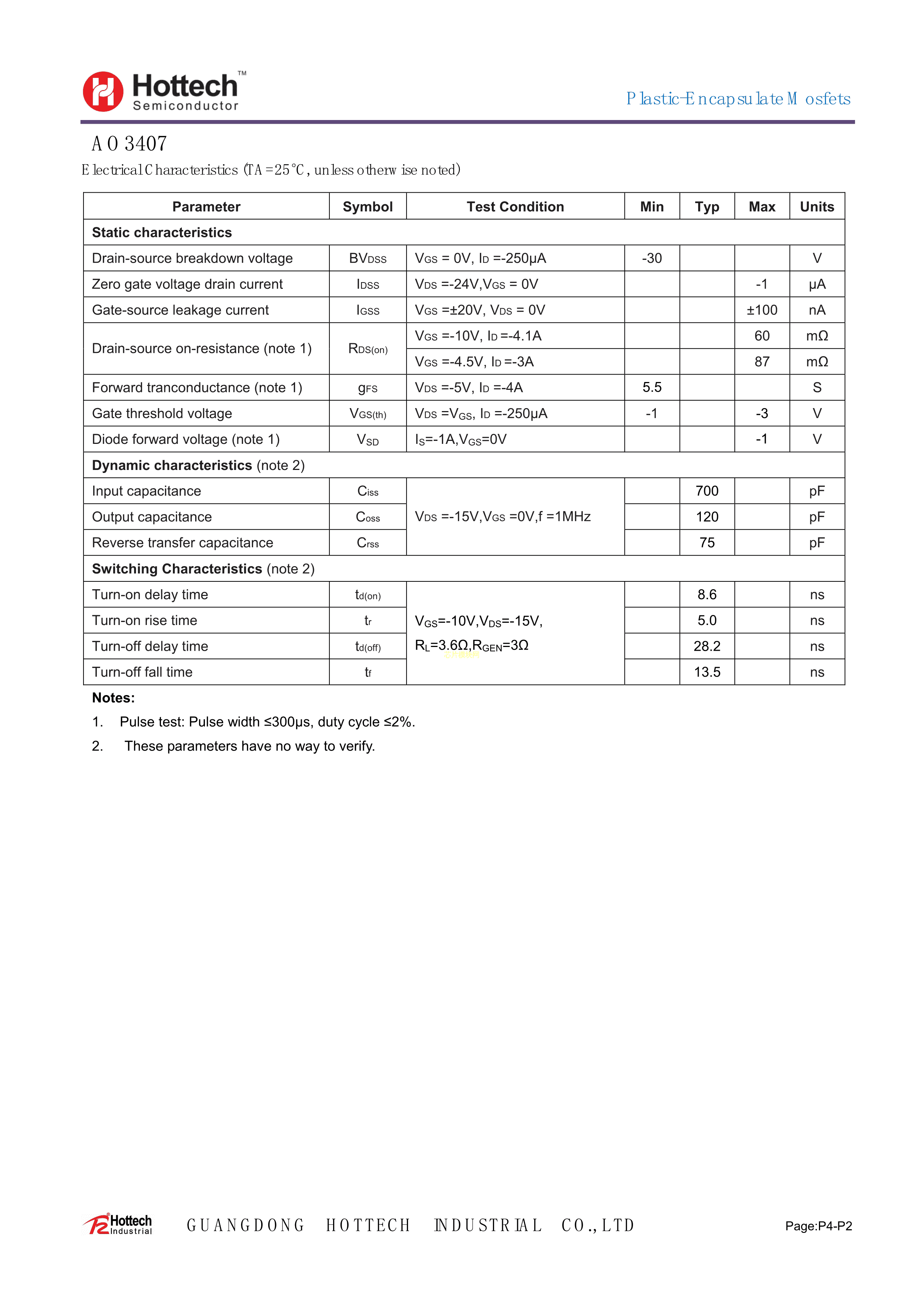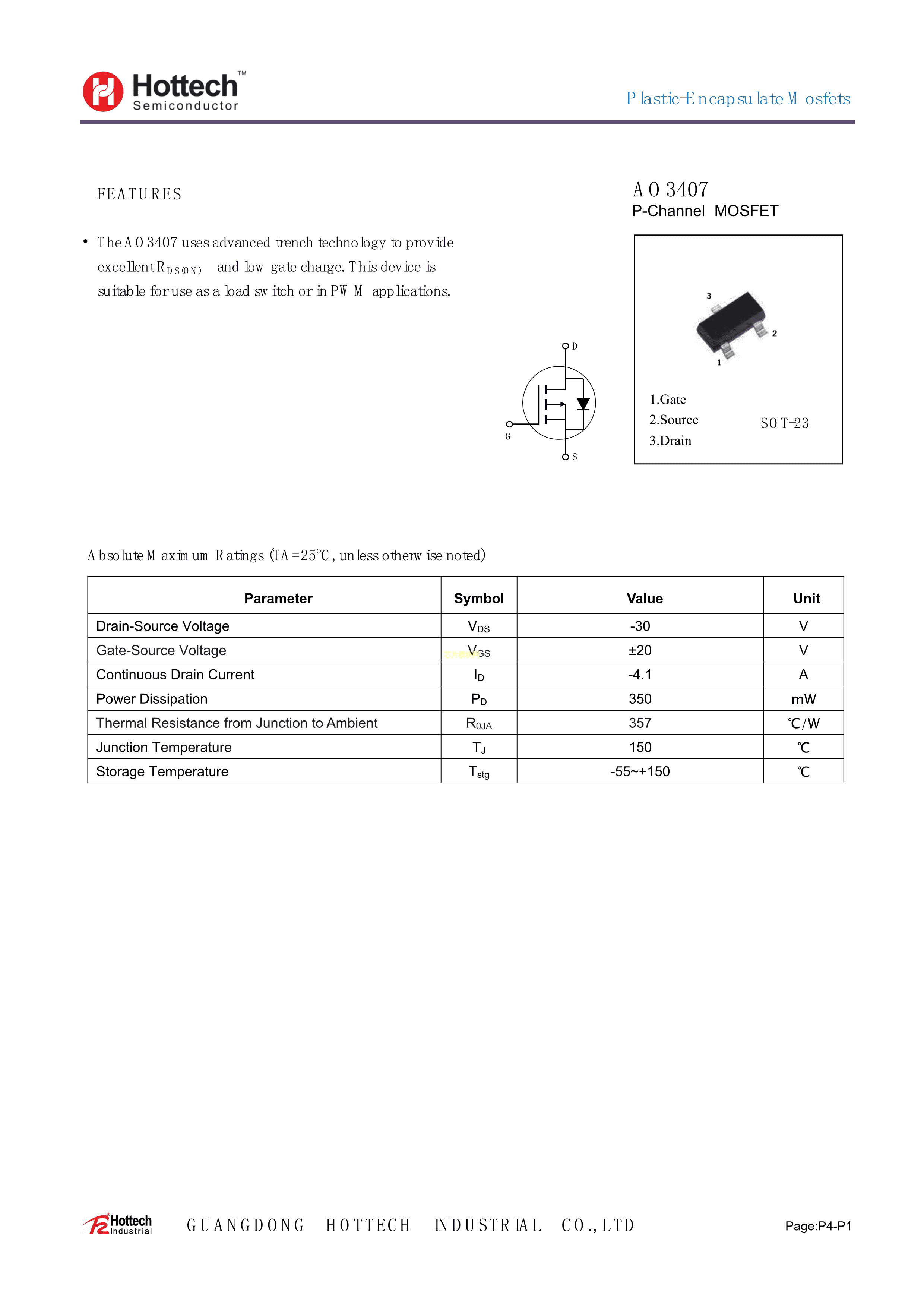 AO3407数据手册SOT-23(SOT-23-3)封装Hottech(合科泰)PDF规格书,中英文