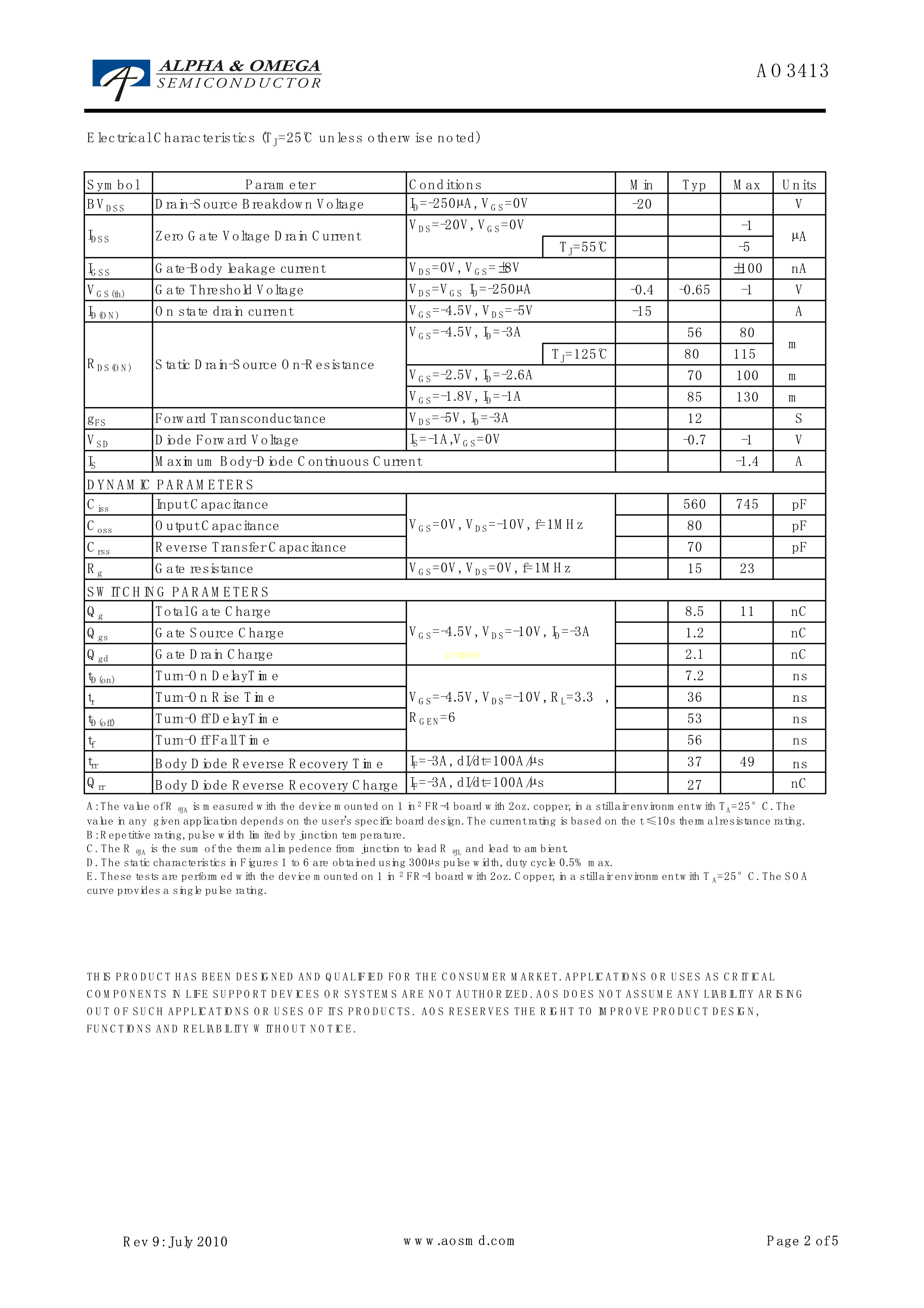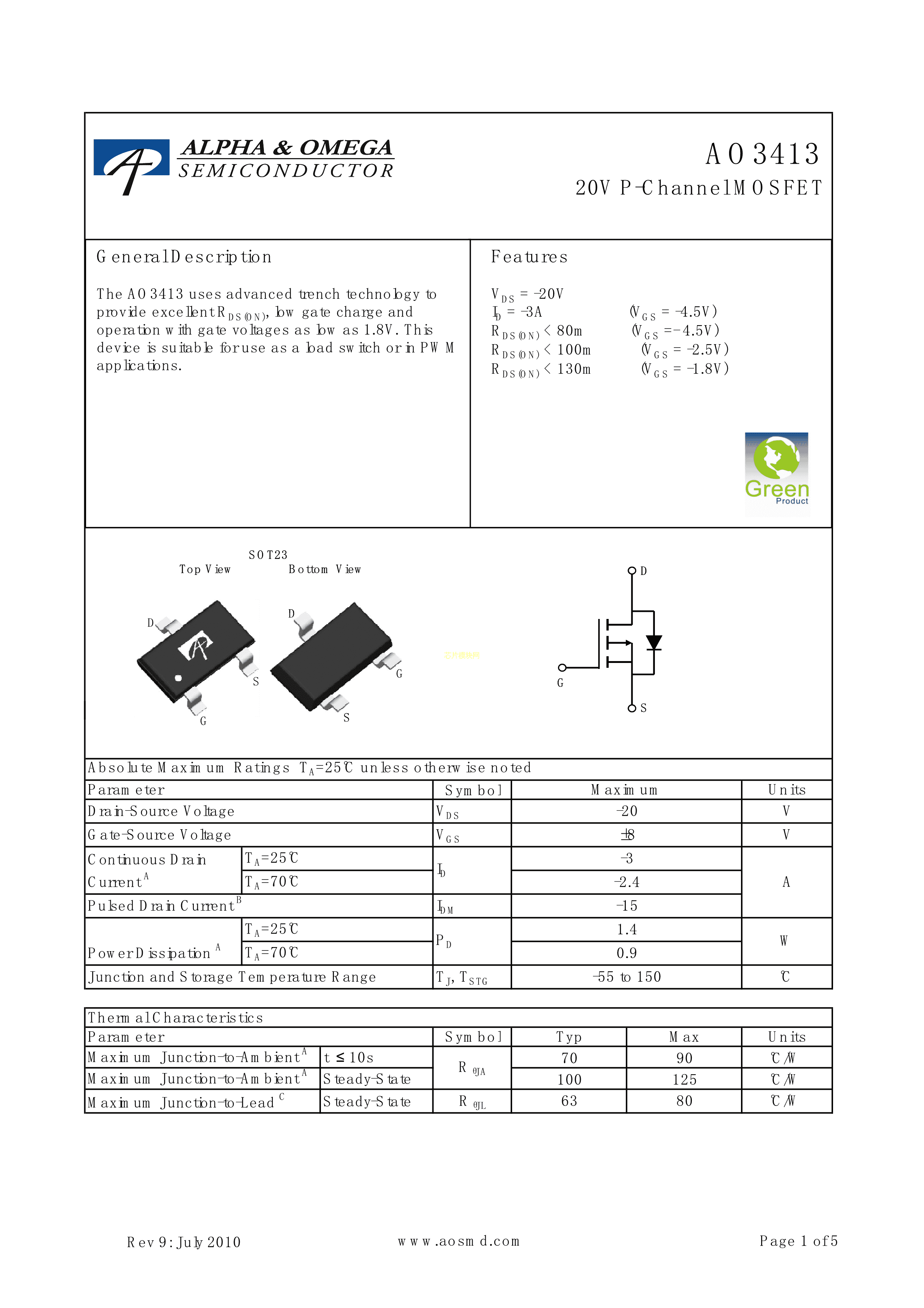 AO3413数据手册SOT-23-3L封装AOSPDF规格书,中英文下载