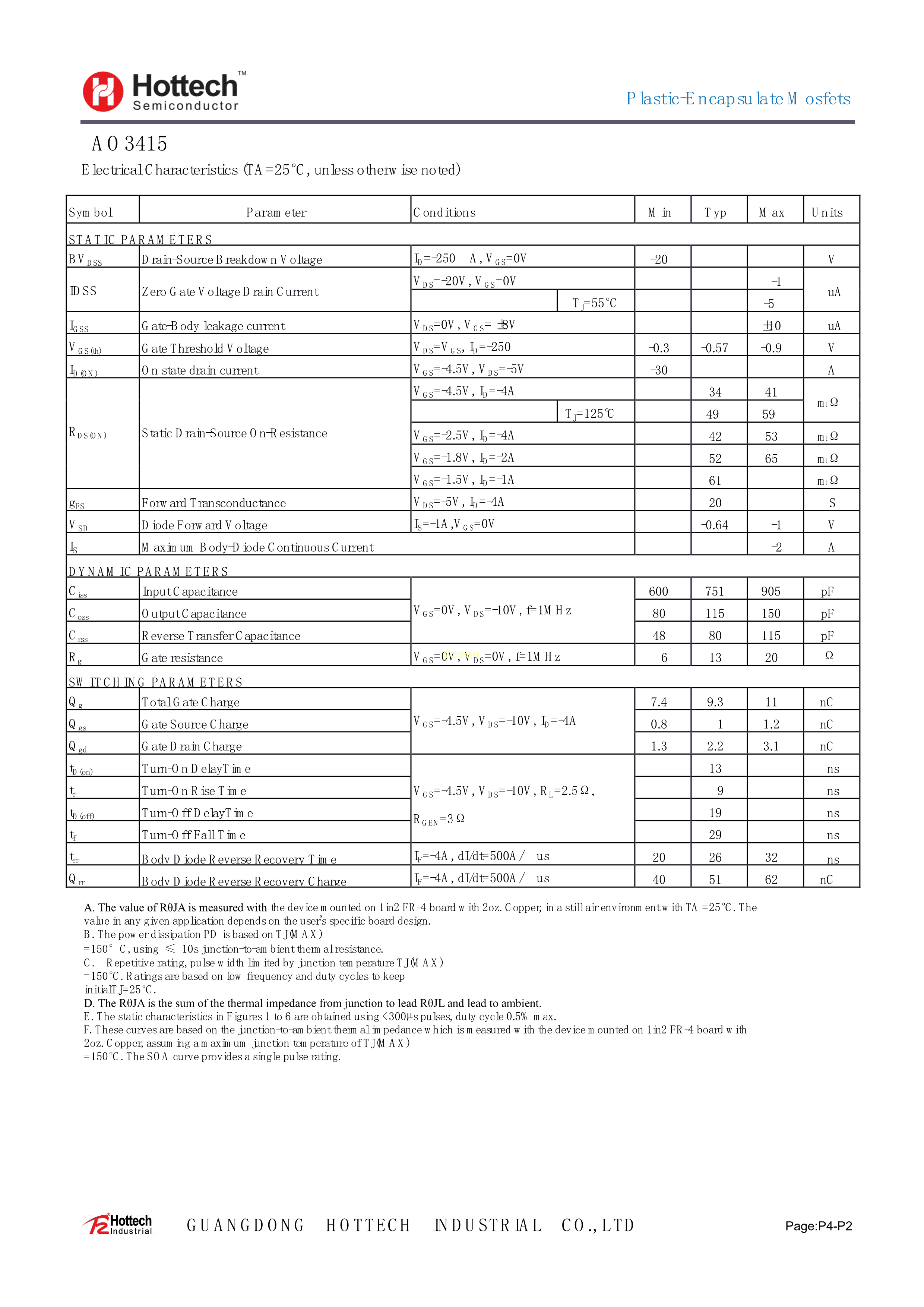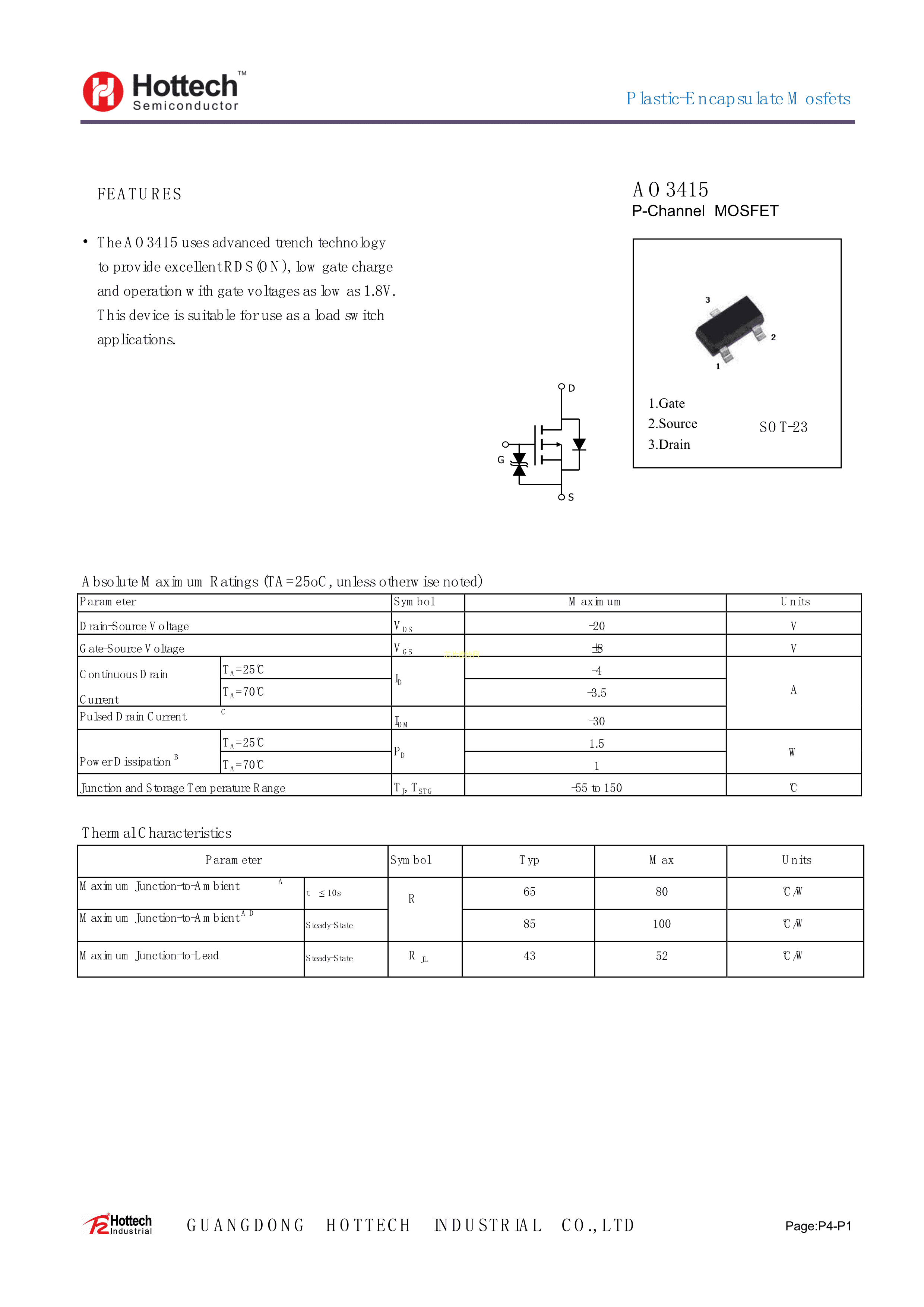 AO3415数据手册SOT-23(SOT-23-3)封装Hottech(合科泰)PDF规格书,中英文