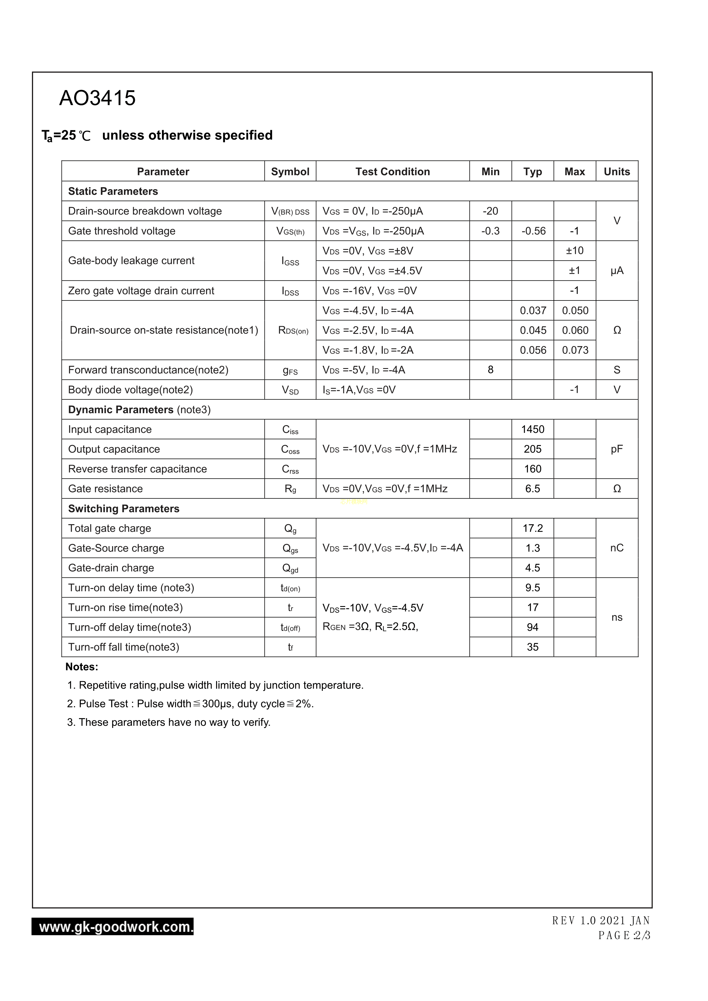 AO3415数据手册SOT-23封装GOODWORK(固得沃克)PDF规格书,中英文下载