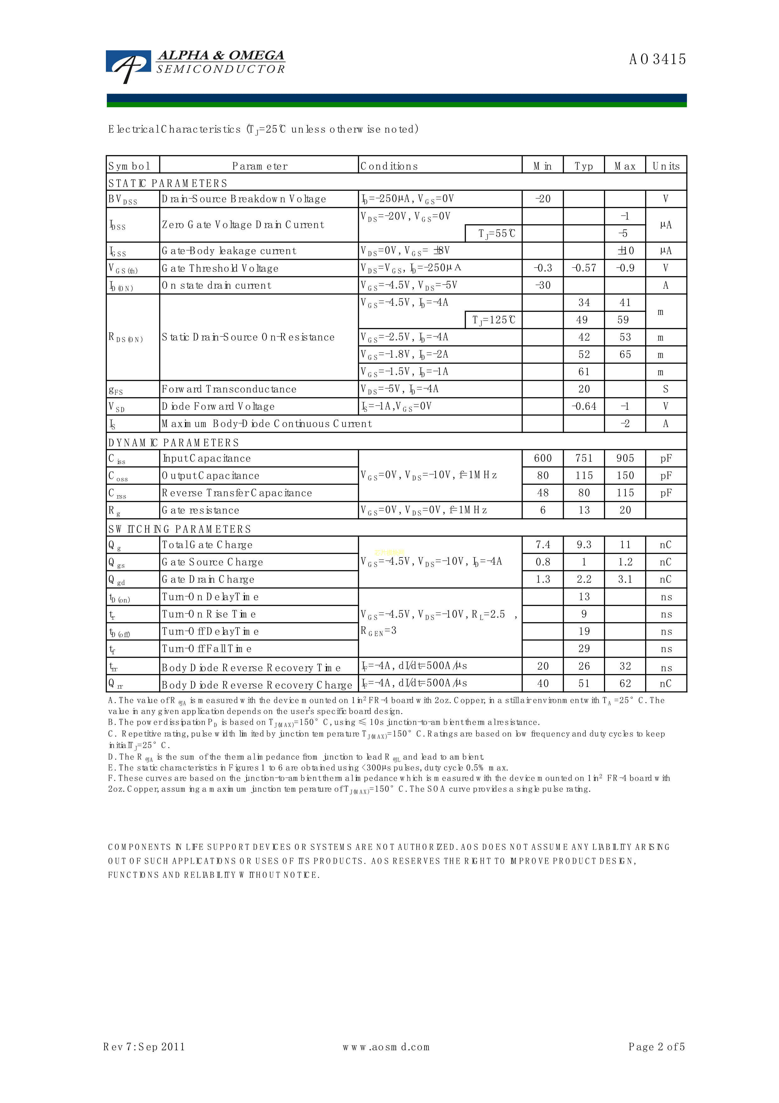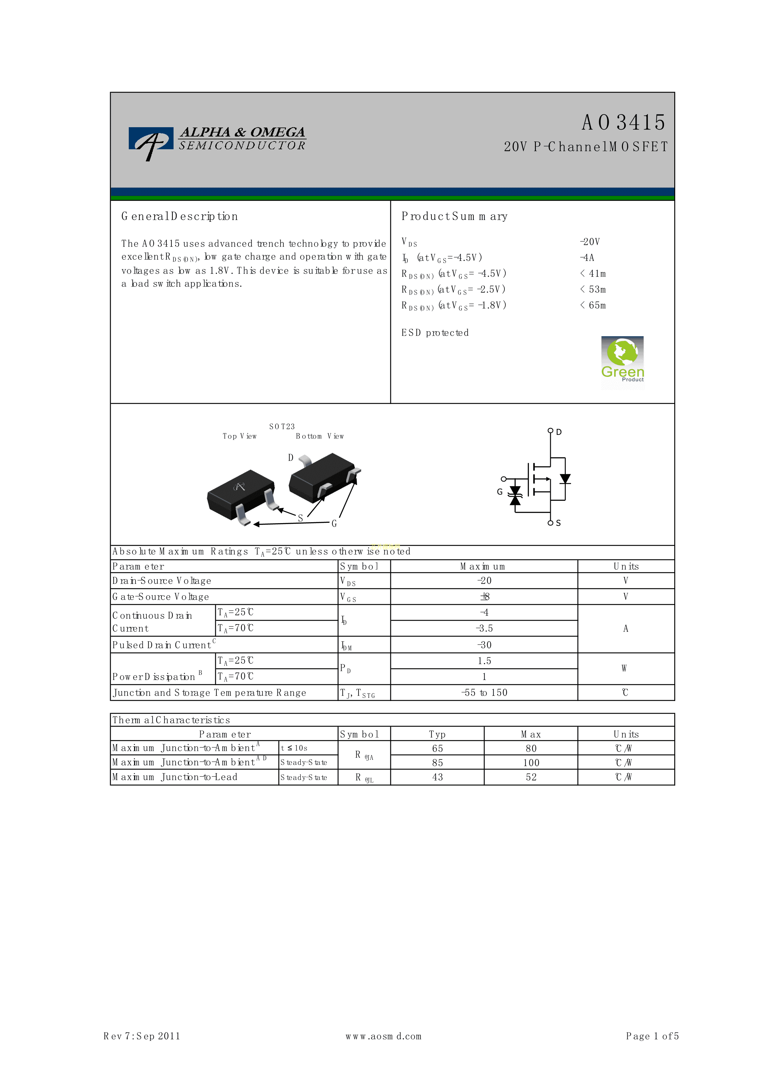 AO3415数据手册SOT-23-3L封装AOSPDF规格书,中英文下载