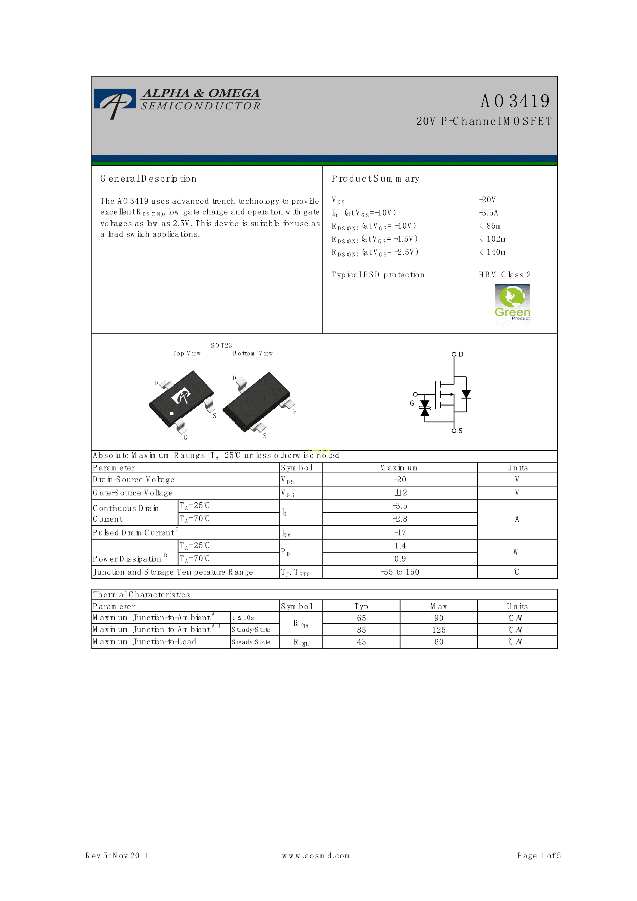AO3419数据手册SOT-23-3L封装AOSPDF规格书,中英文下载