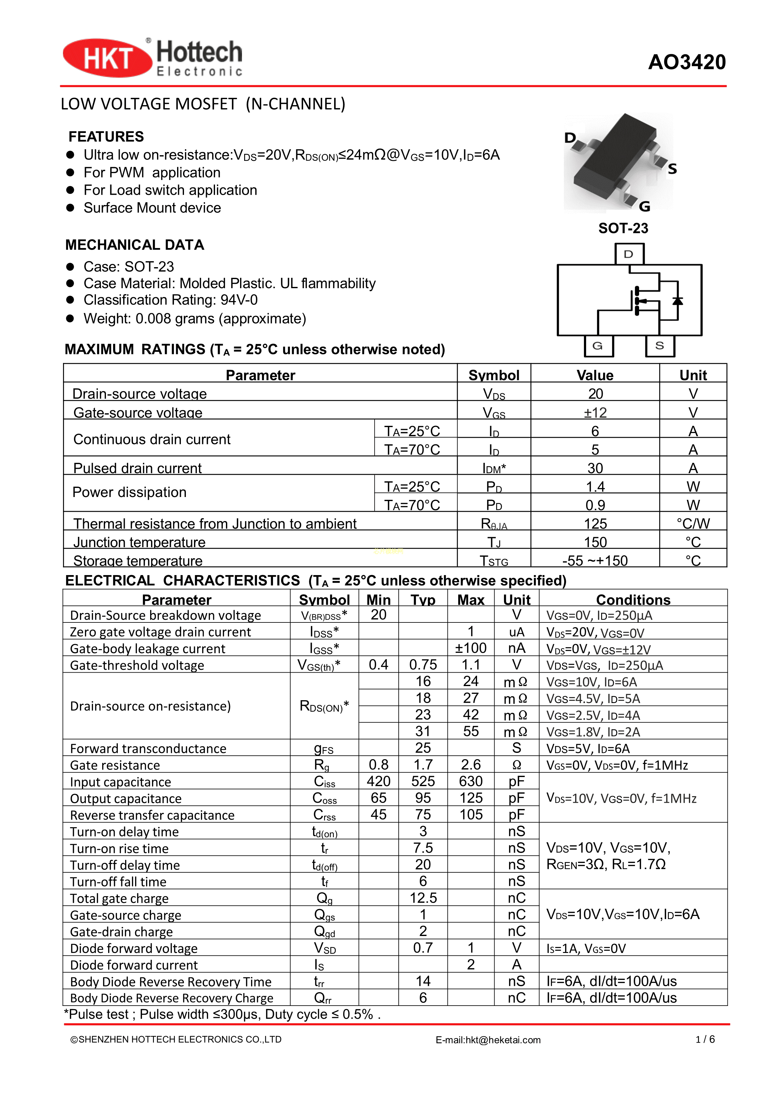AO3420数据手册SOT-23(SOT-23-3)封装Hottech(合科泰)PDF规格书,中英文