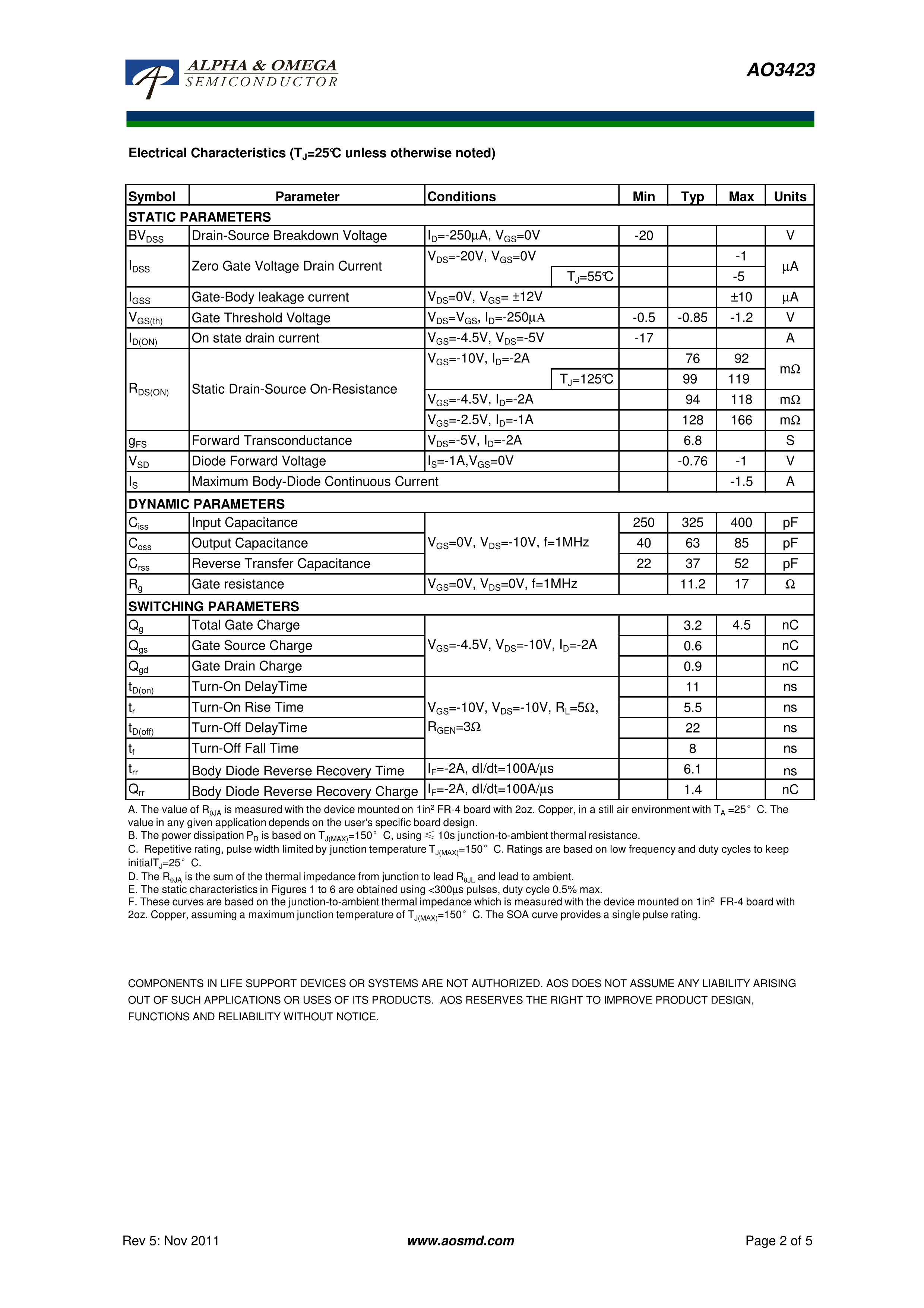 AO3423数据手册SOT-23-3L封装AOSPDF规格书,中英文下载