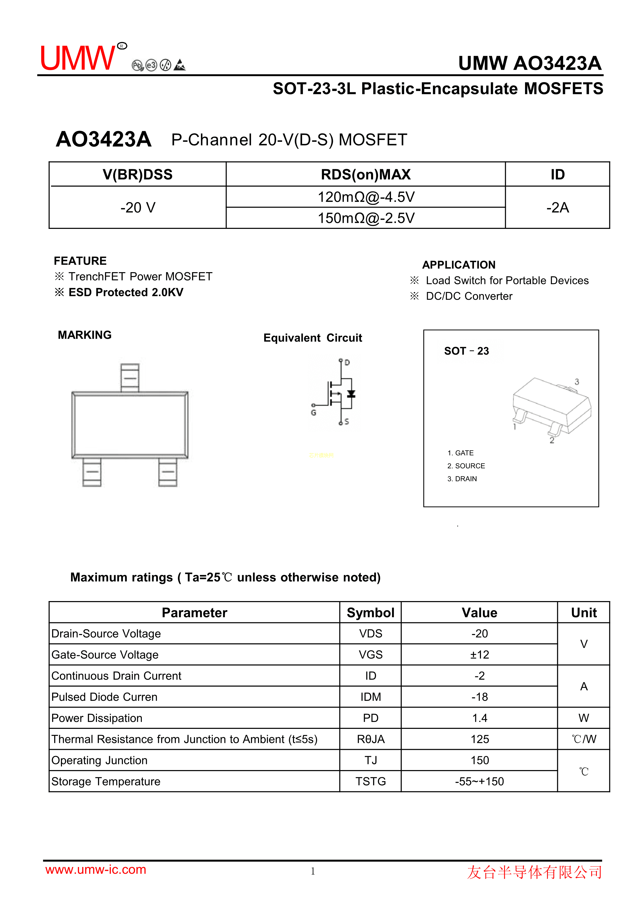 AO3423A数据手册SOT-23封装UMW(友台半导体)PDF规格书,中英文下载