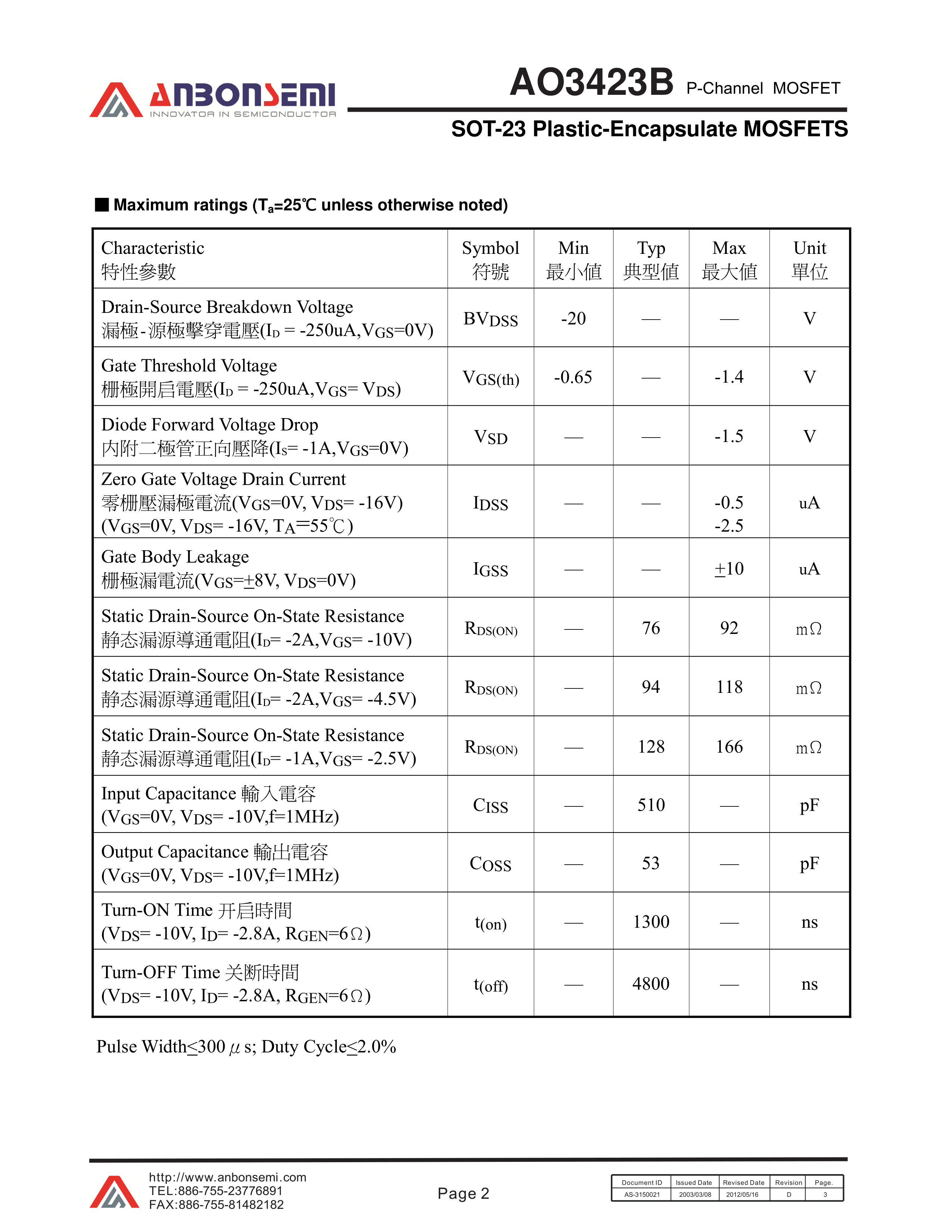 AO3423B数据手册SOT-23(SOT-23-3)封装FMS(台湾美丽微)PDF规格书,中英文下