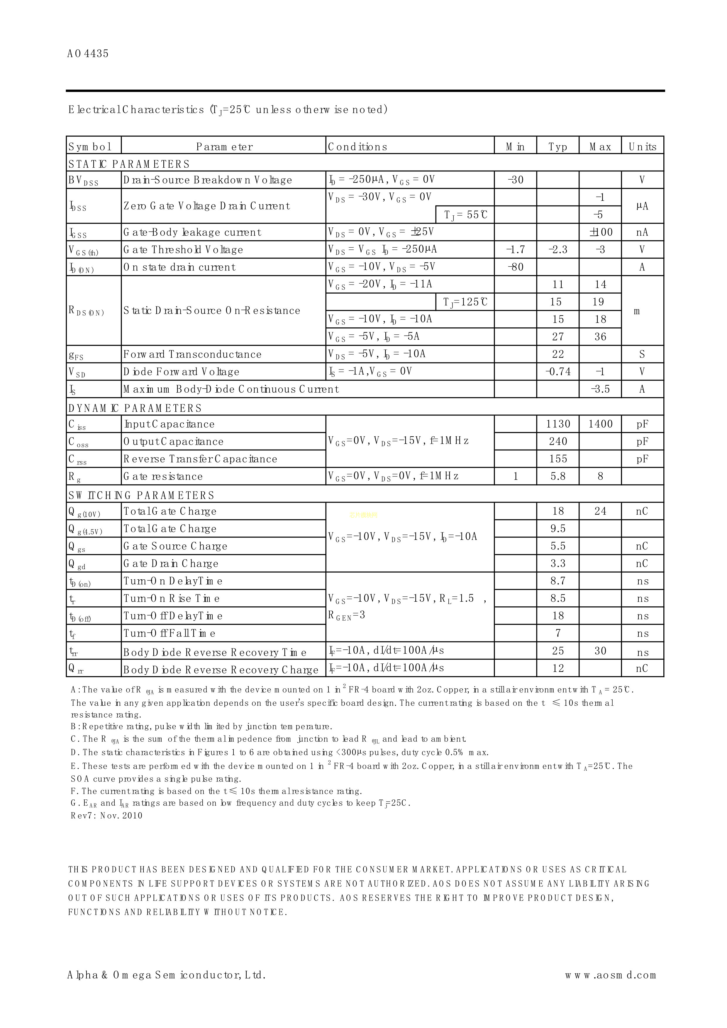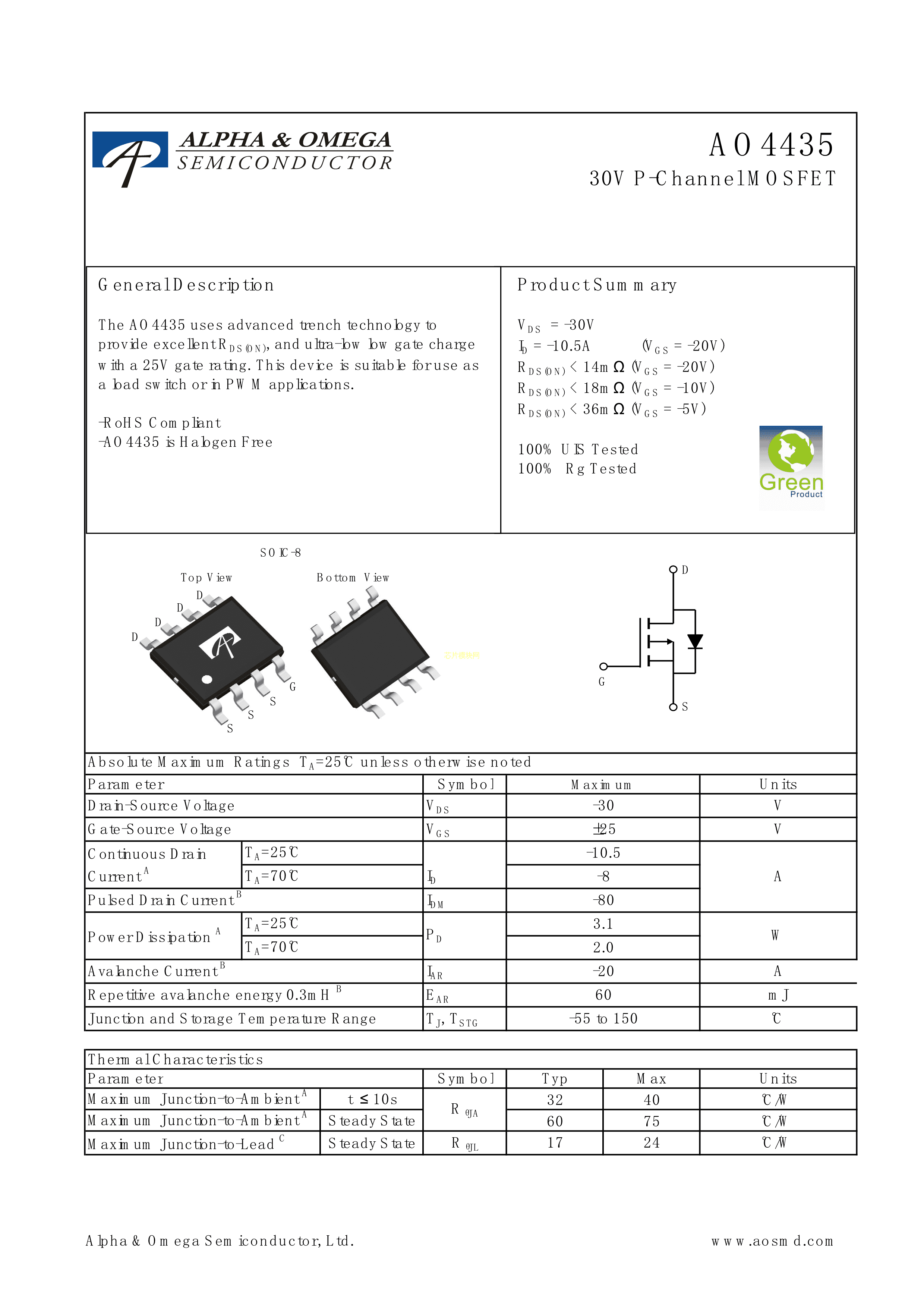 AO4435数据手册SOIC-8_150mil封装AOSPDF规格书,中英文下载