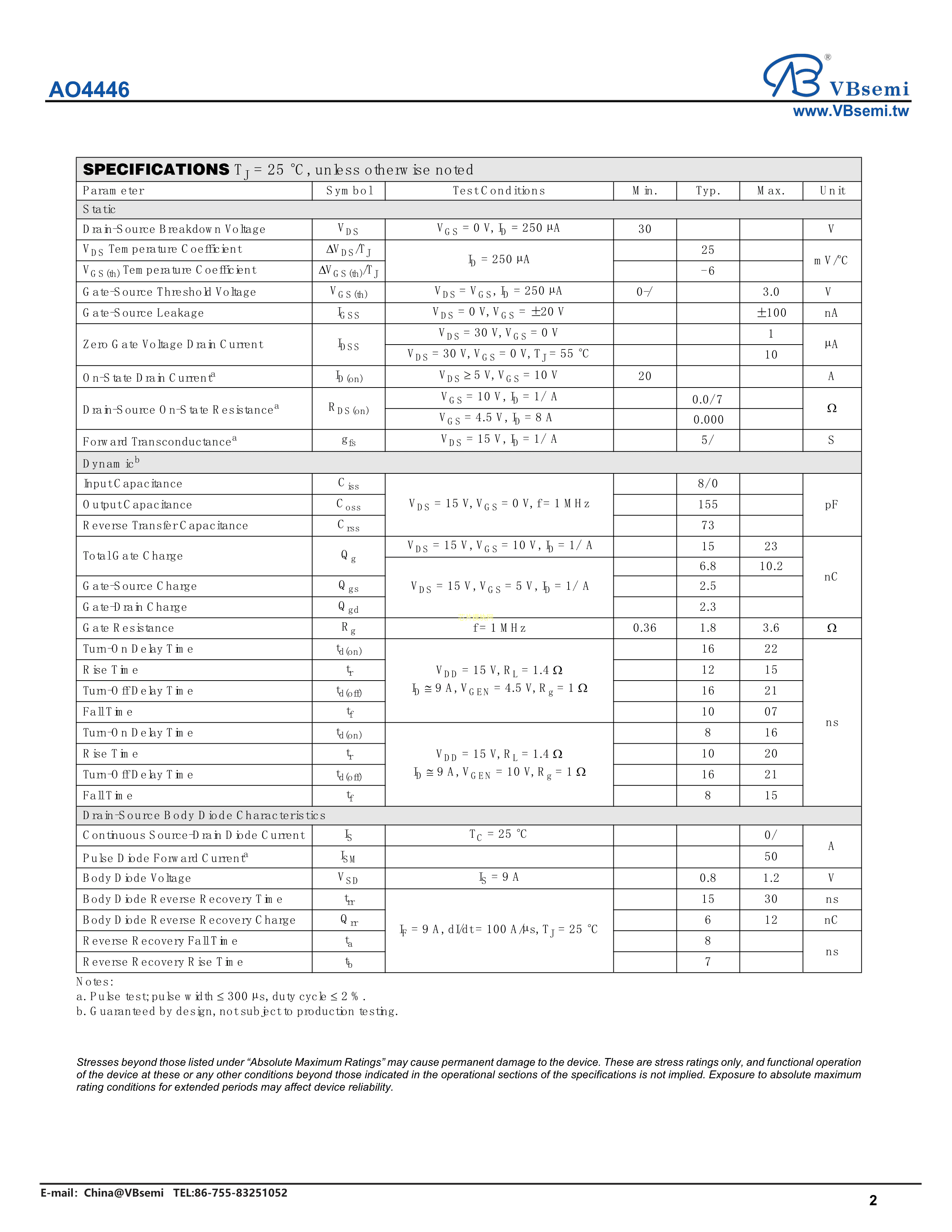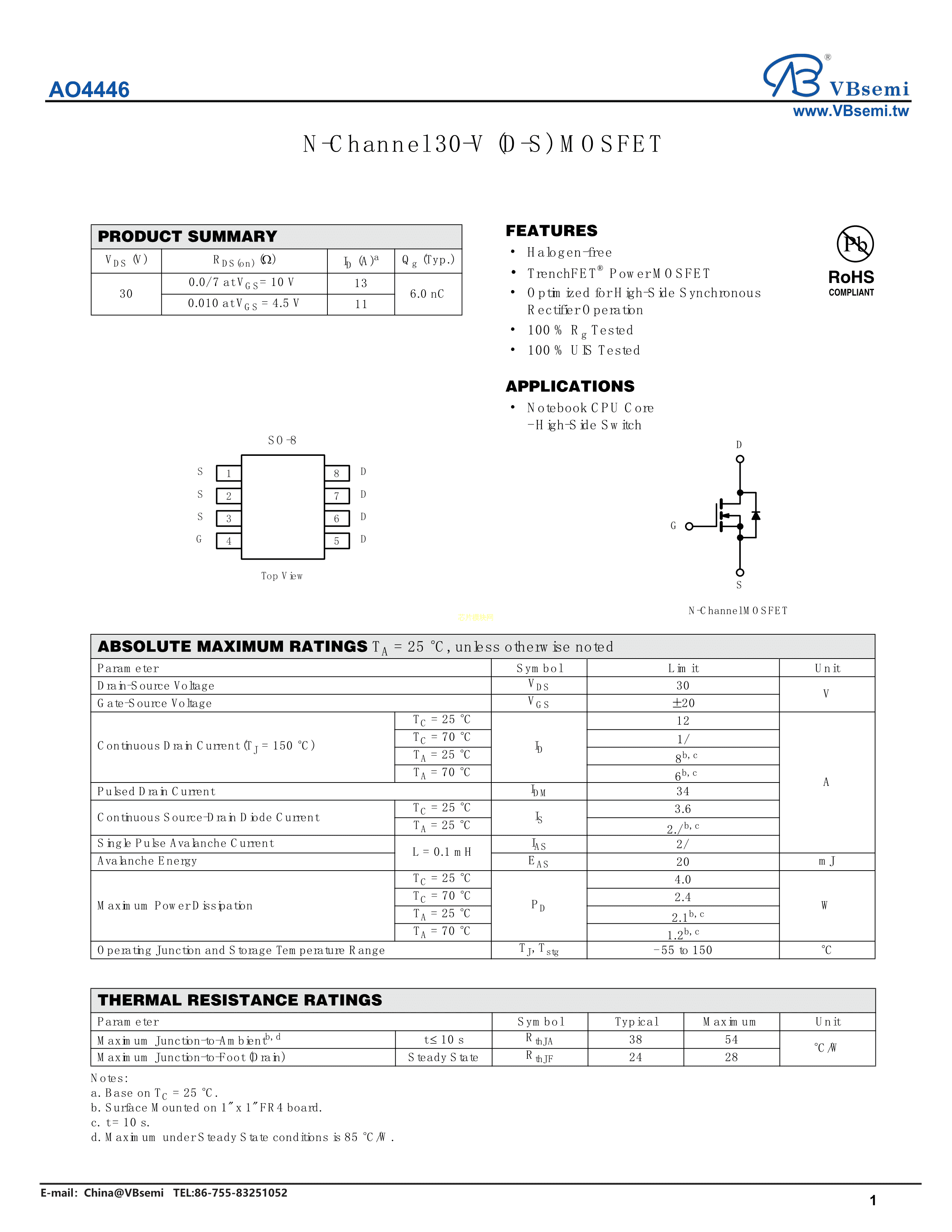 AO4446数据手册SO-8封装VBsemi(台湾微碧)PDF规格书,中英文下载