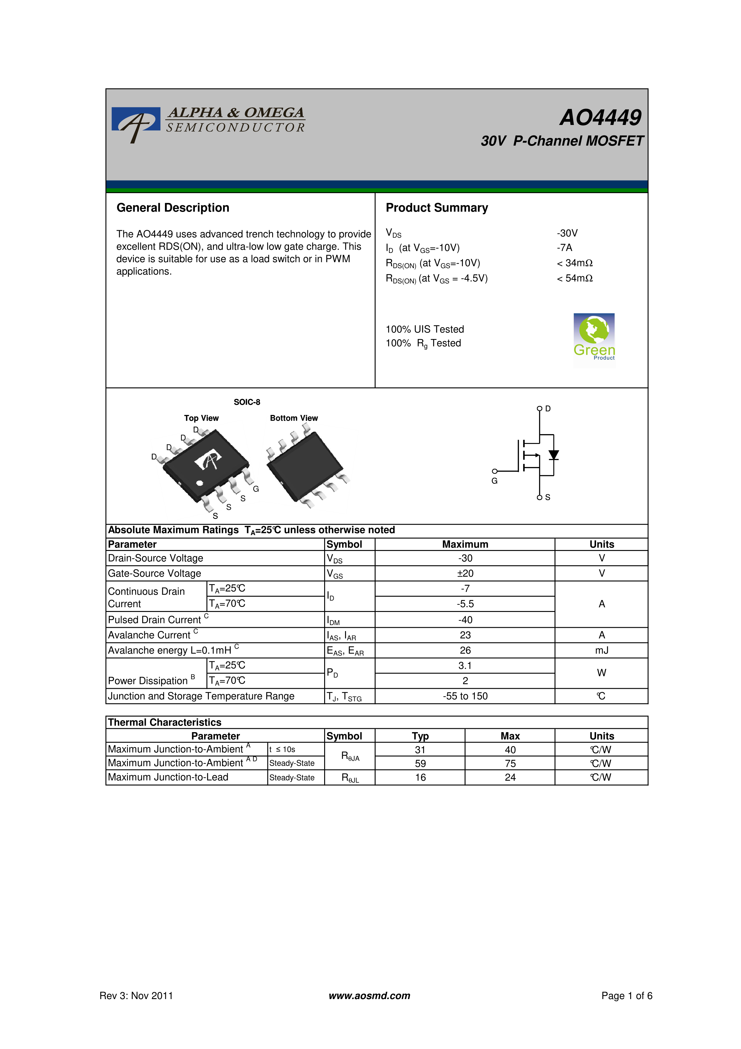 AO4449数据手册SOP-8_150mil封装AOSPDF规格书,中英文下载