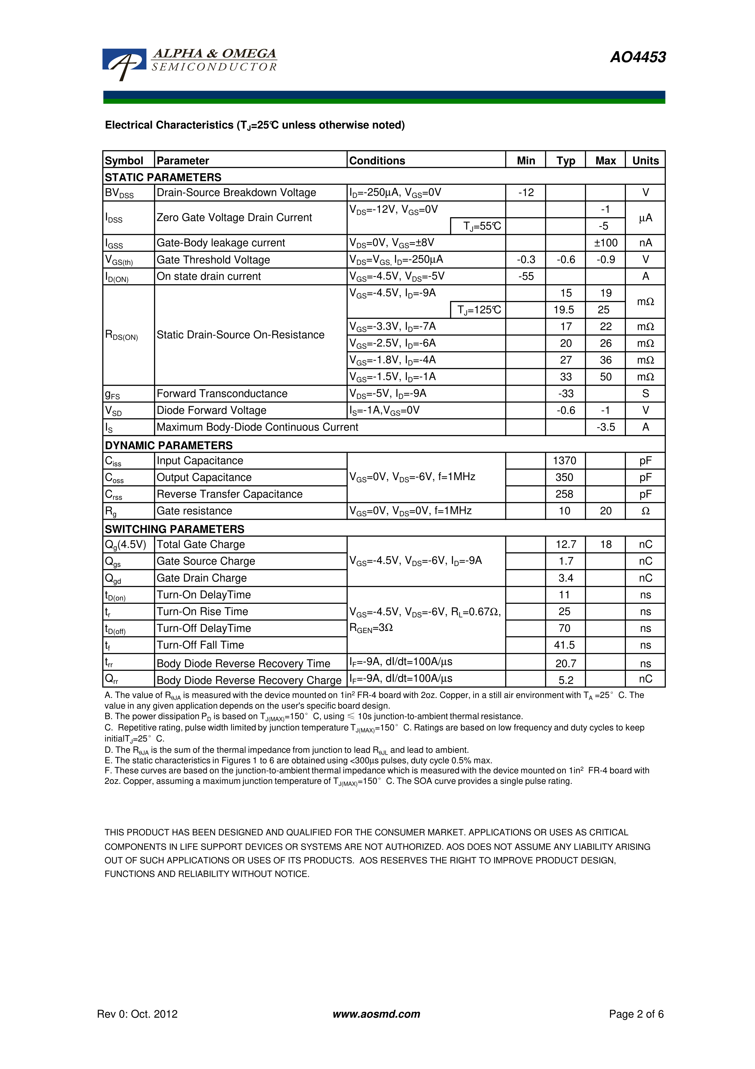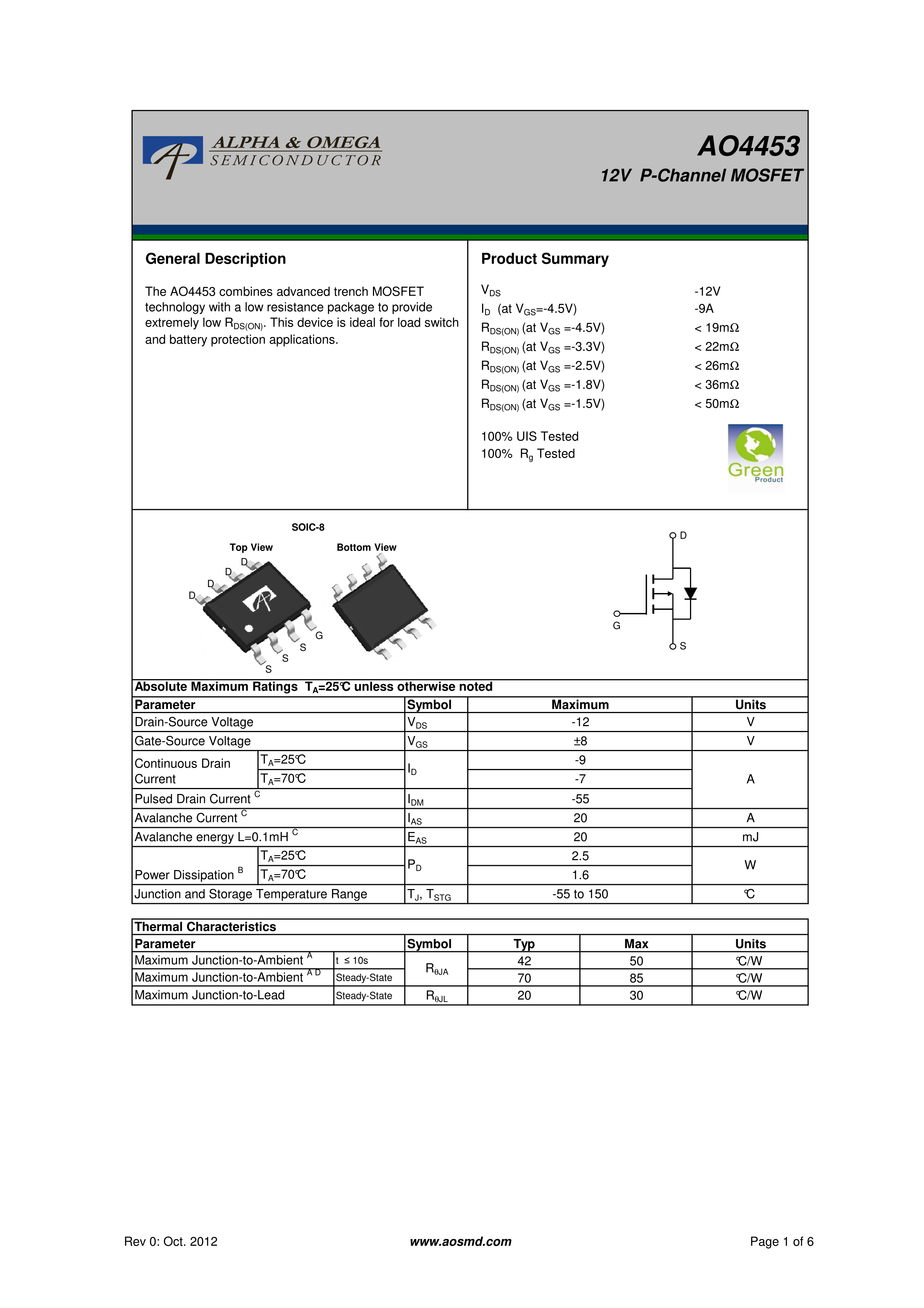AO4453数据手册SOIC-8_150mil封装AOSPDF规格书,中英文下载