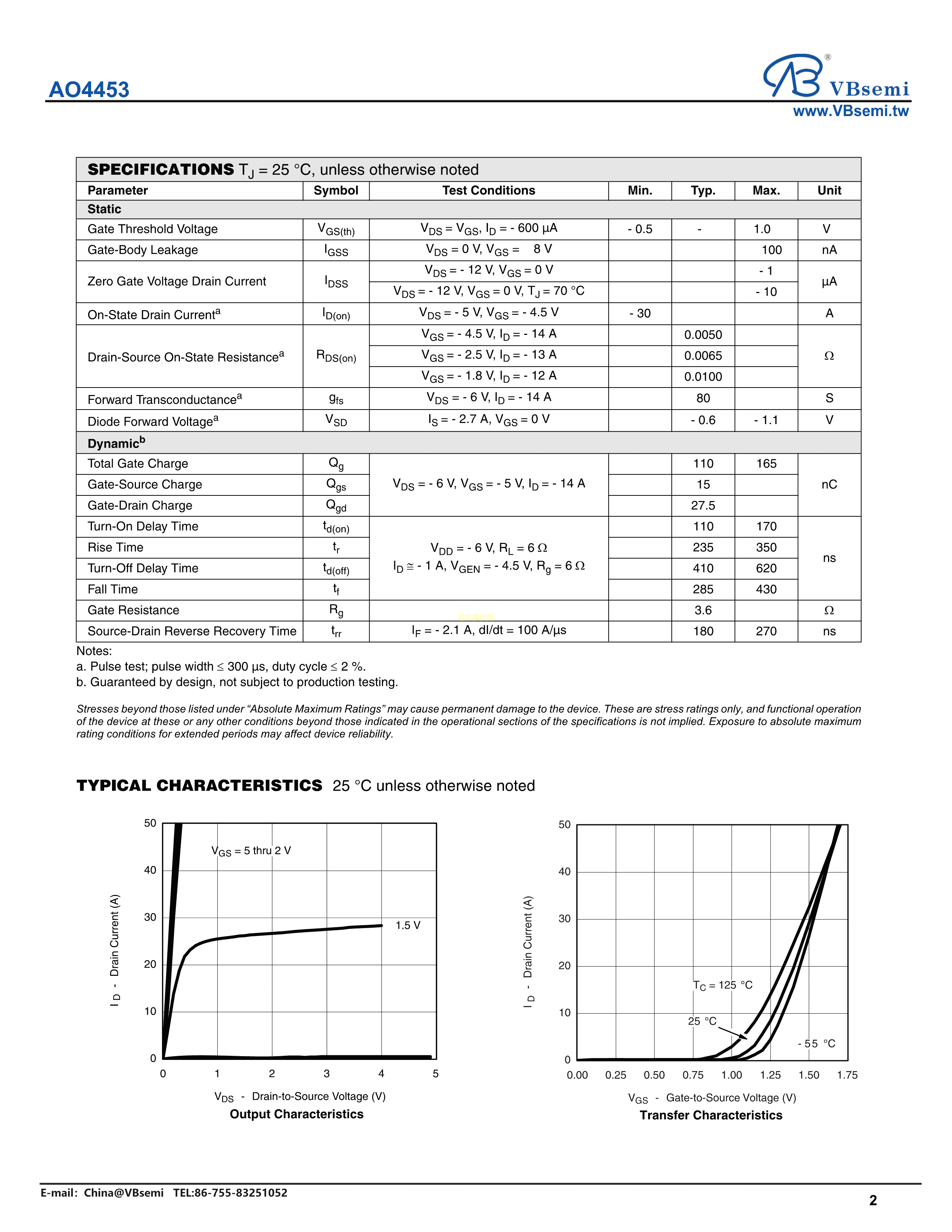 AO4453数据手册SOP-8封装VBsemi(台湾微碧)PDF规格书,中英文下载