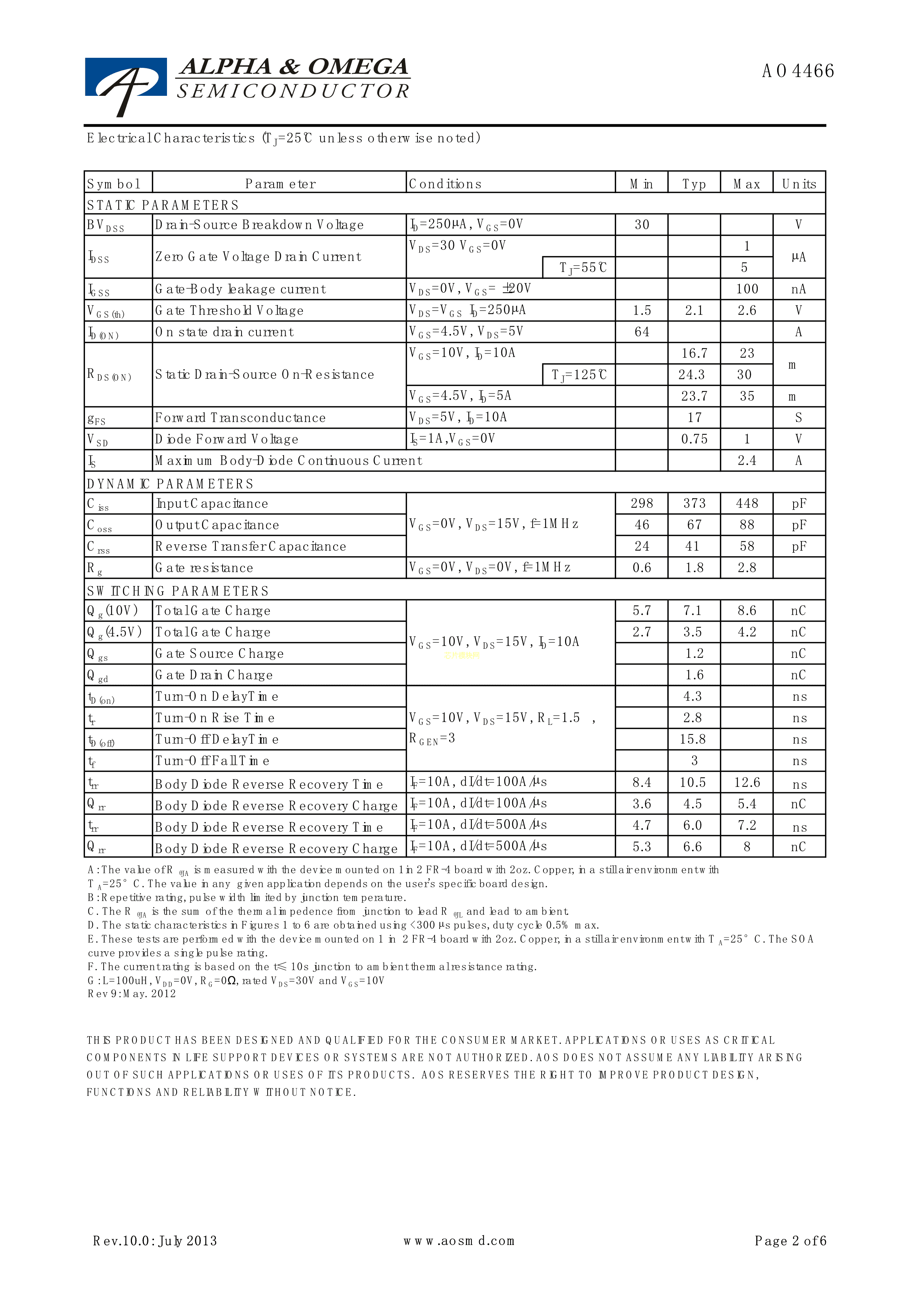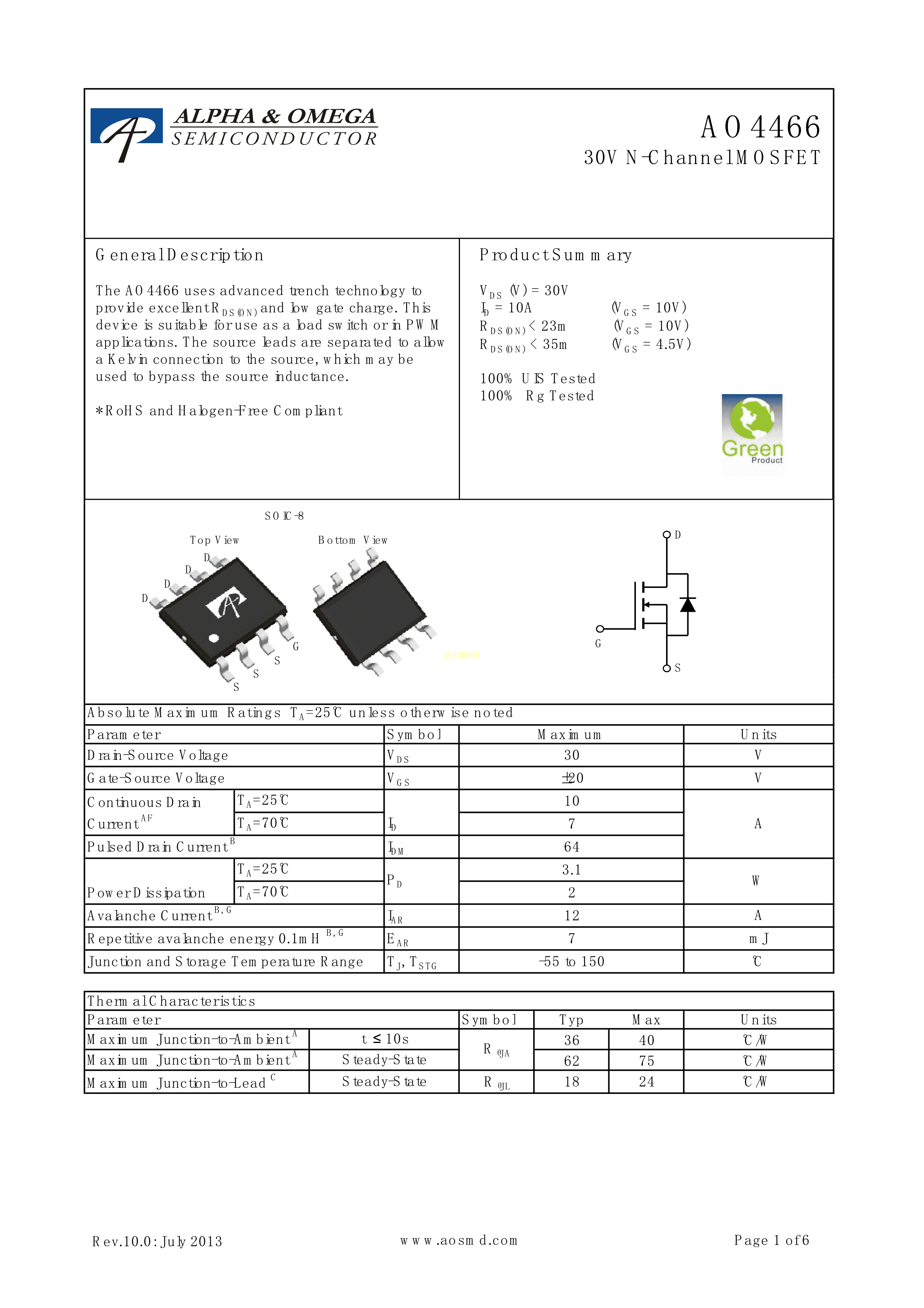 AO4466数据手册SOIC-8_150mil封装AOSPDF规格书,中英文下载