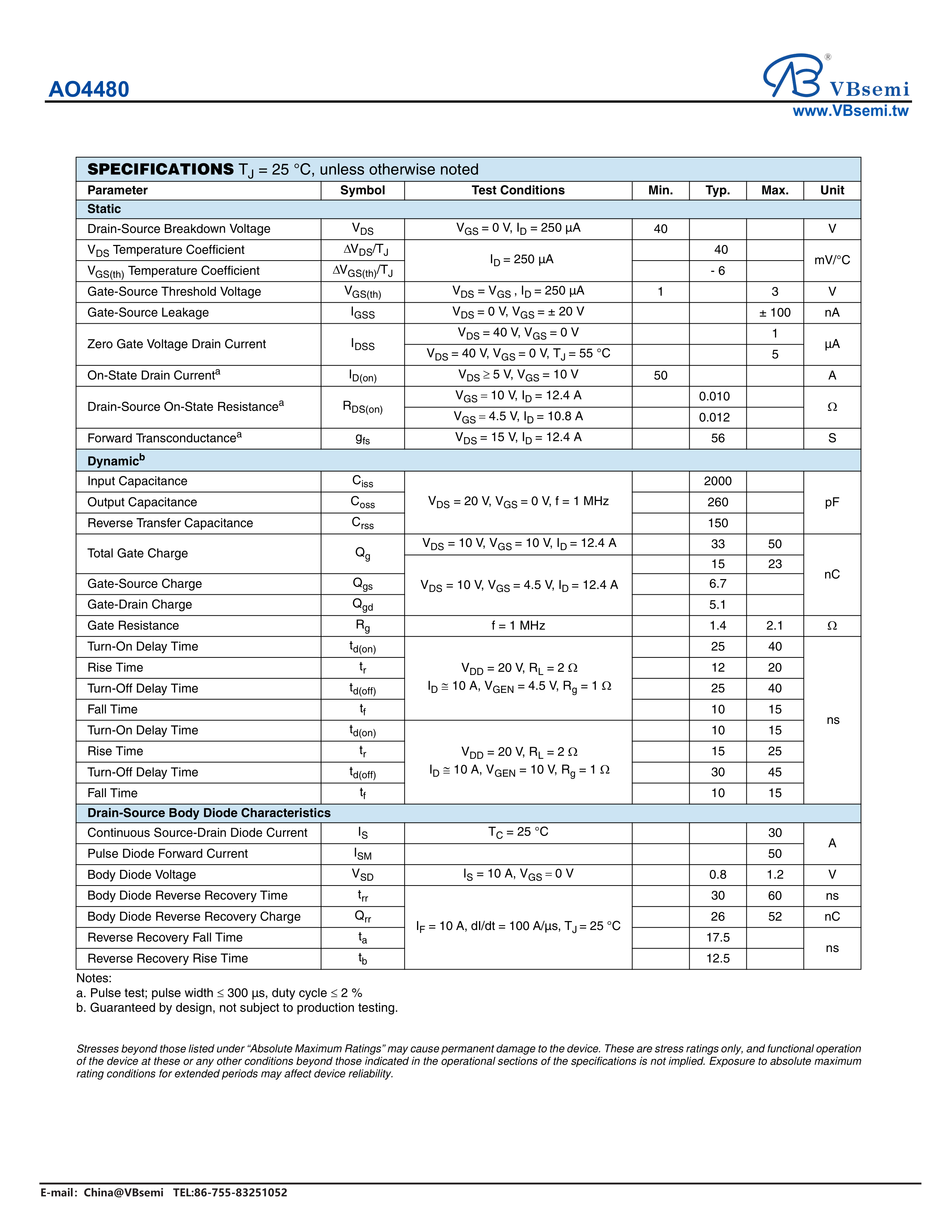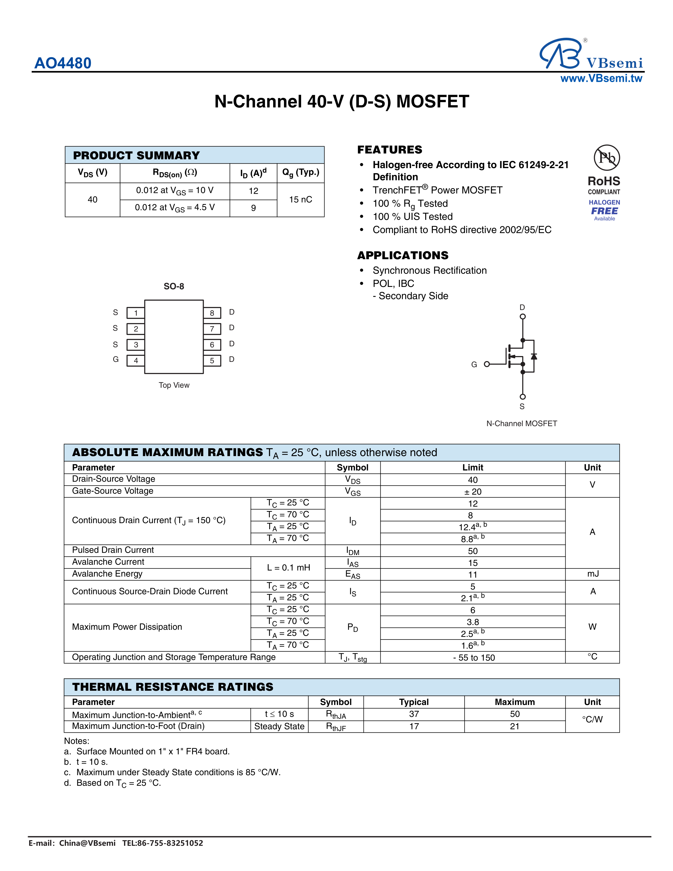 AO4480数据手册SO-8封装VBsemi(台湾微碧)PDF规格书,中英文下载