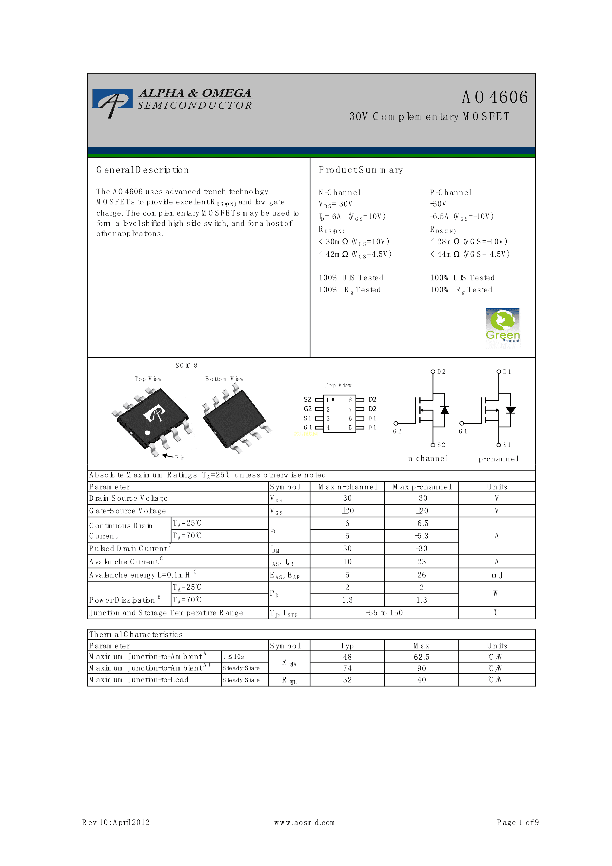 AO4606数据手册SOP-8_150mil封装AOSPDF规格书,中英文下载