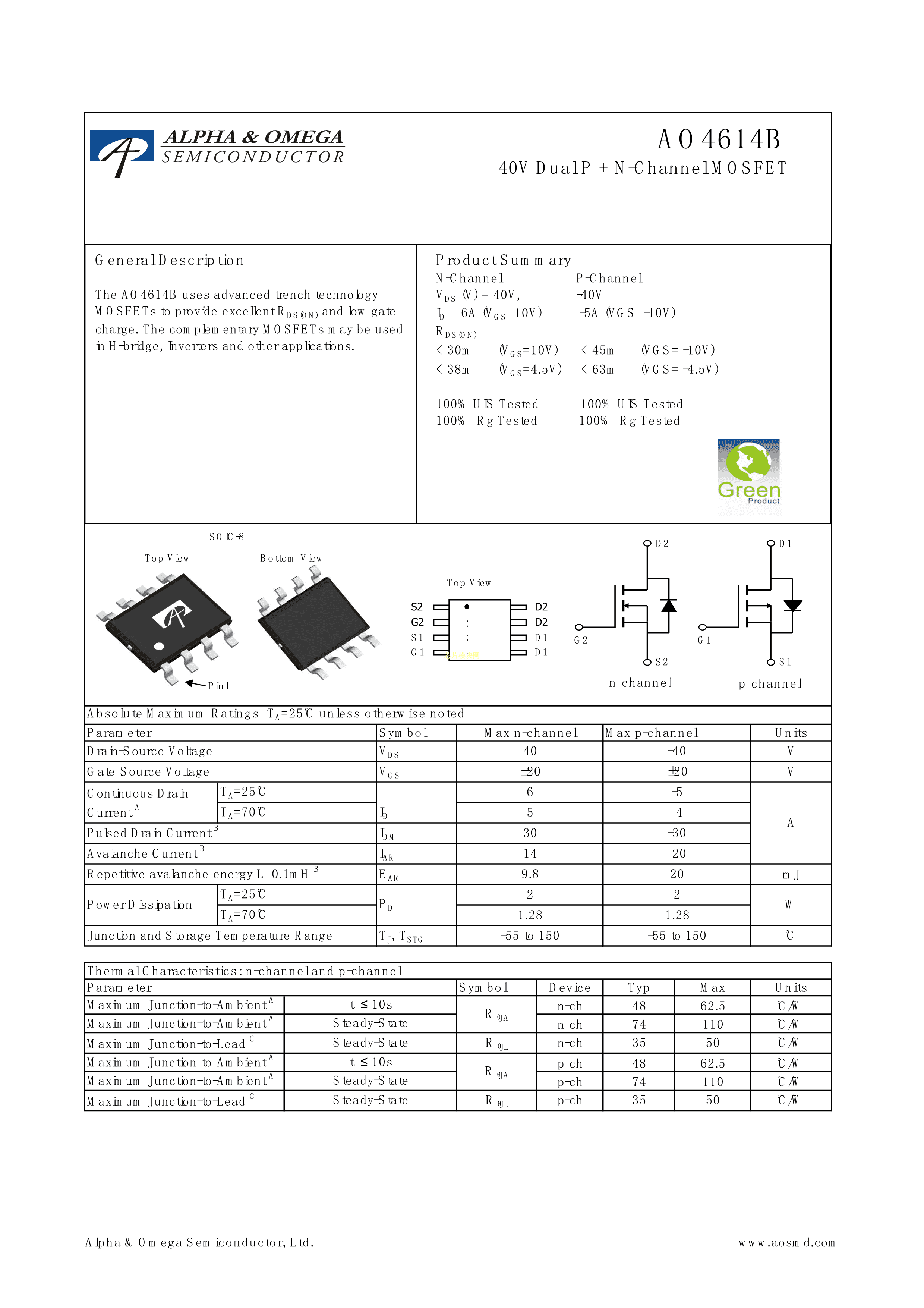 AO4614BL数据手册SOP-8_150mil封装AOSPDF规格书,中英文下载