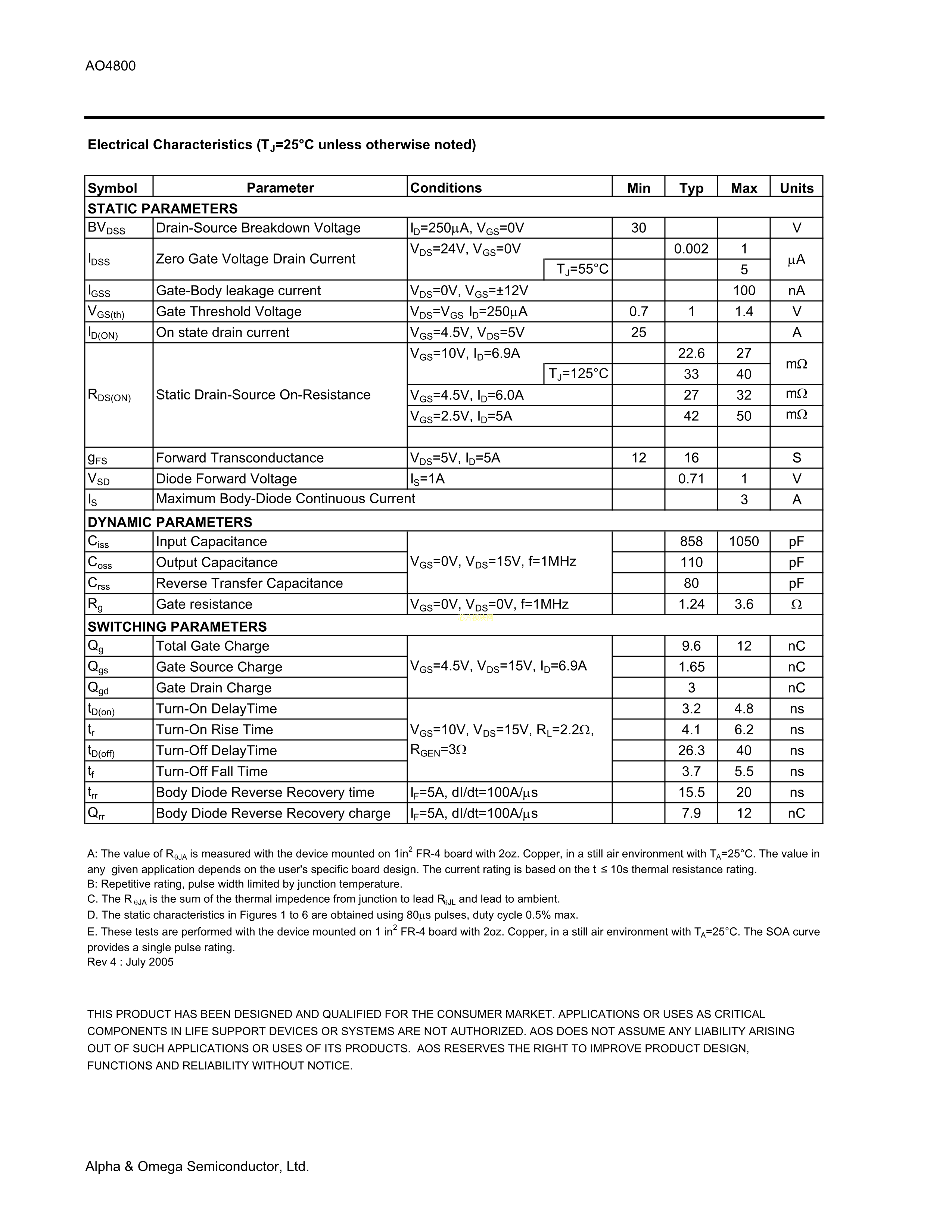 AO4800数据手册SOIC-8_150mil封装AOSPDF规格书,中英文下载