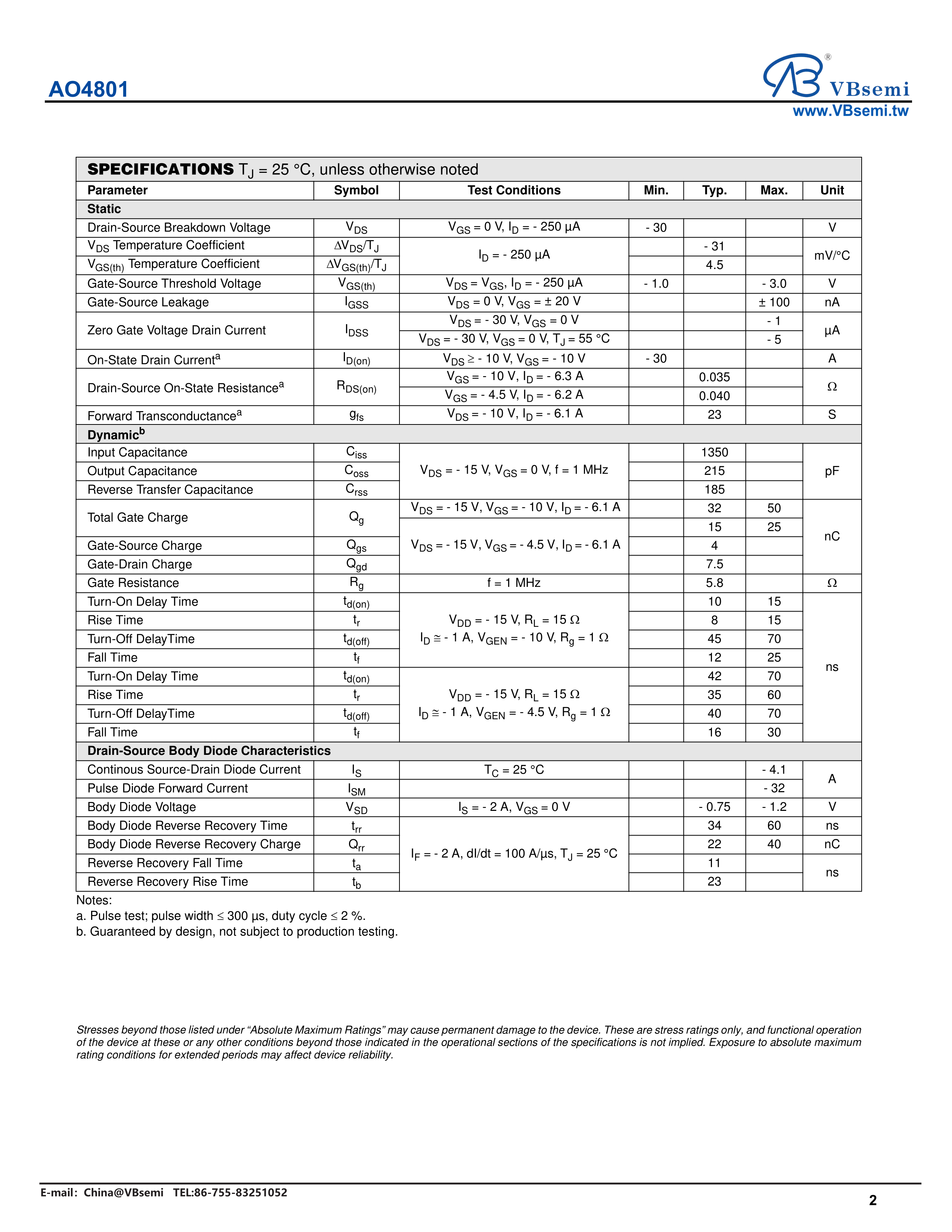 AO4801数据手册SOP-8封装VBsemi(台湾微碧)PDF规格书,中英文下载