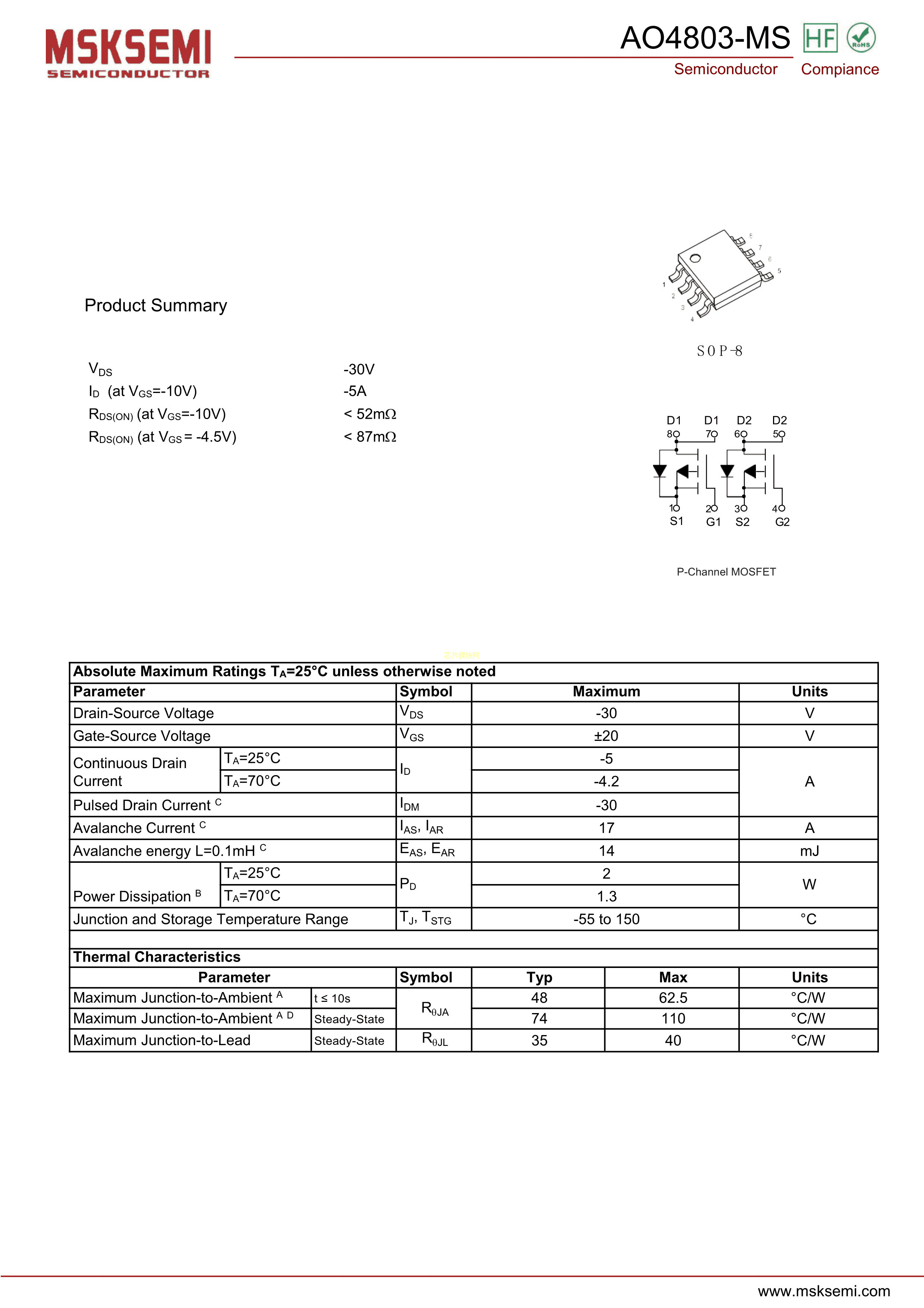 AO4803-MS数据手册SOP-8封装MSKSEMI(美森科)PDF规格书,中英文下载