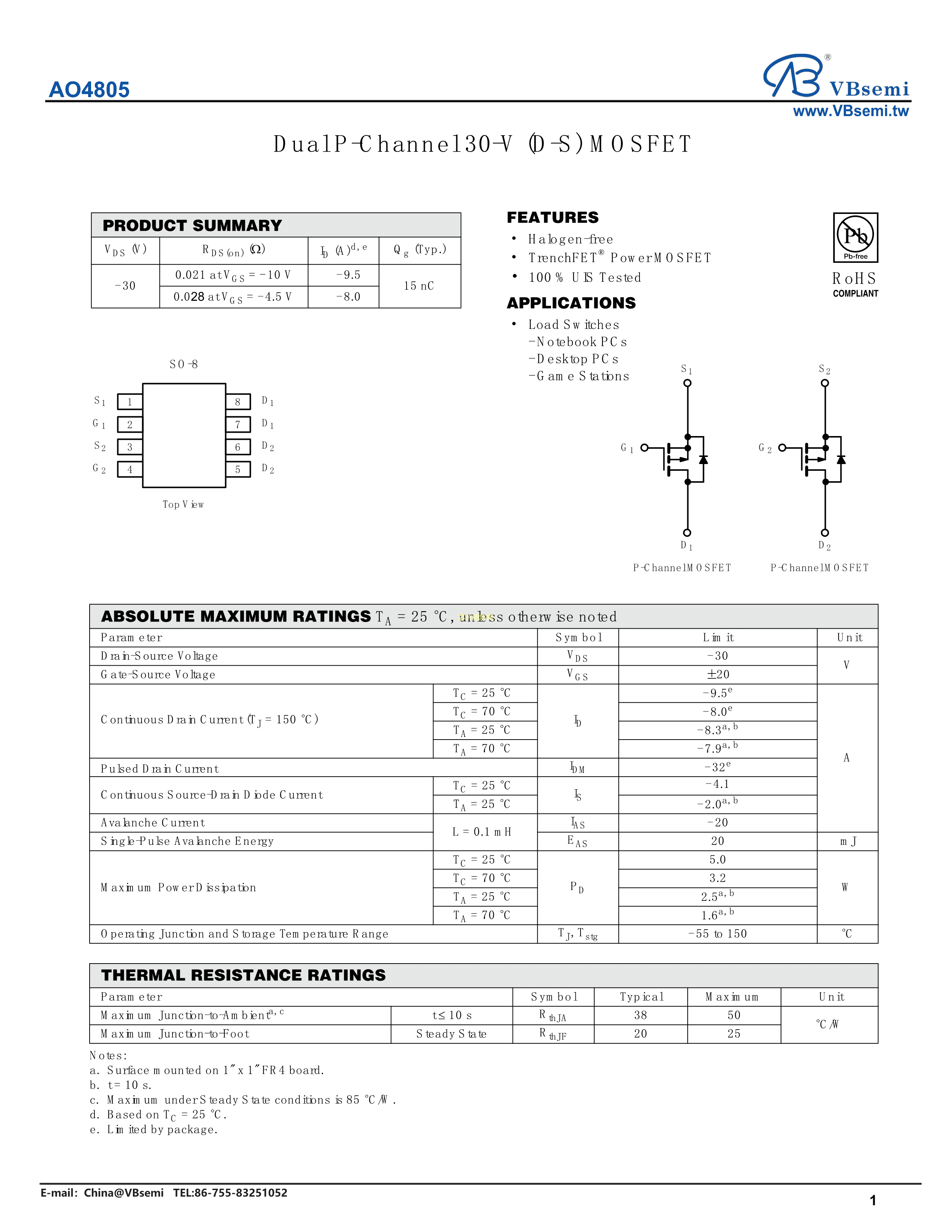 AO4805数据手册SO-8封装VBsemi(台湾微碧)PDF规格书,中英文下载