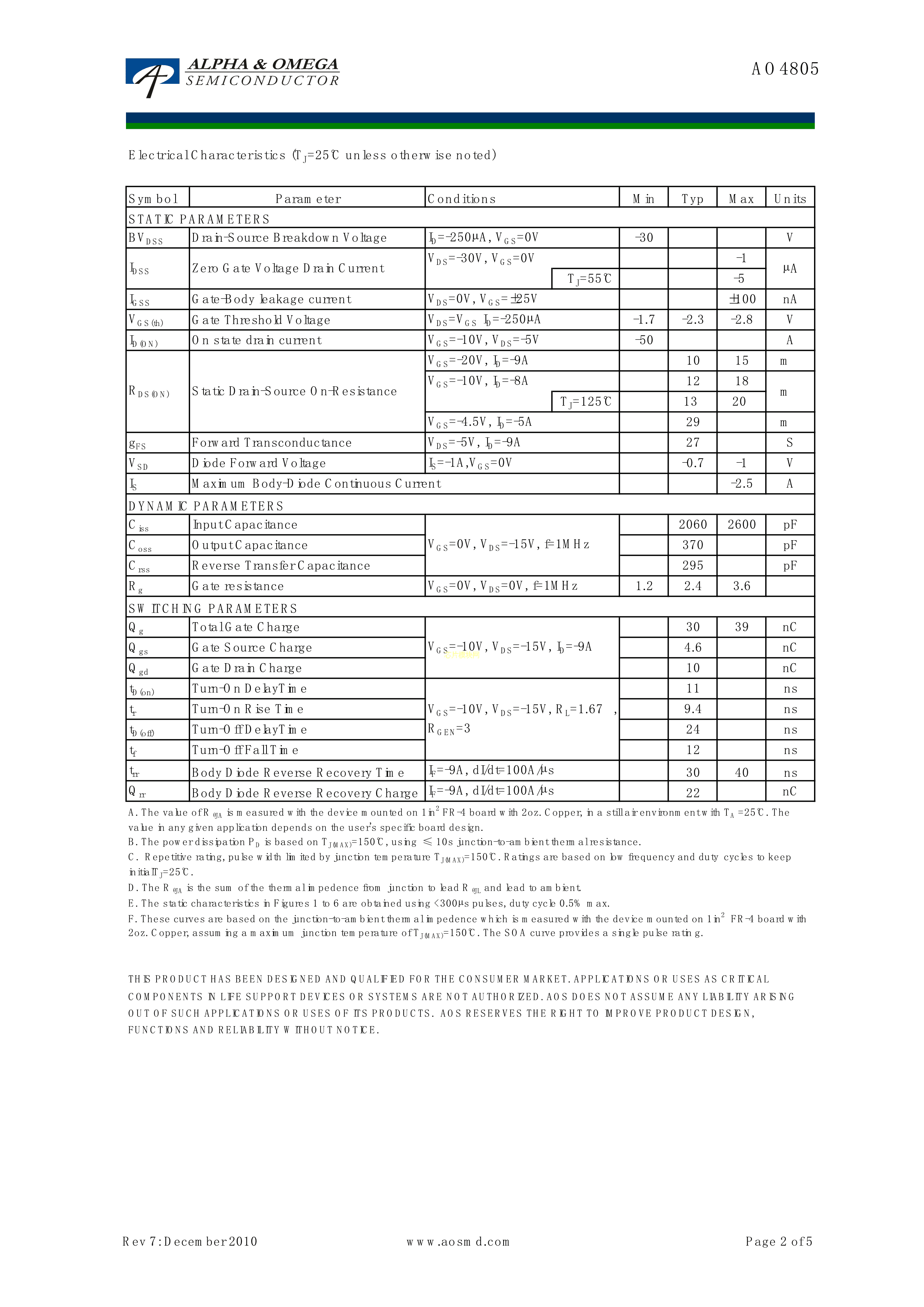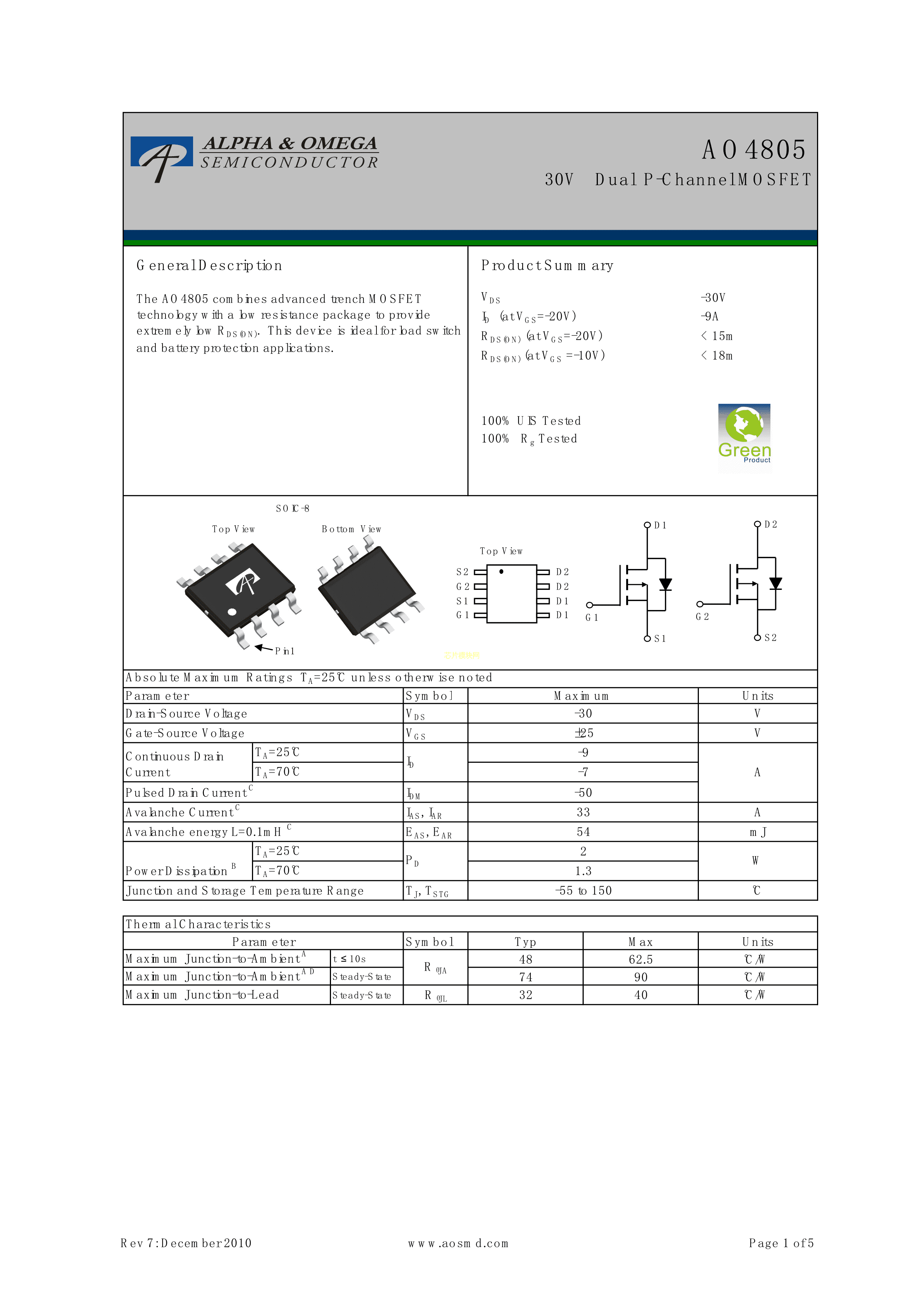 AO4805数据手册SOIC-8_150mil封装AOSPDF规格书,中英文下载