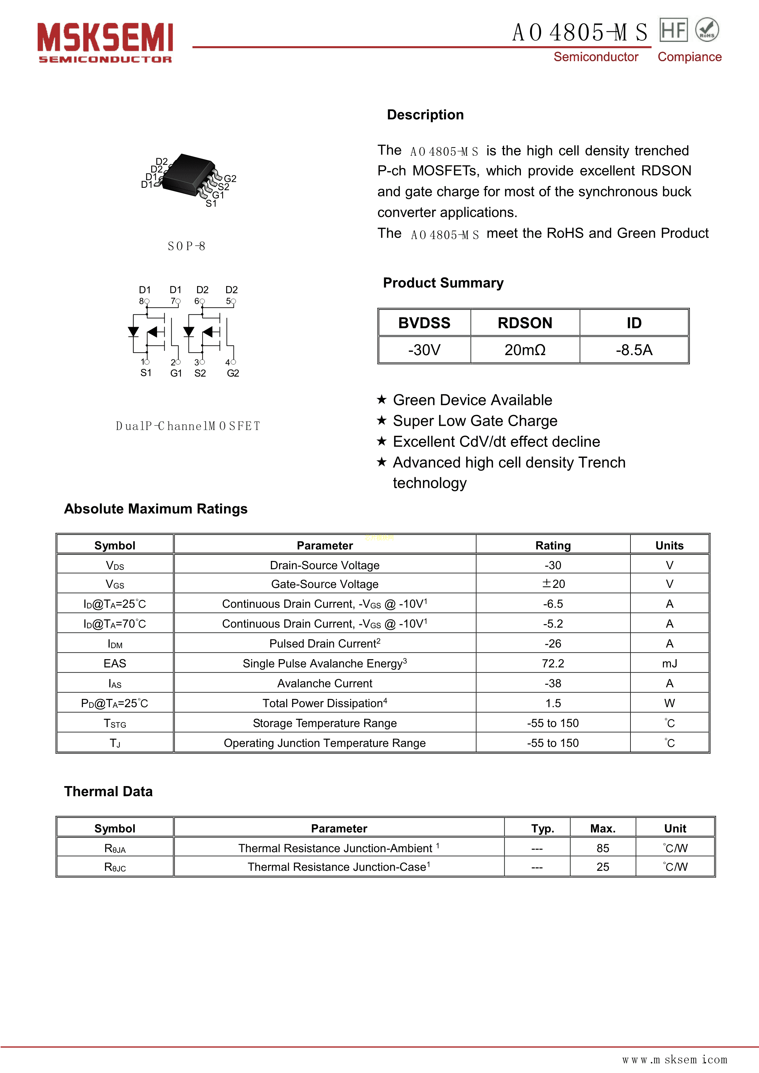 AO4805-MS数据手册SOP-8封装MSKSEMI(美森科)PDF规格书,中英文下载