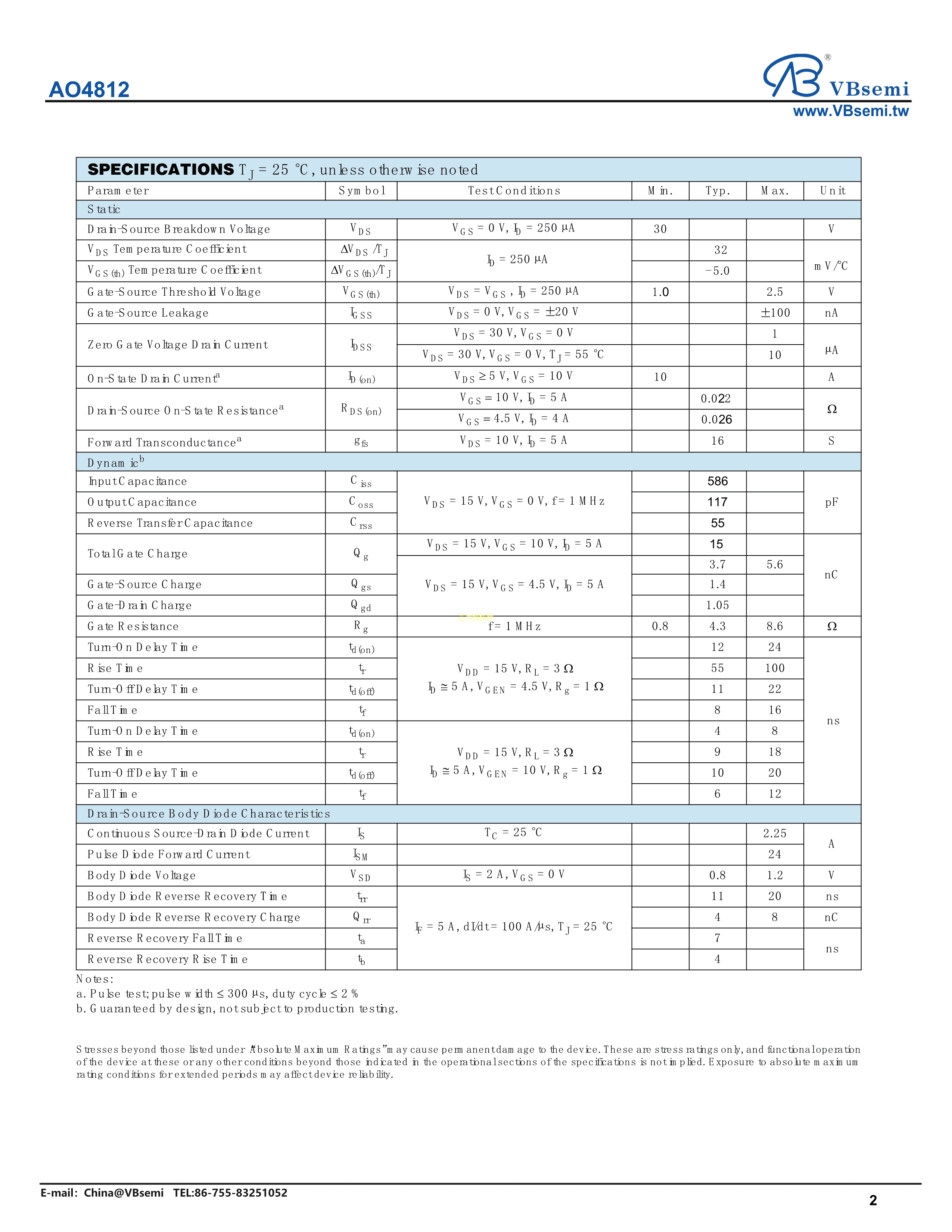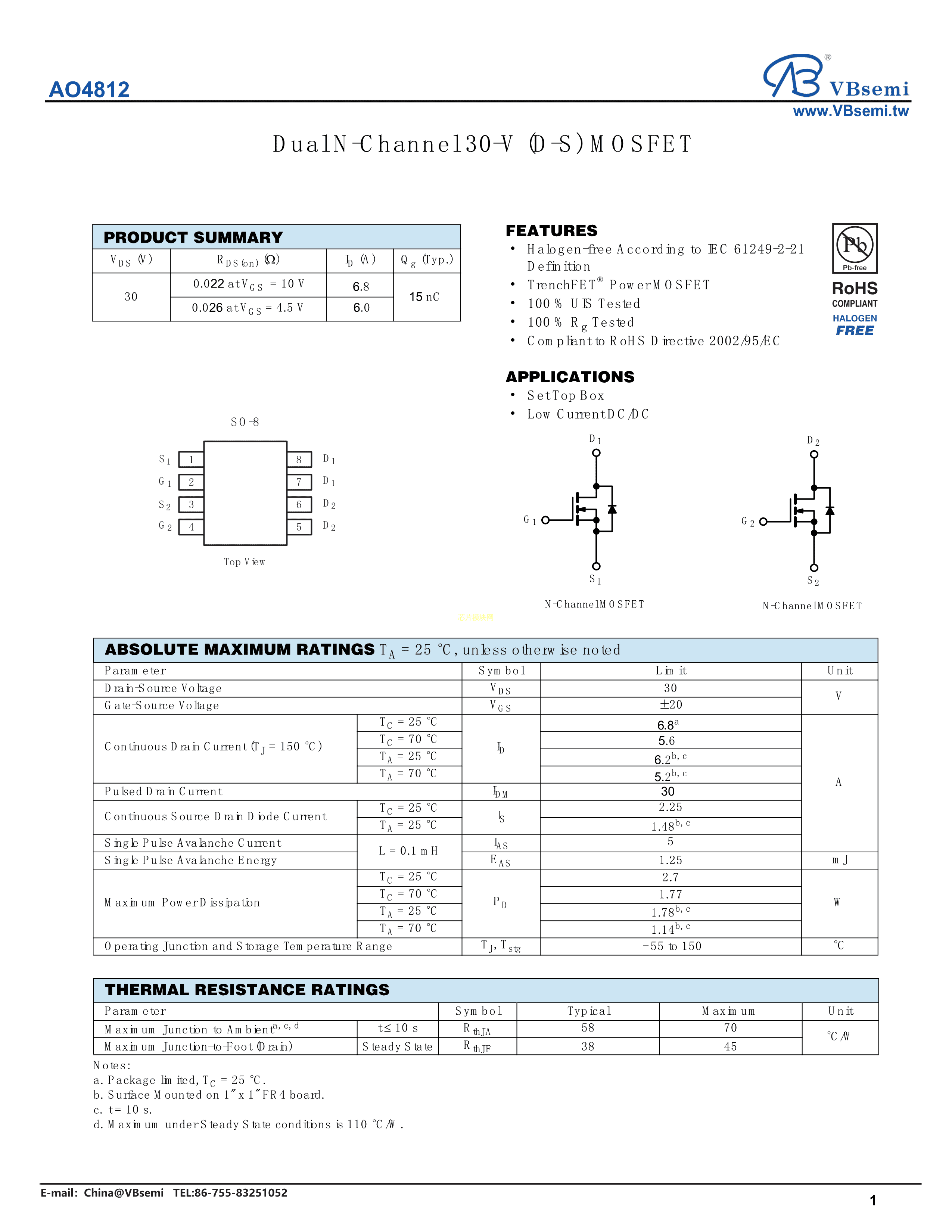 AO4812数据手册SOP-8封装VBsemi(台湾微碧)PDF规格书,中英文下载