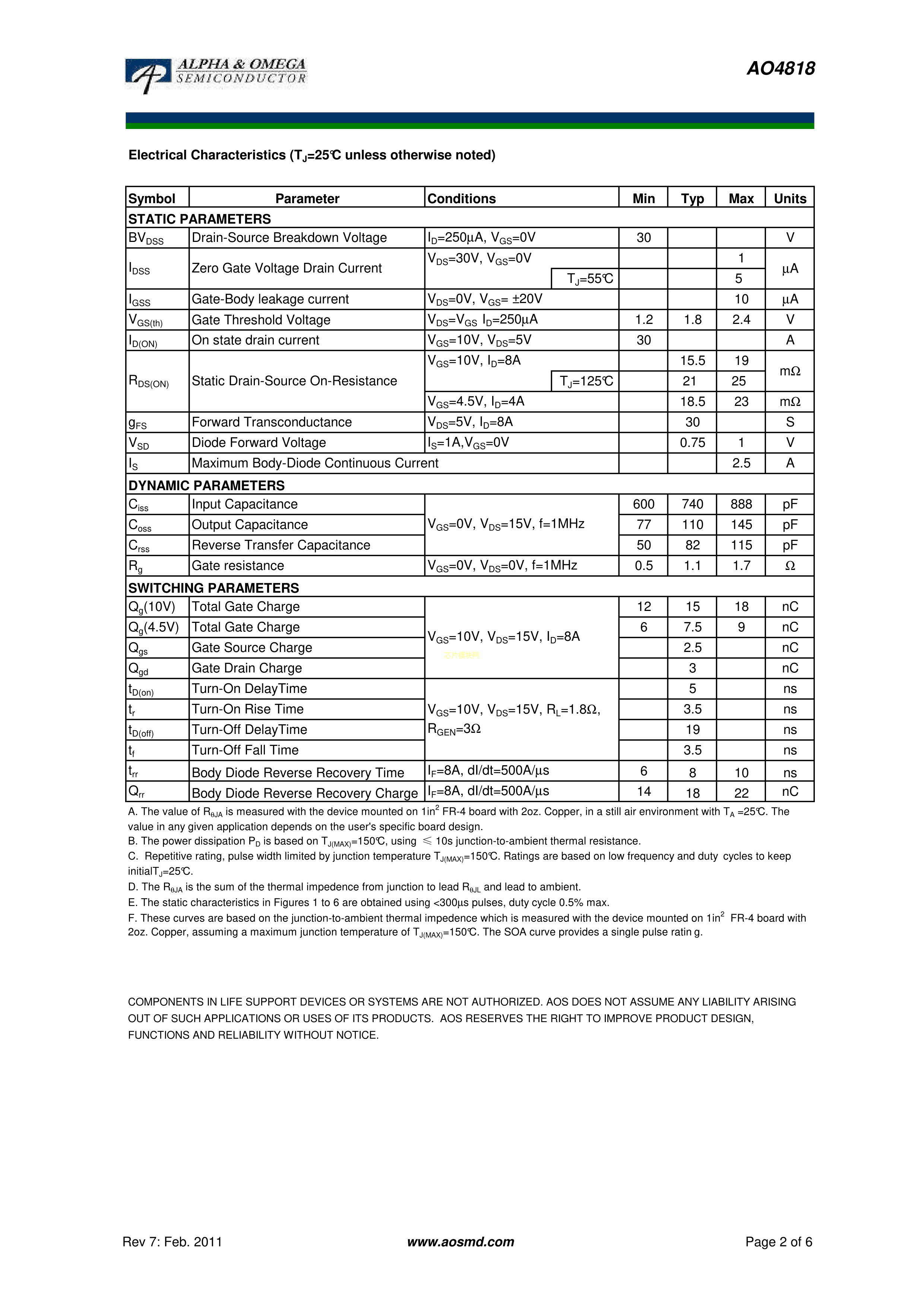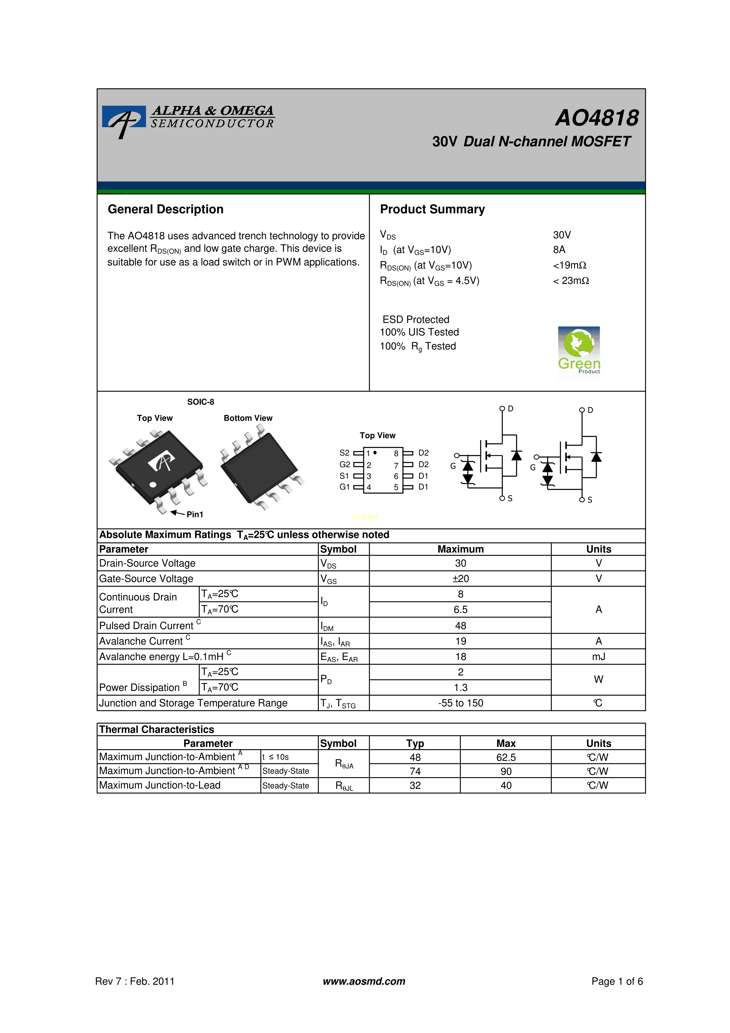AO4818数据手册SOIC-8_150mil封装AOSPDF规格书,中英文下载