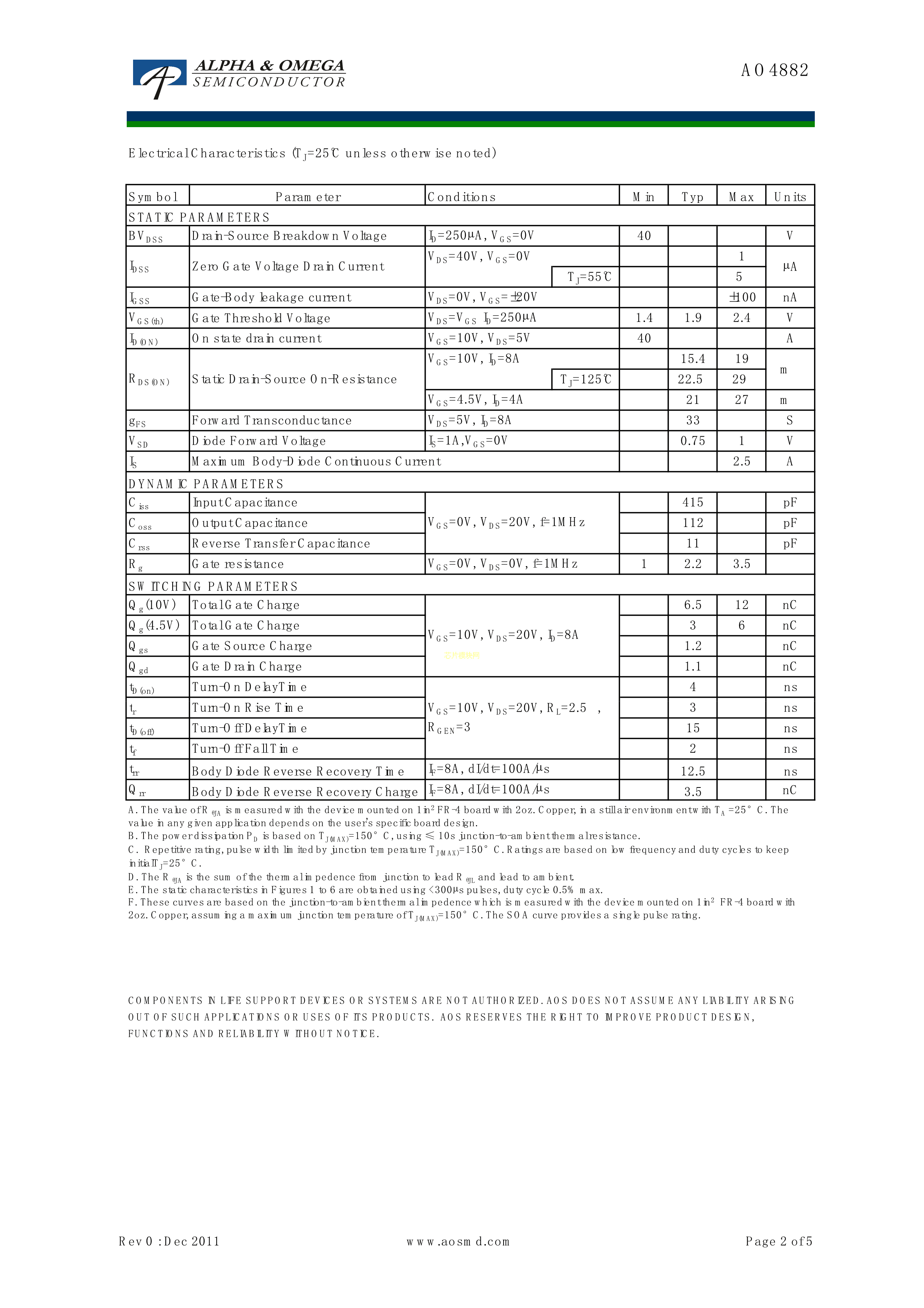 AO4882数据手册SOIC-8封装AOSPDF规格书,中英文下载