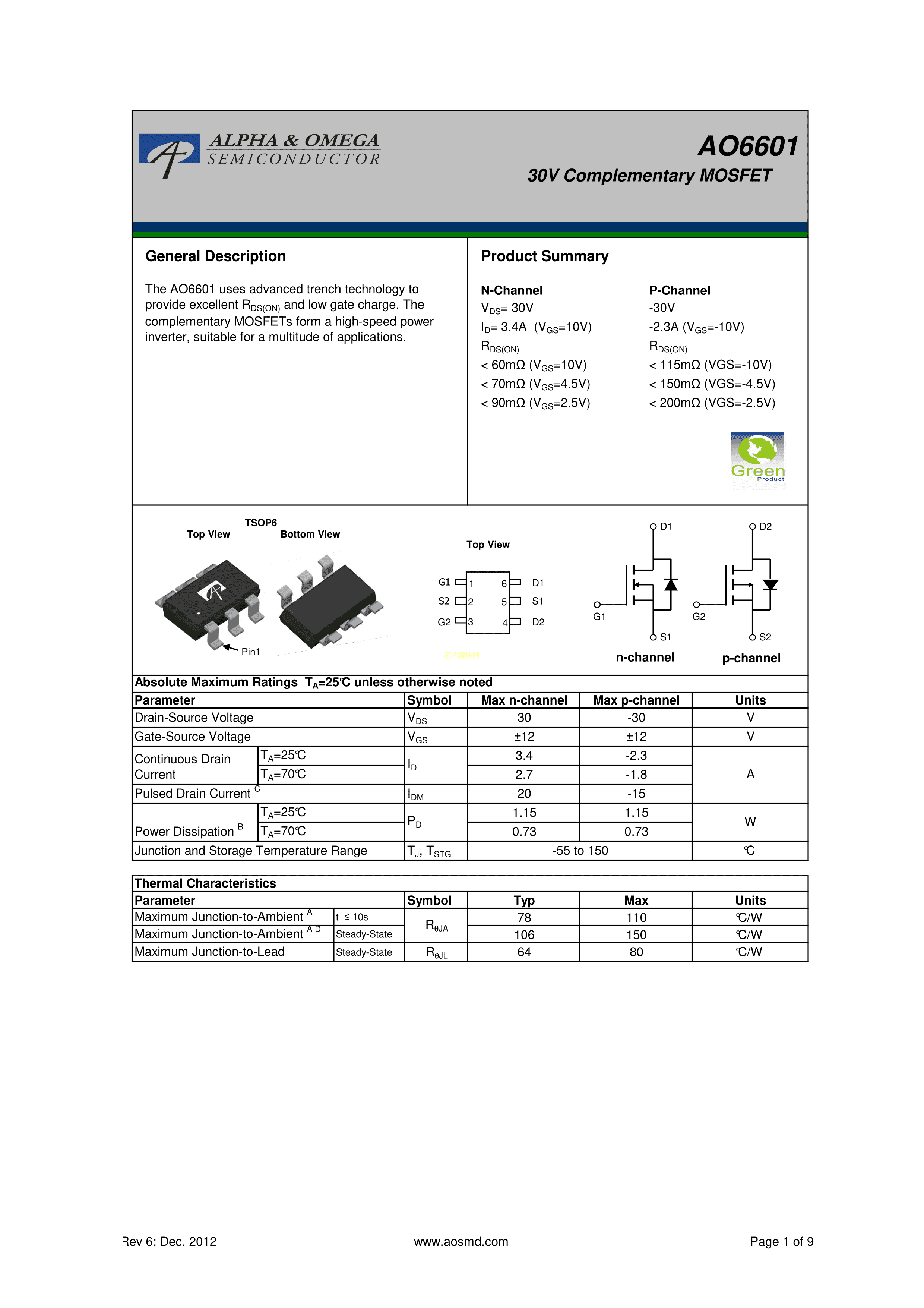 AO6601数据手册TSOP-6封装AOSPDF规格书,中英文下载