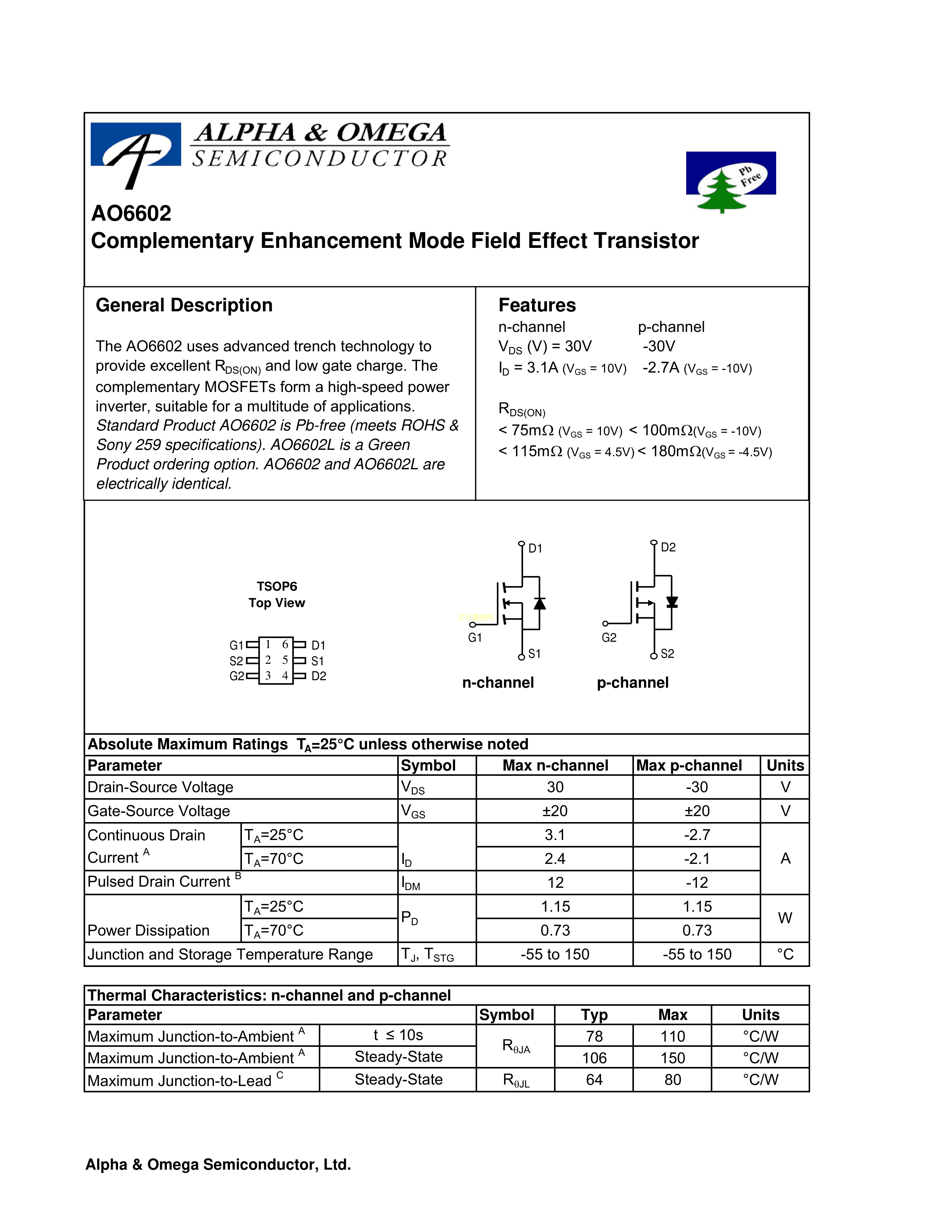 AO6602L数据手册TSOP-6封装AOSPDF规格书,中英文下载