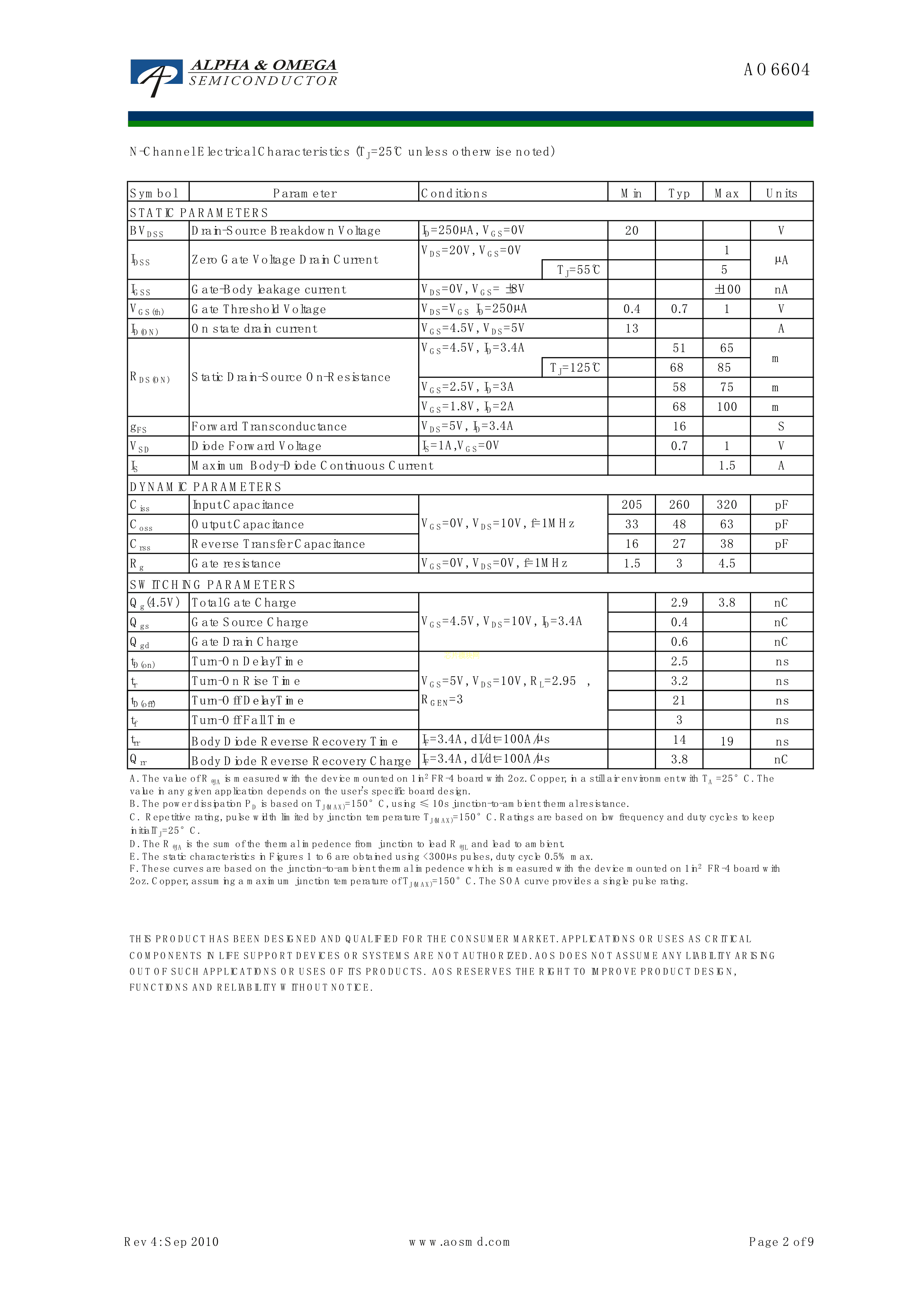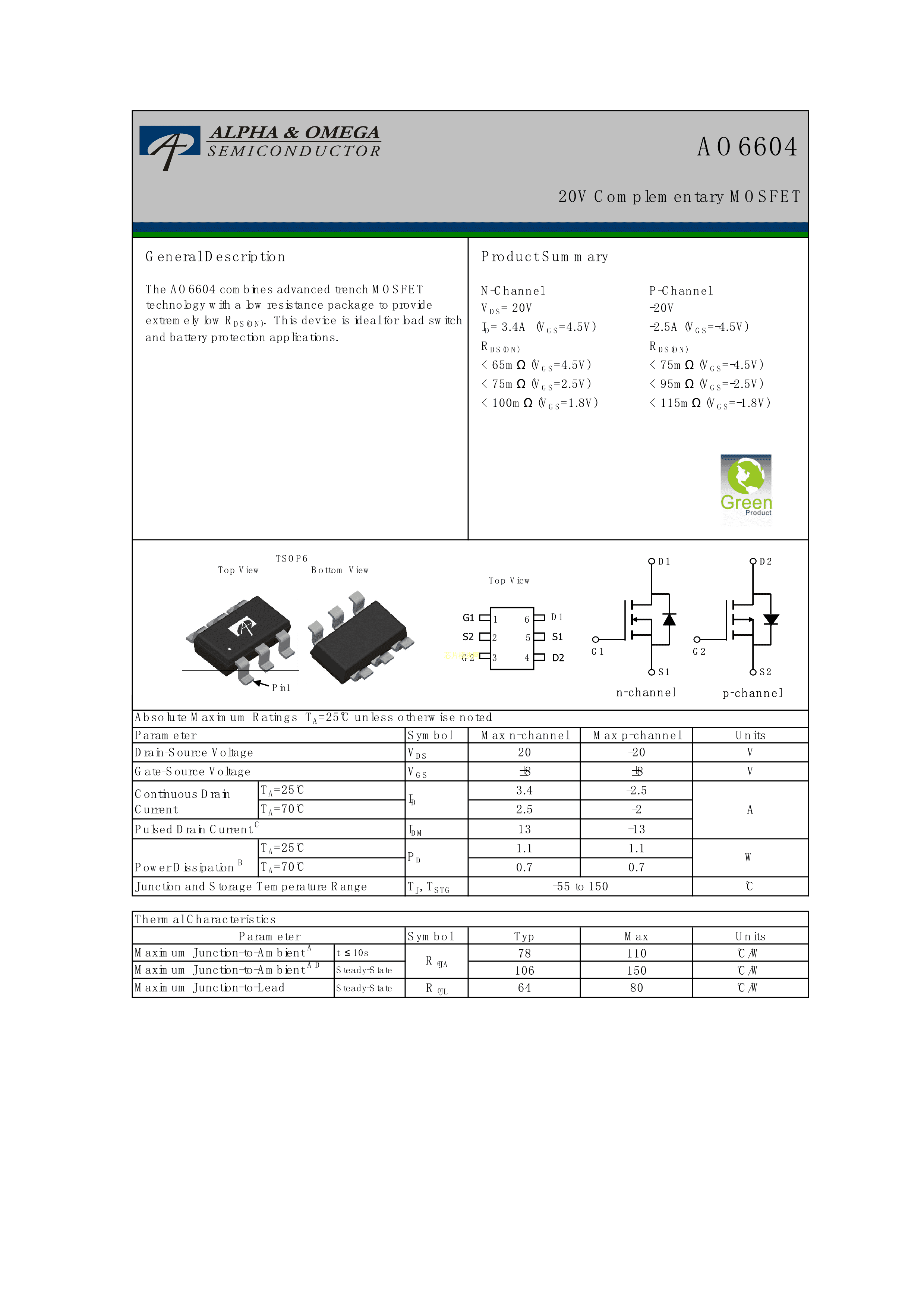 AO6604数据手册TSOP-6封装AOSPDF规格书,中英文下载