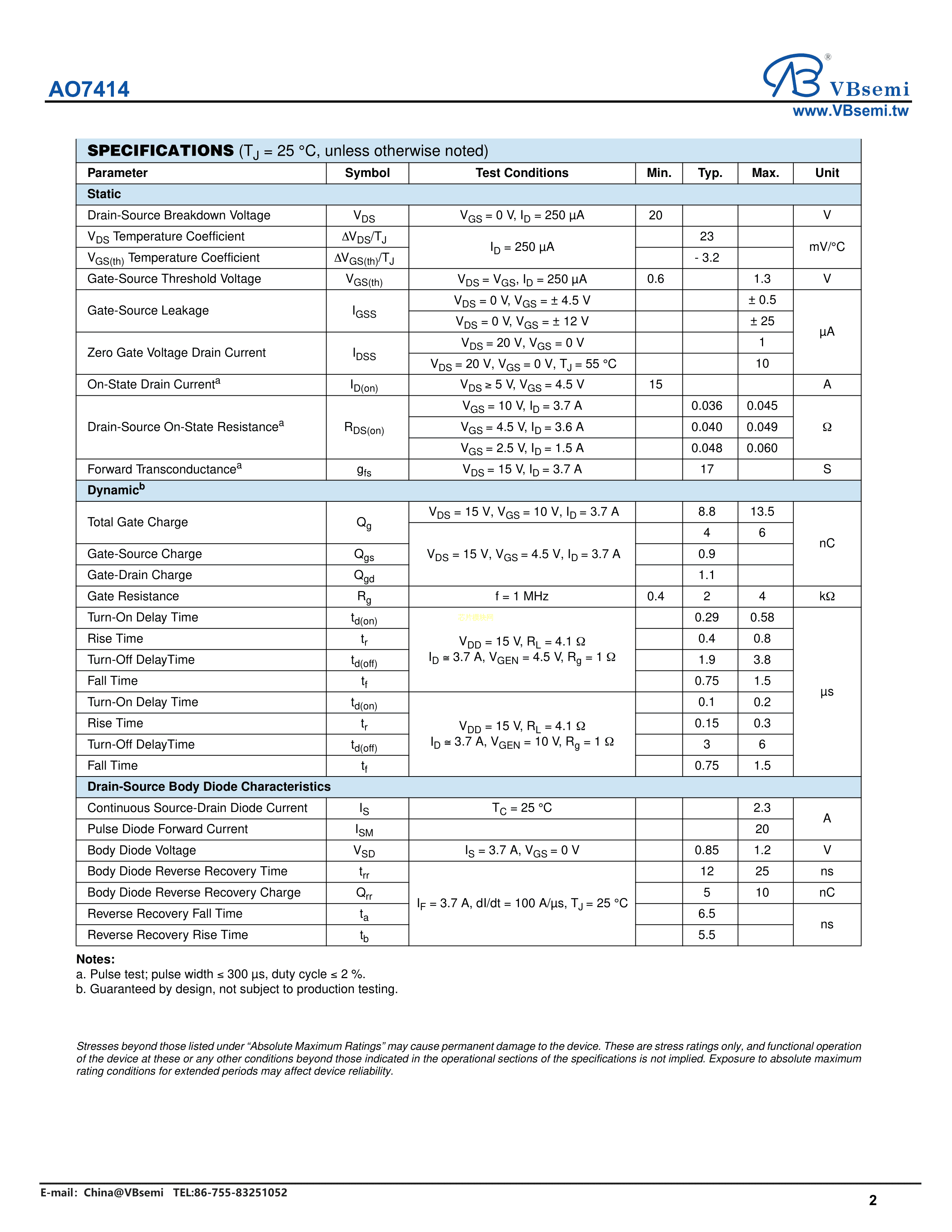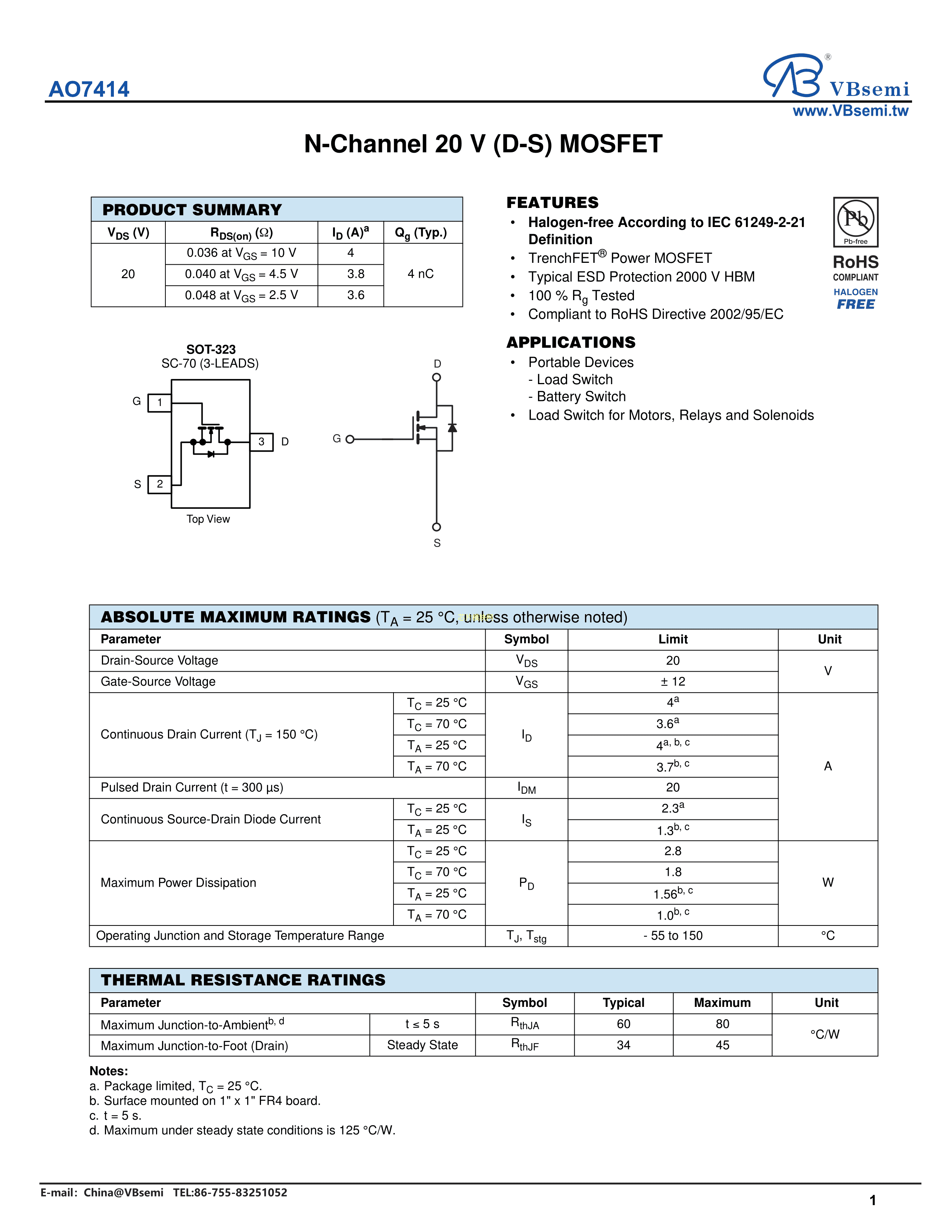 AO7414数据手册SC-70-3封装VBsemi(台湾微碧)PDF规格书,中英文下载