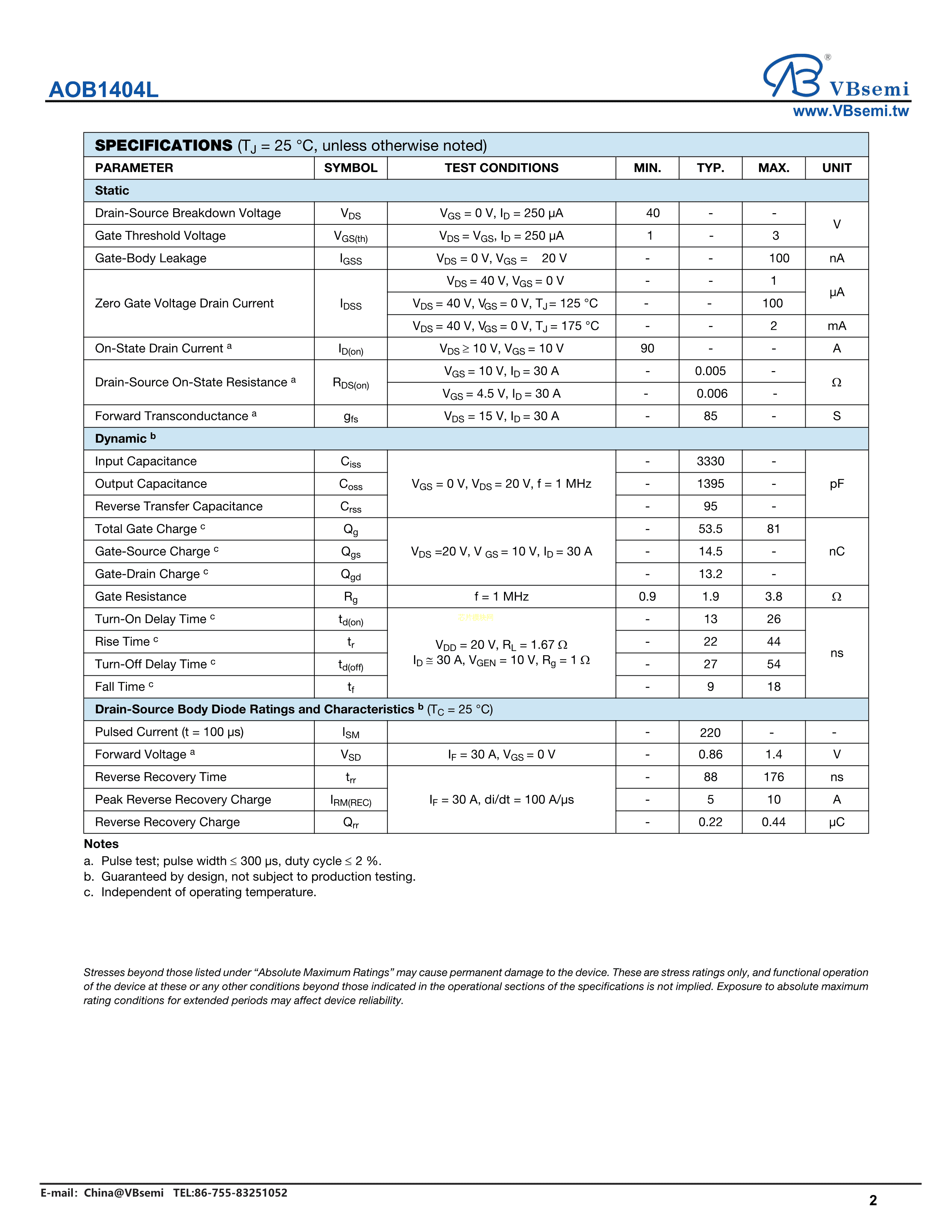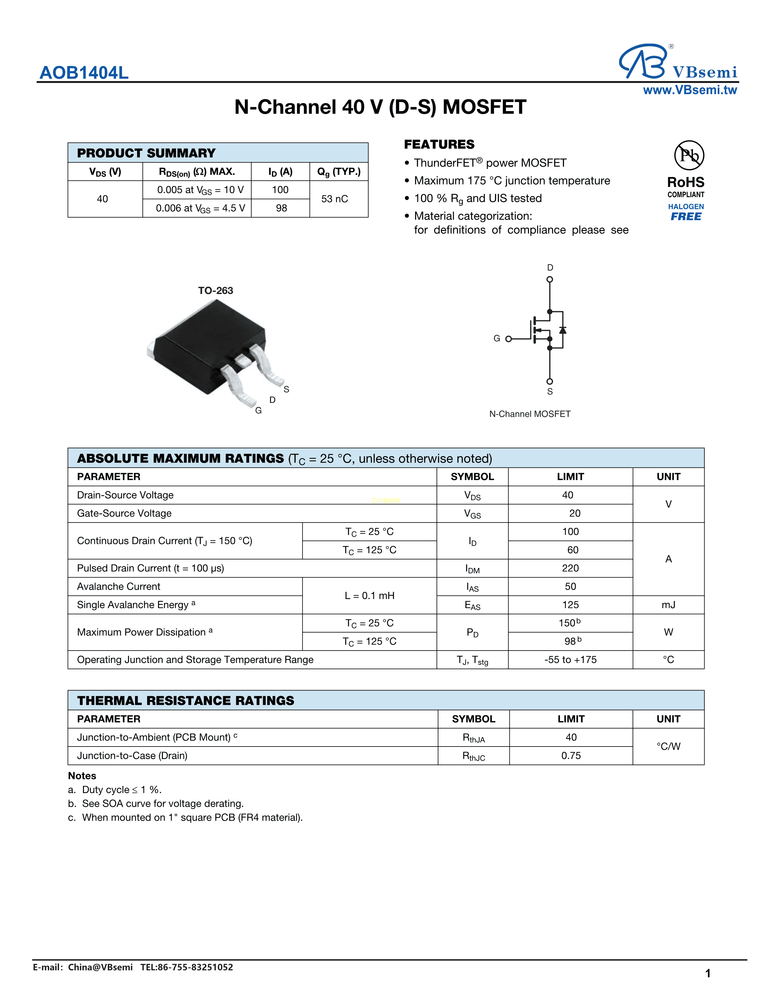 AOB1404L数据手册TO-263封装VBsemi(台湾微碧)PDF规格书,中英文下载