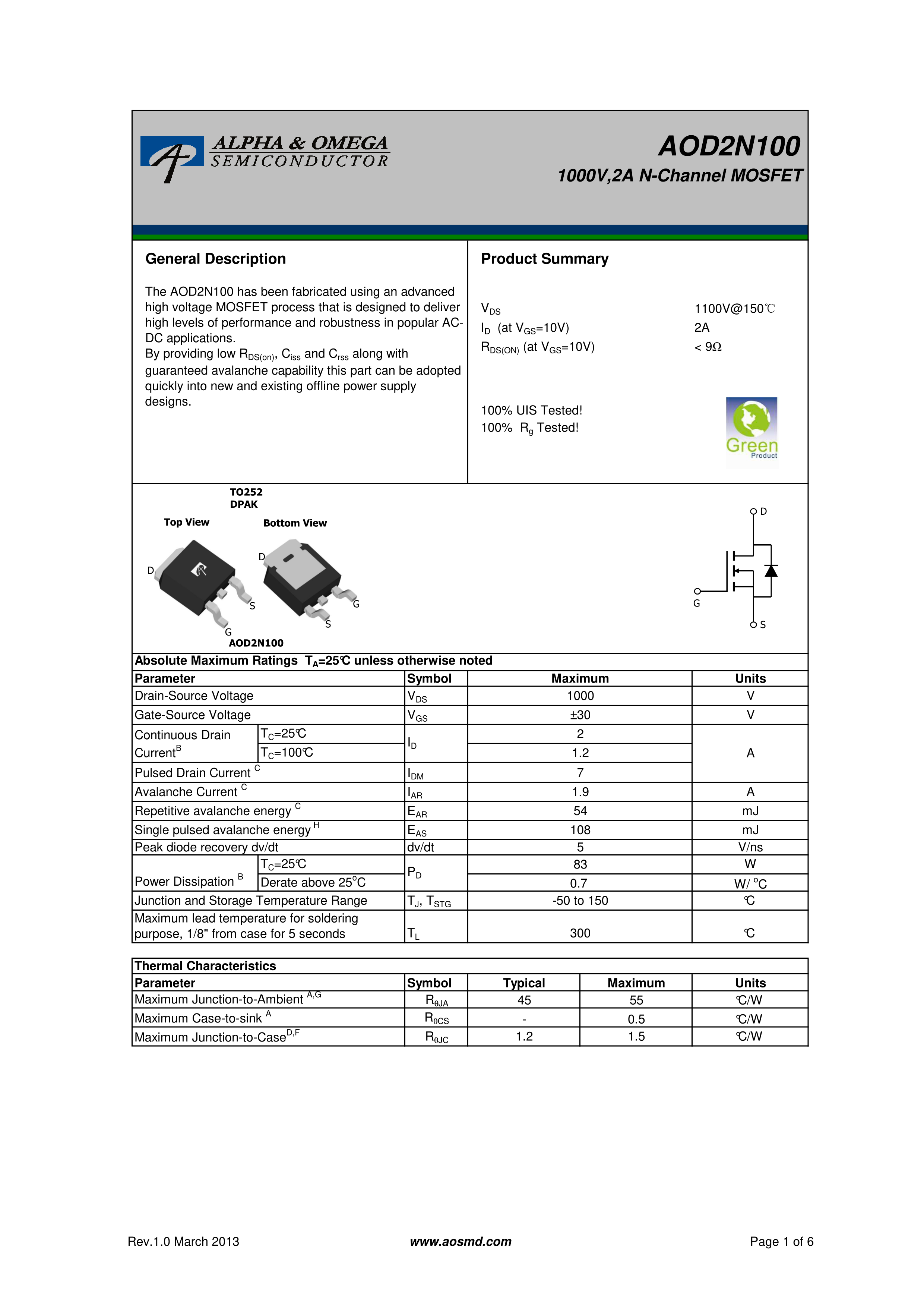 AOD2N100数据手册TO-252-2(DPAK)封装AOSPDF规格书,中英文下载