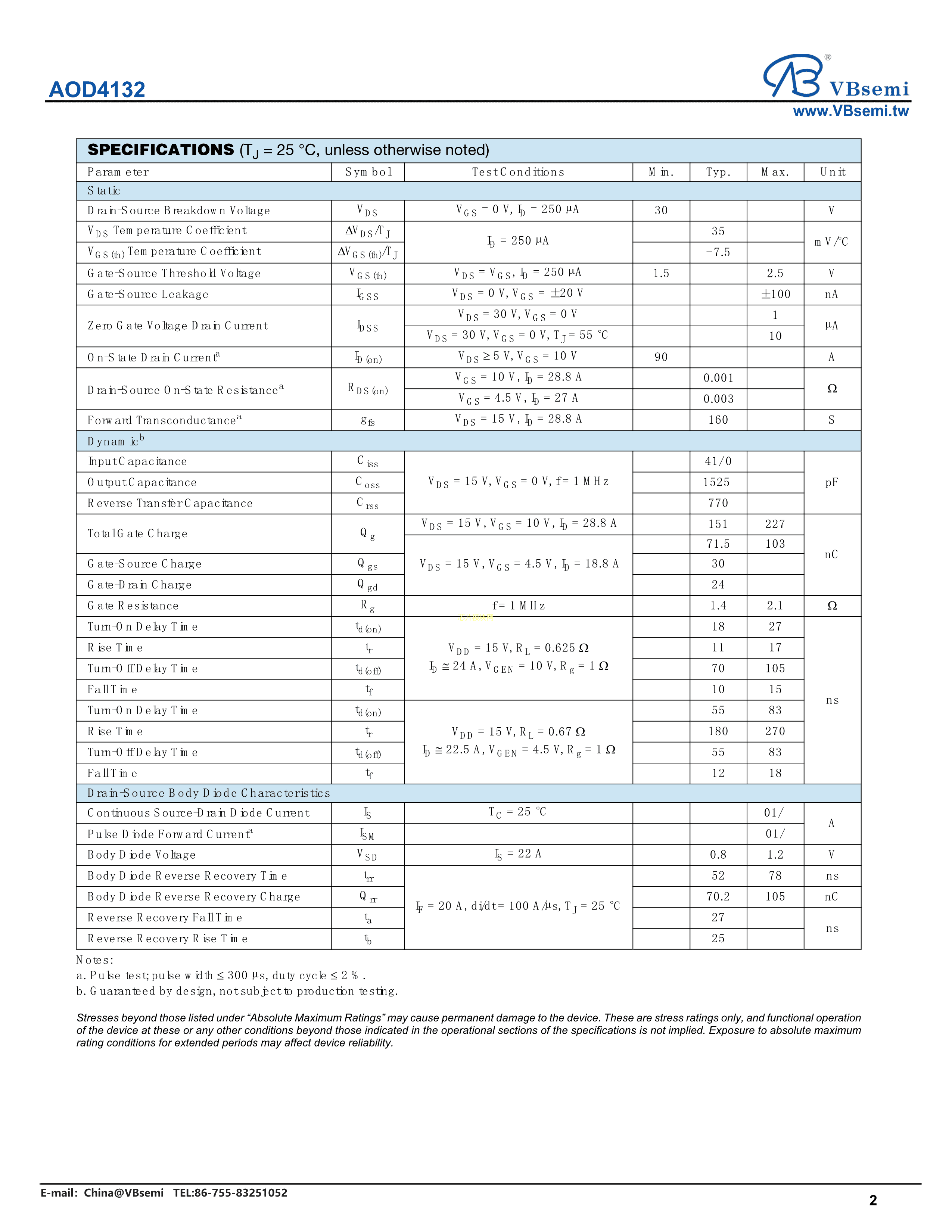 AOD4132数据手册TO-252封装VBsemi(台湾微碧)PDF规格书,中英文下载