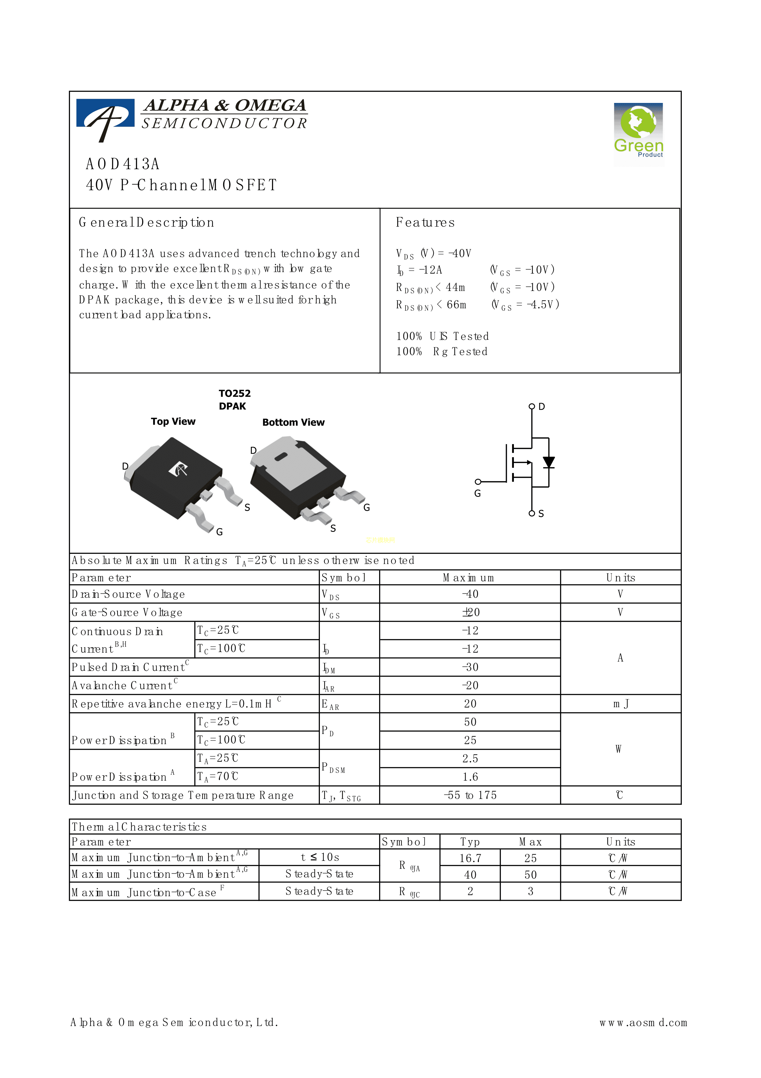 AOD413A数据手册TO-252-2(DPAK)封装AOSPDF规格书,中英文下载
