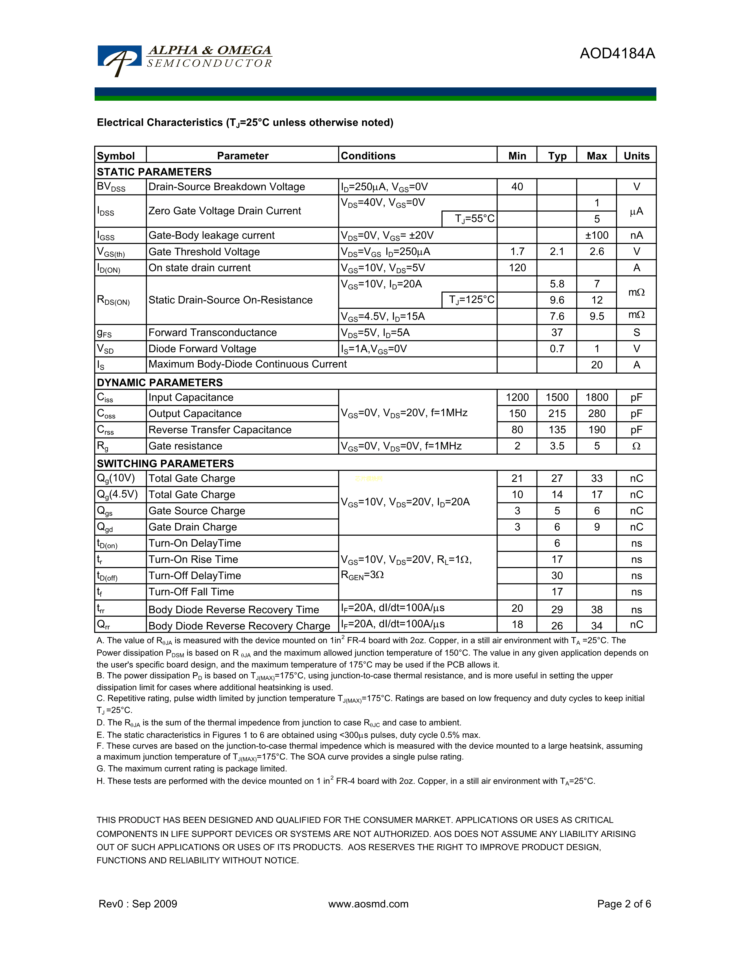 AOD4184A数据手册TO-252-2(DPAK)封装AOSPDF规格书,中英文下载