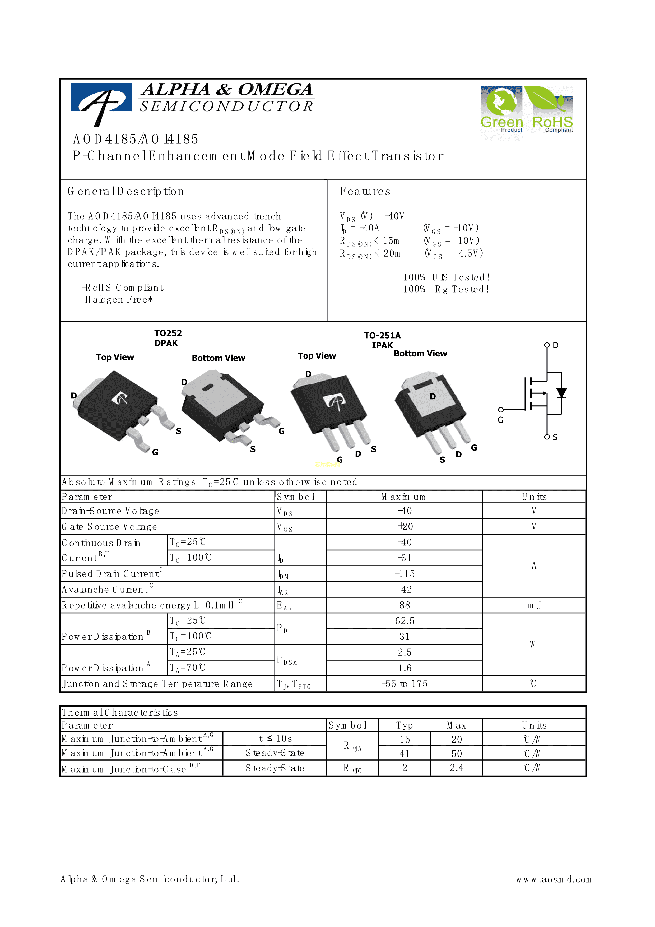 AOD4185数据手册TO-252-3封装AOSPDF规格书,中英文下载