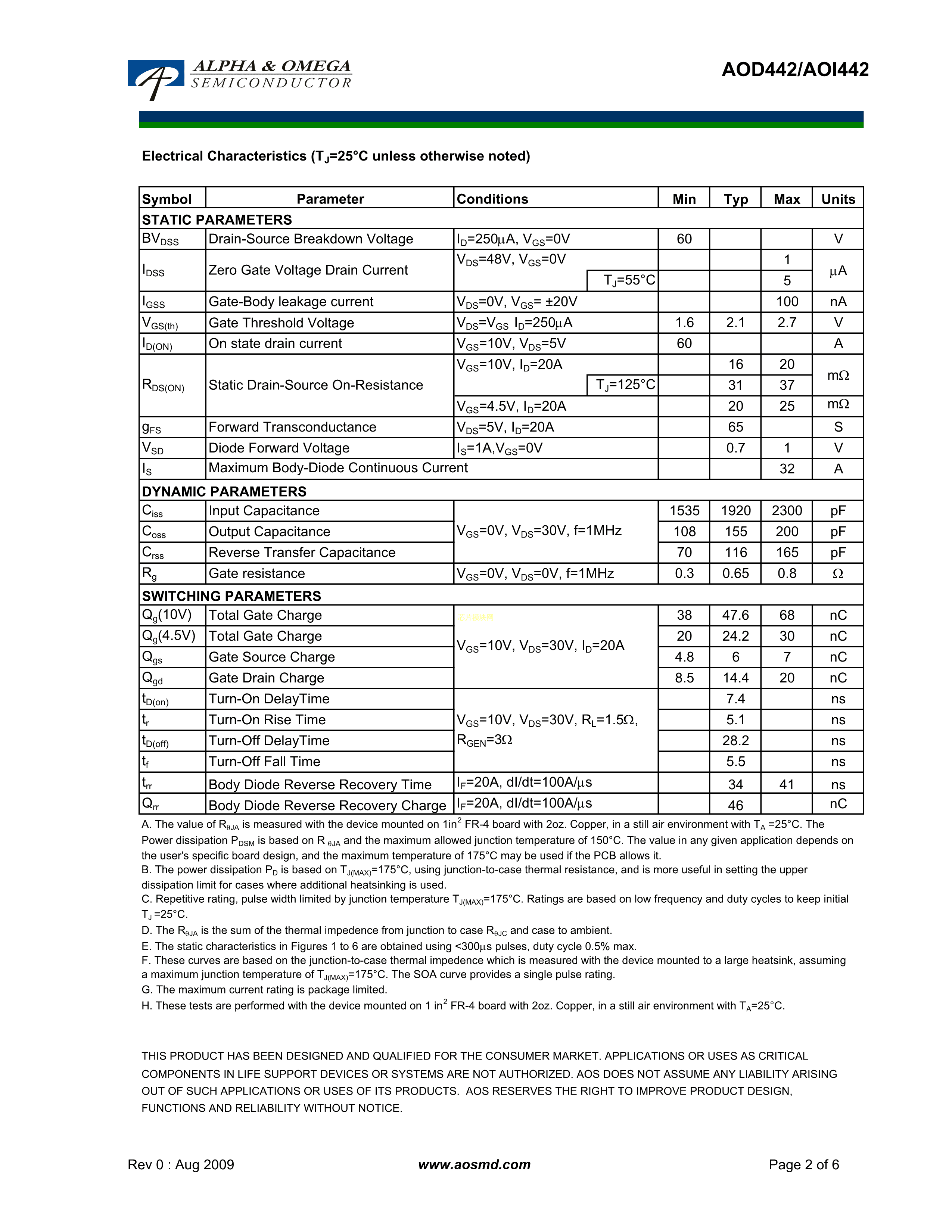 AOD442数据手册TO-252-2(DPAK)封装AOSPDF规格书,中英文下载