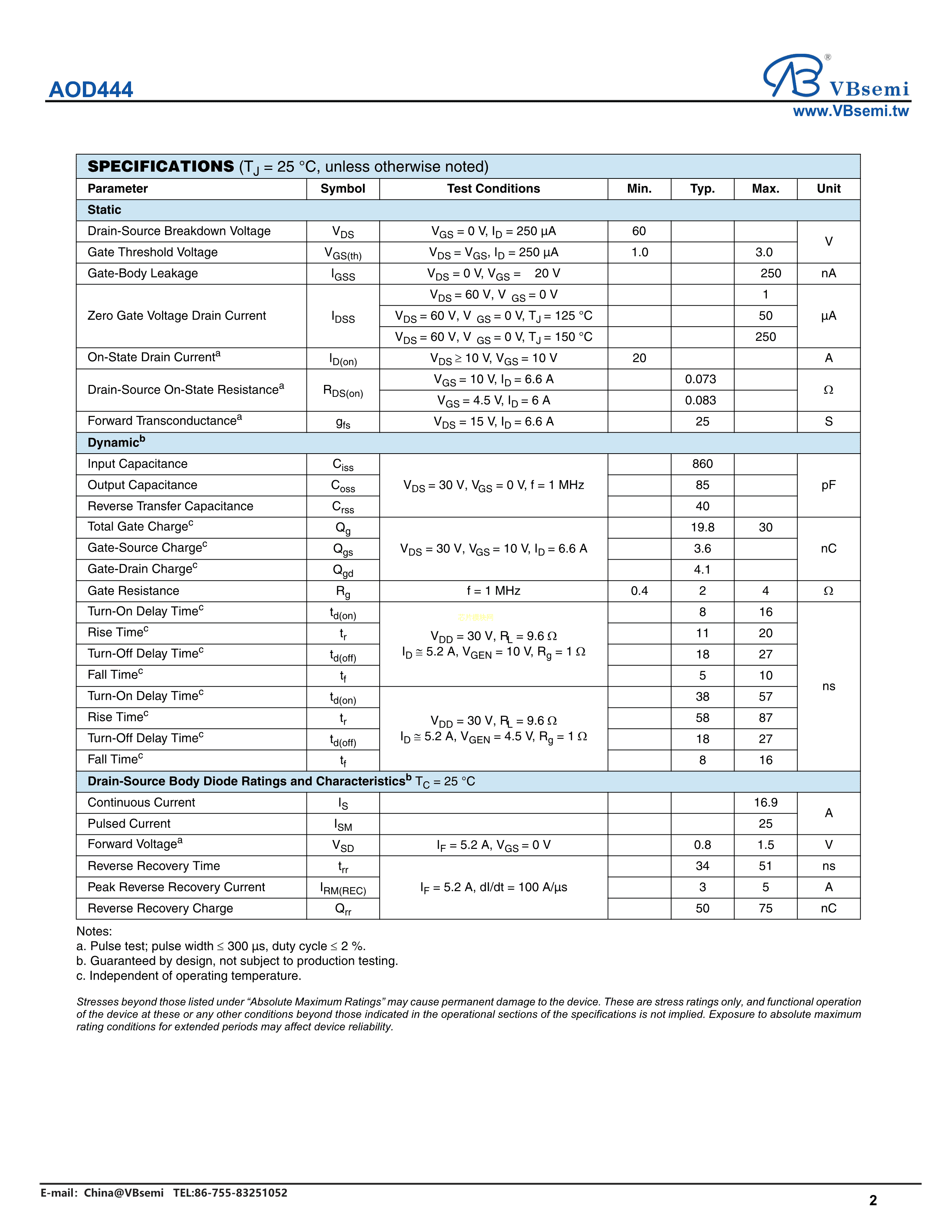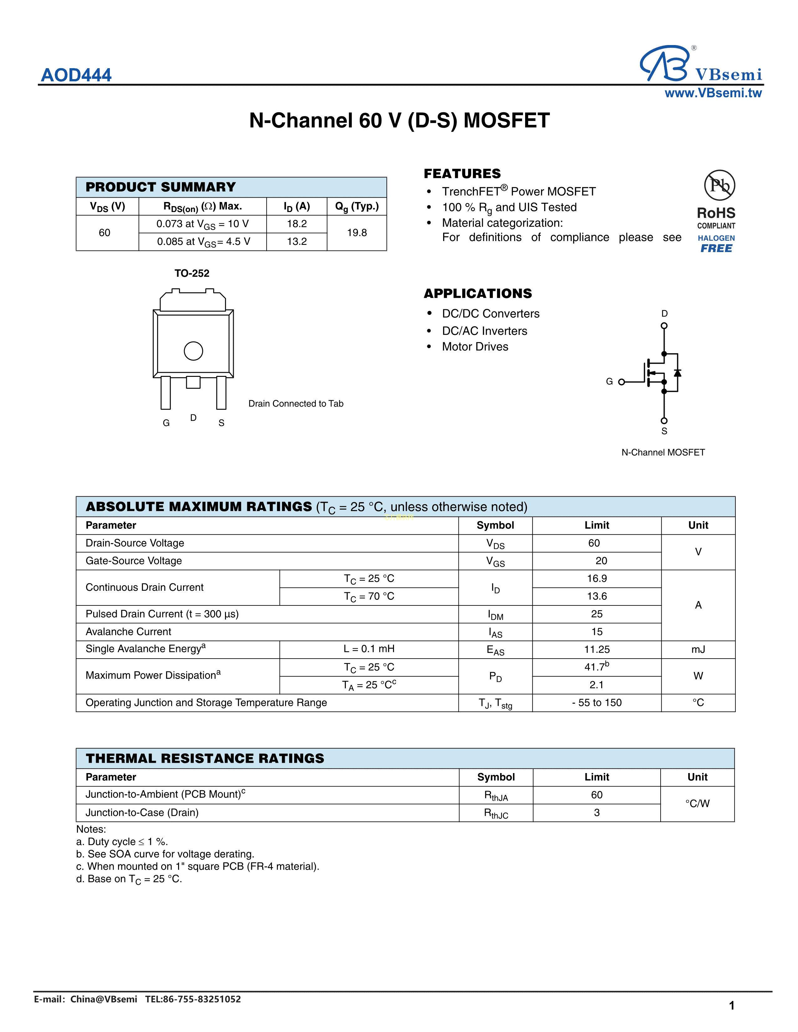 AOD444数据手册TO-252封装VBsemi(台湾微碧)PDF规格书,中英文下载