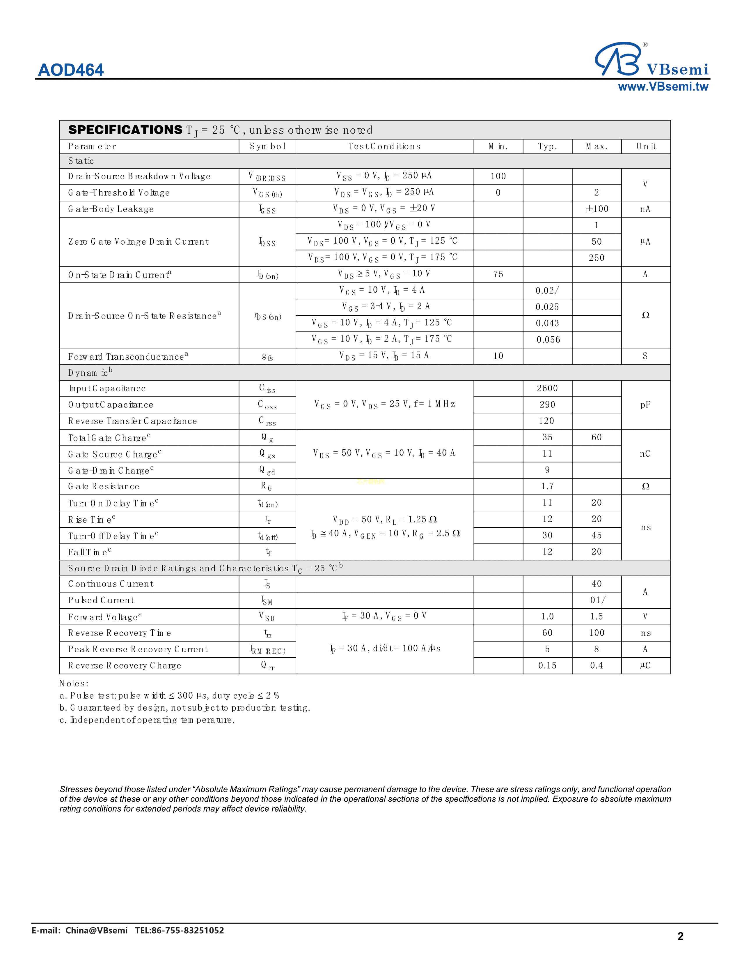 AOD464数据手册TO-252封装VBsemi(台湾微碧)PDF规格书,中英文下载