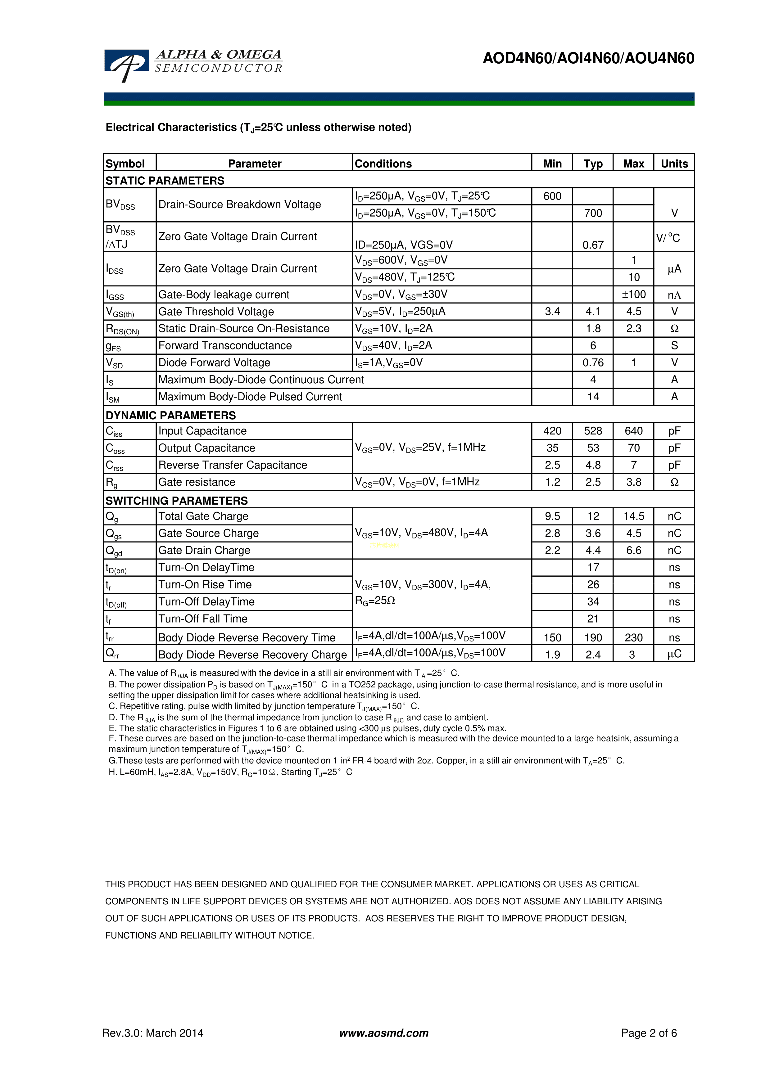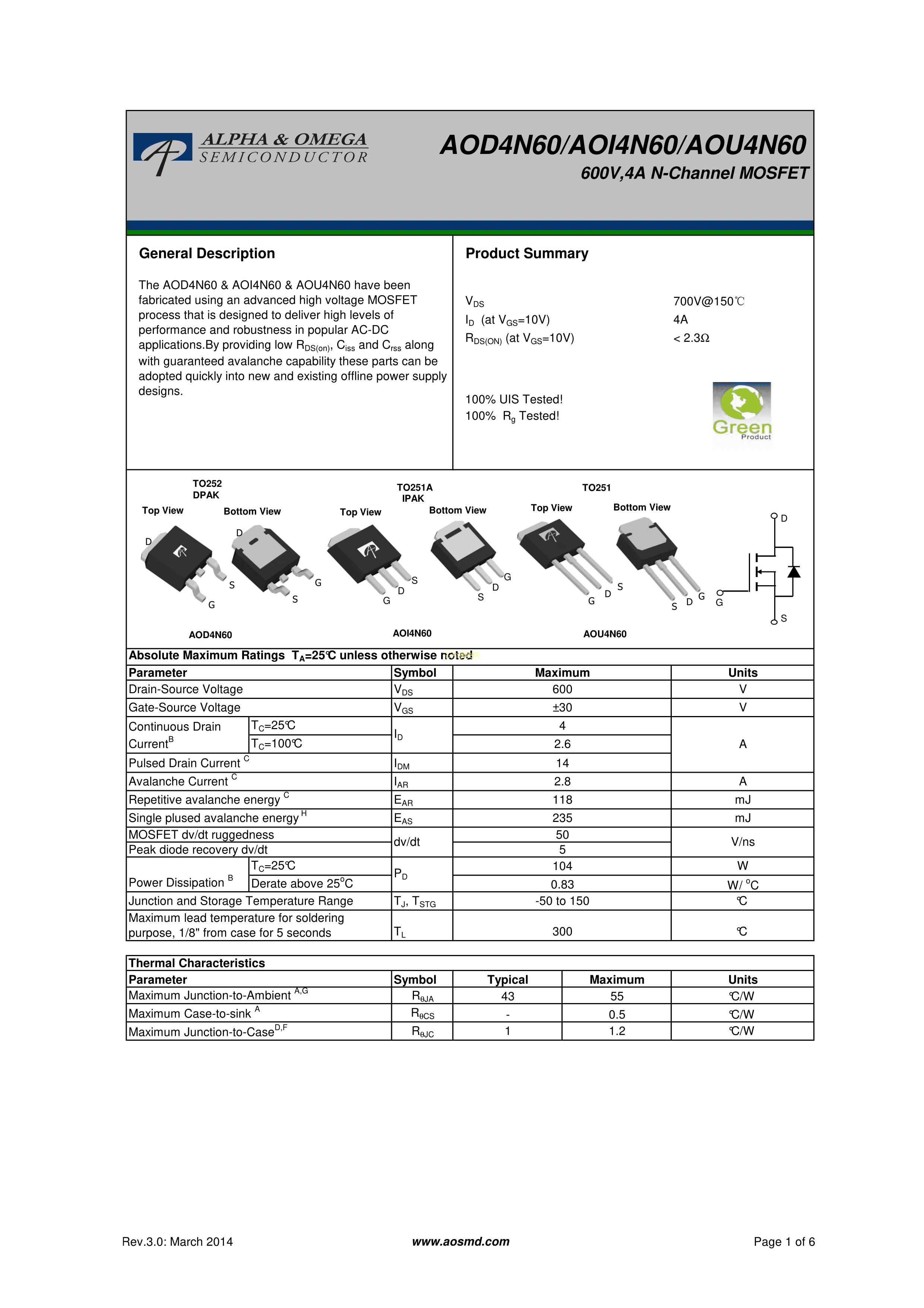 AOD4N60PDF规格书,中英文下载
