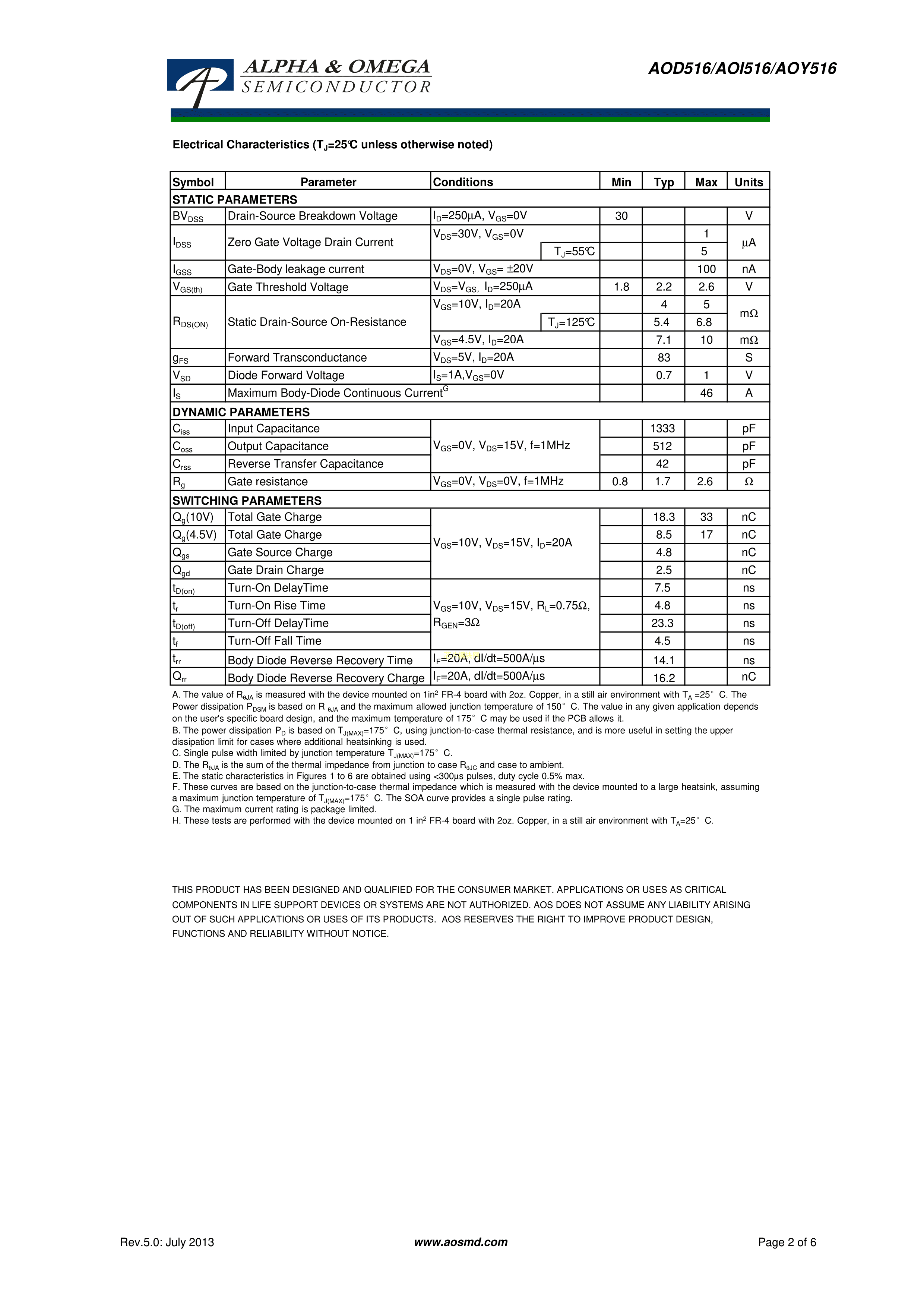 AOD516数据手册TO-252-2(DPAK)封装AOSPDF规格书,中英文下载