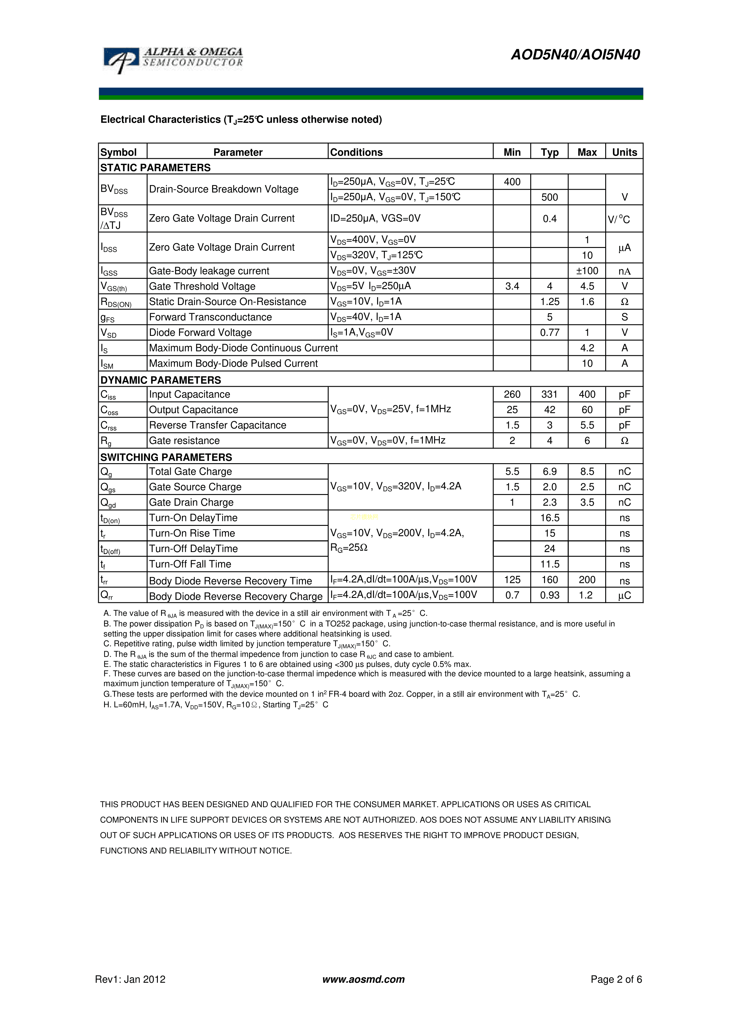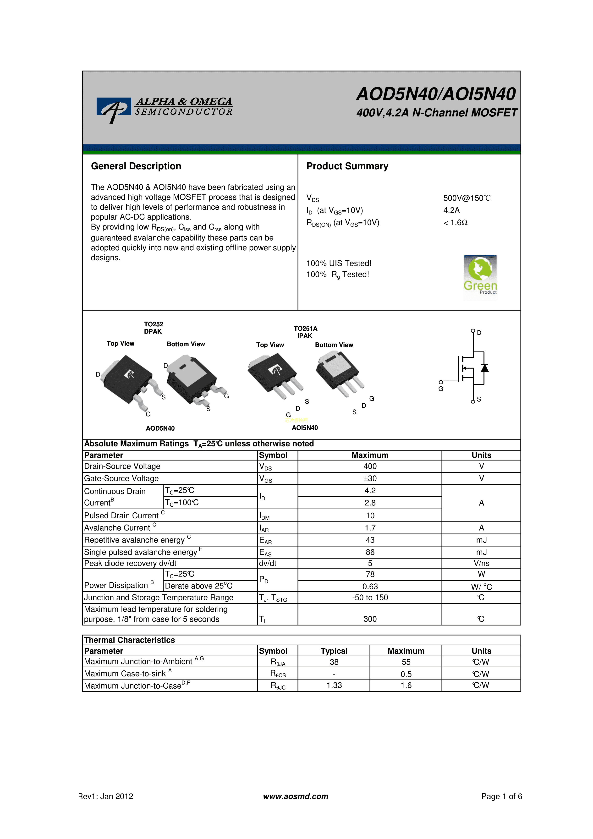 AOD5N40PDF规格书,中英文下载
