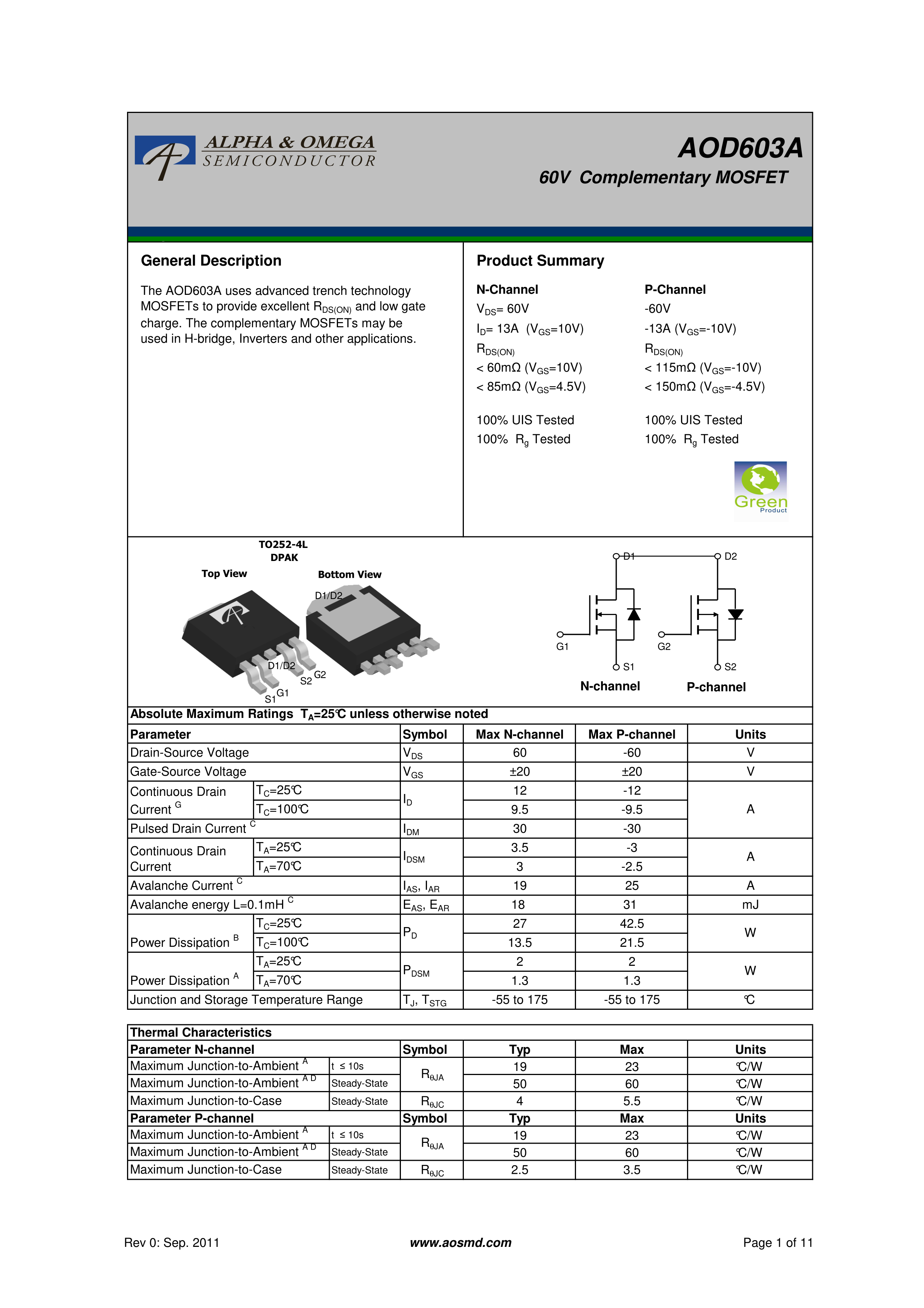 AOD603A数据手册TO-252-4L封装AOSPDF规格书,中英文下载