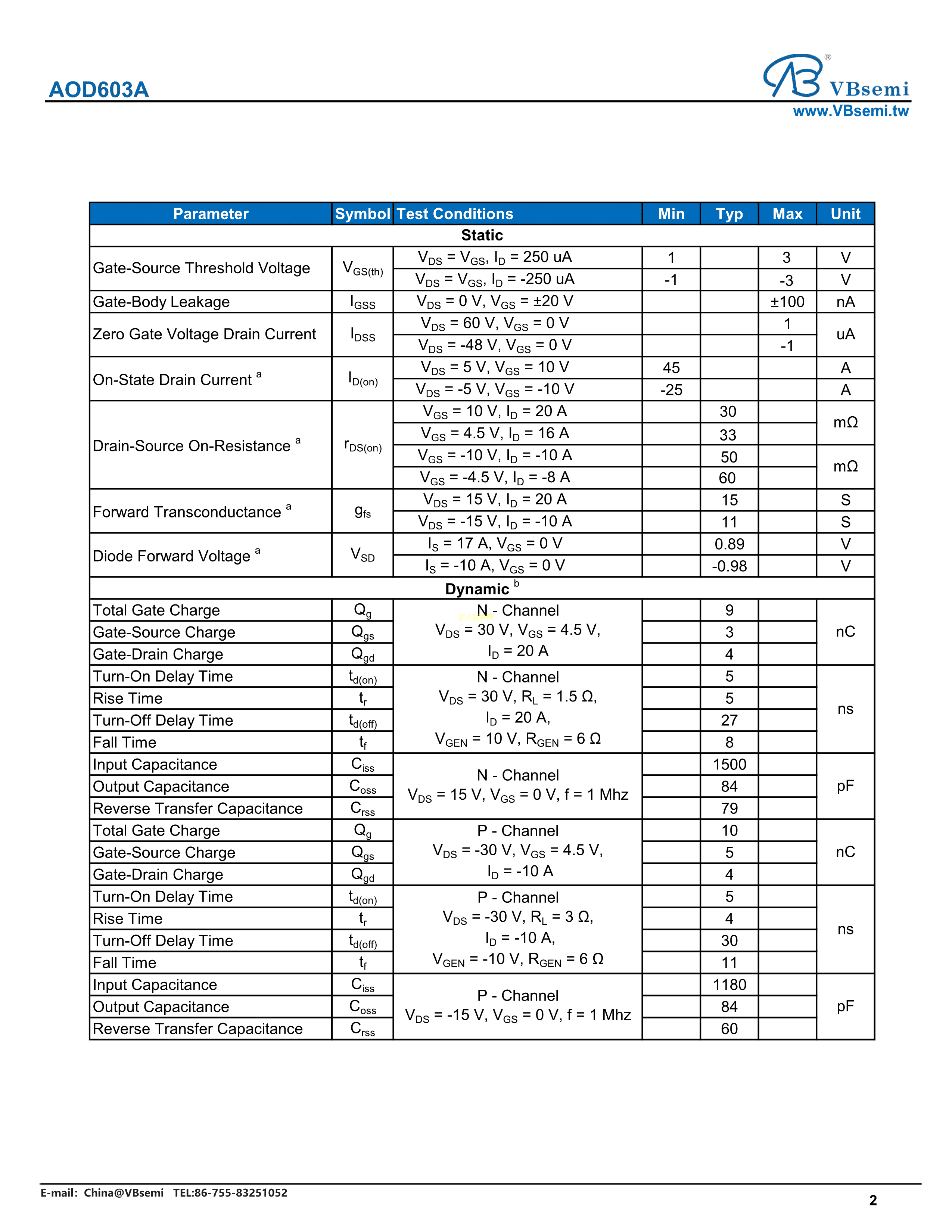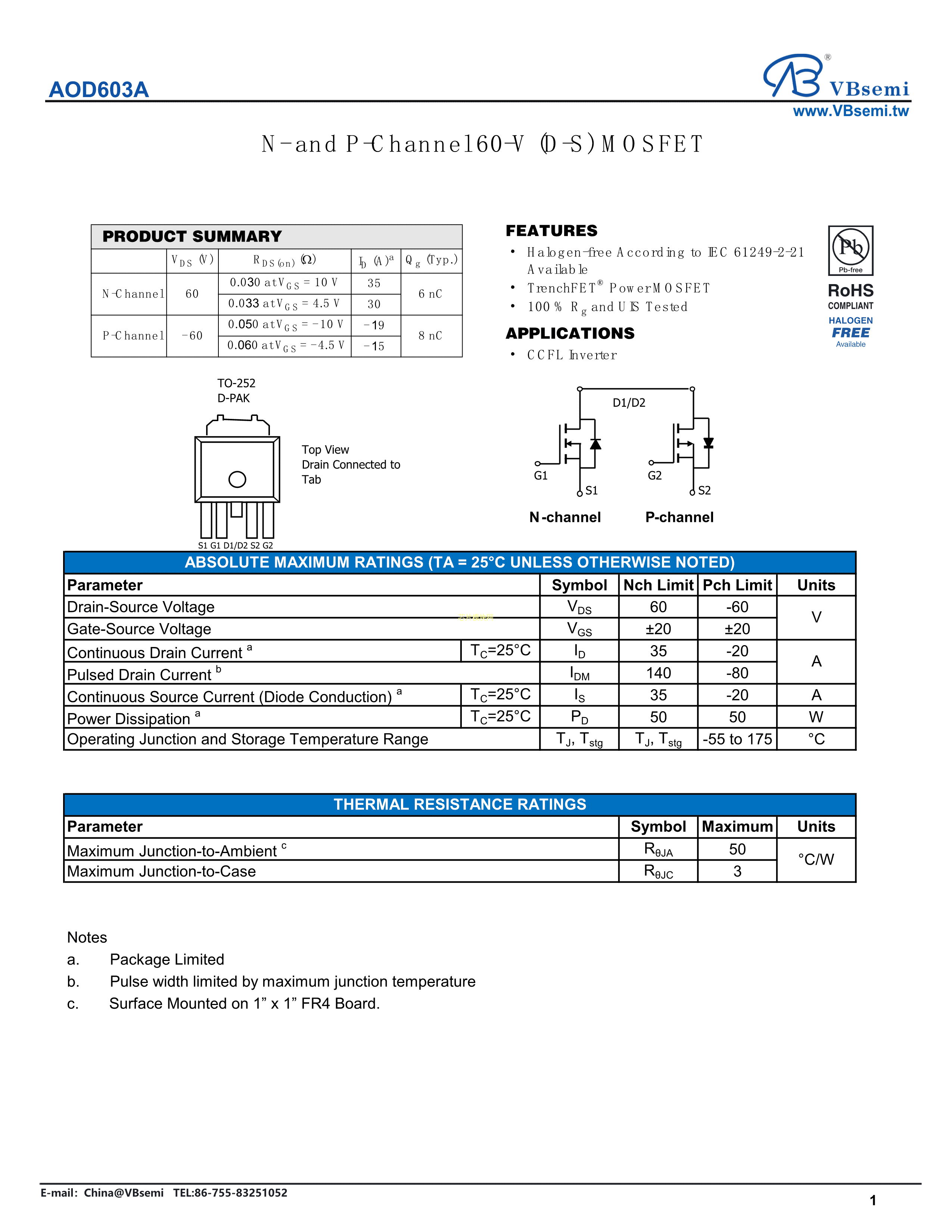 AOD603A数据手册TO-252-5封装VBsemi(台湾微碧)PDF规格书,中英文下载